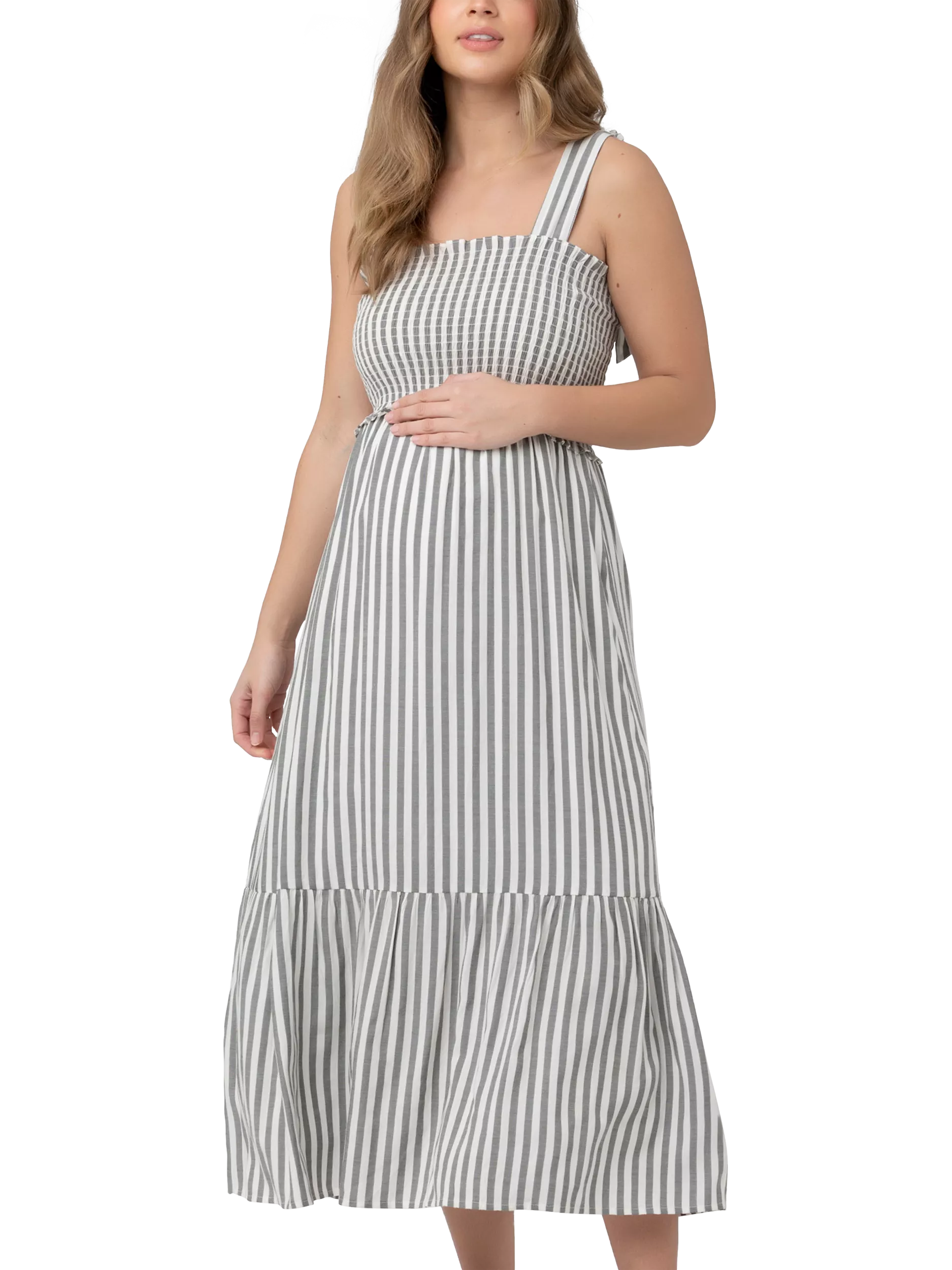 Consider yourself a stripes lover? Then the Ollie Smocked Maternity Dress from Ripe is a must-have. Created with a smocked bodice, shoulder ties and gathered skirt with frill, you'll be stylish and comfortable wherever you go this season.
