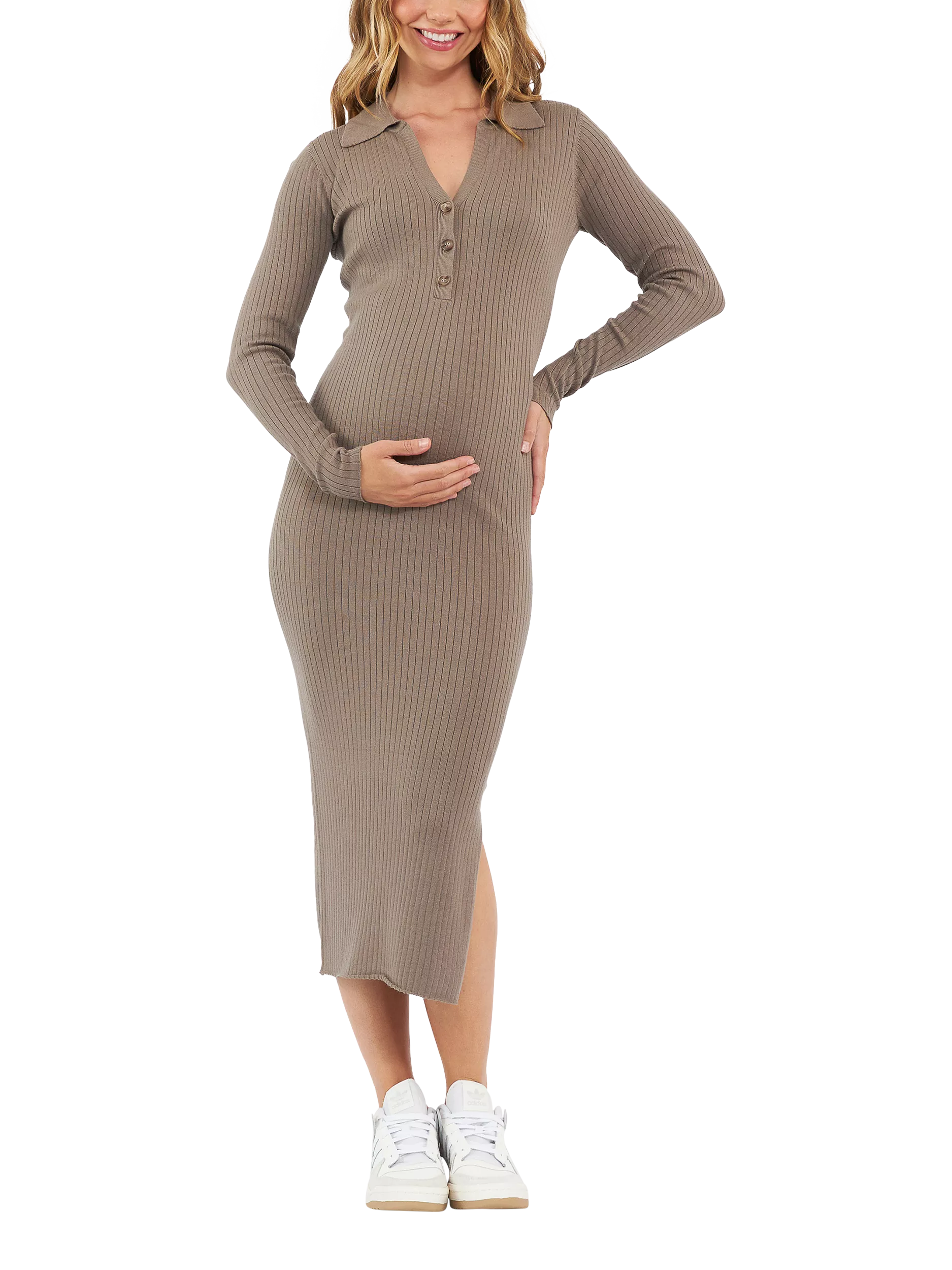 Add the Sammy Knit Polo Dress to your wardrobe today and you'll never have to stress about what to wear. We love how flattering the bodycon silhouette is for any occasion, during pregnancy and beyond. The button down neckline not only looks great but will also come in handy for nursing when your baby arrives.