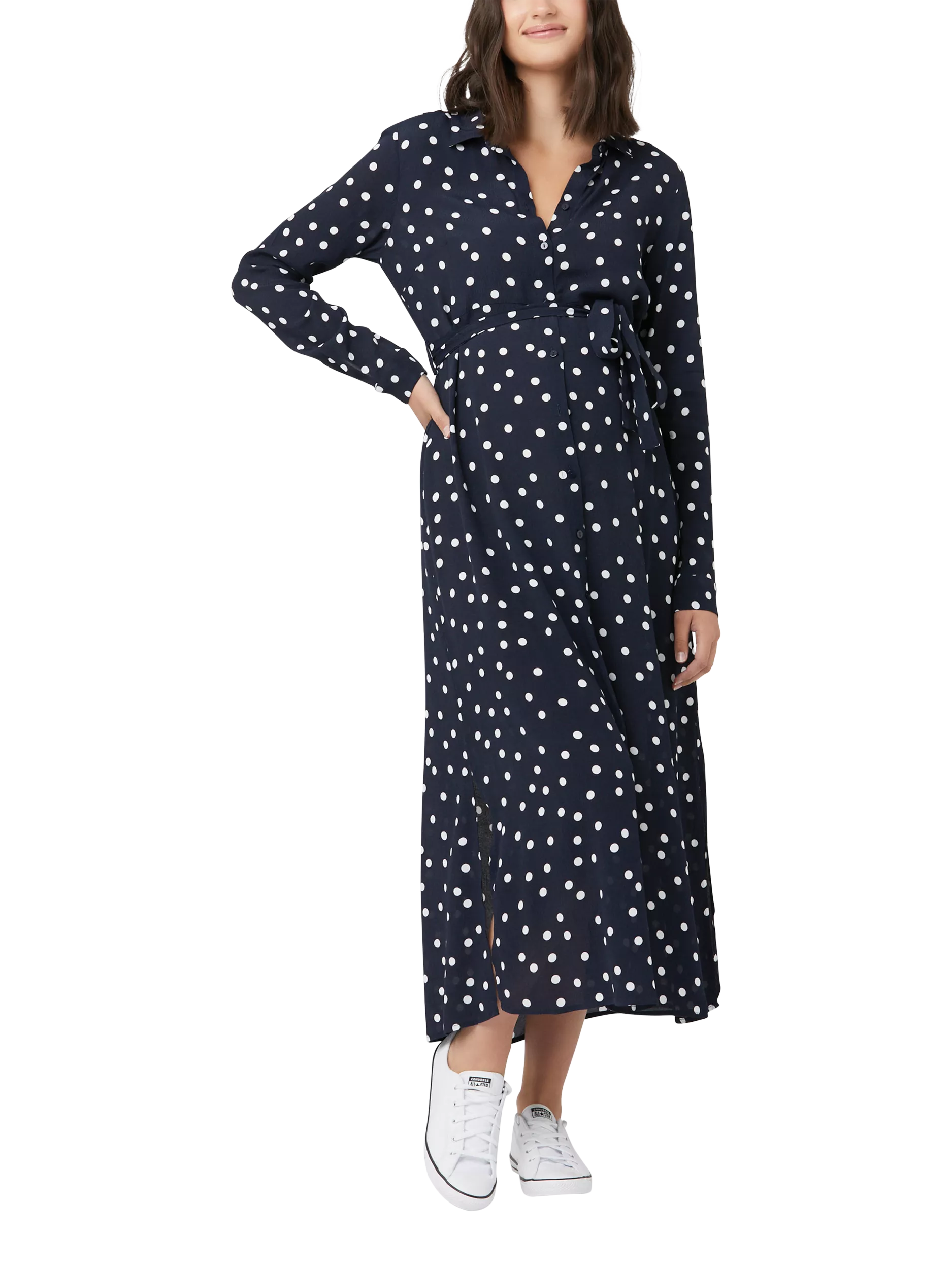 Look no further than our Spot Shirt Dress for a classic look all year round. Made from printed viscose with long sleeves, an a-line skirt and removable tie, you will also find the button up front allows easy nursing access when your little one arrives.
