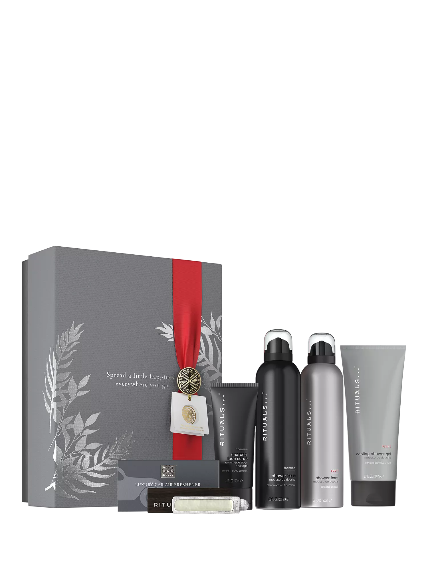 Contains two shower foams, a cooling shower gel, a facial scrub with charcoal and a car perfume.