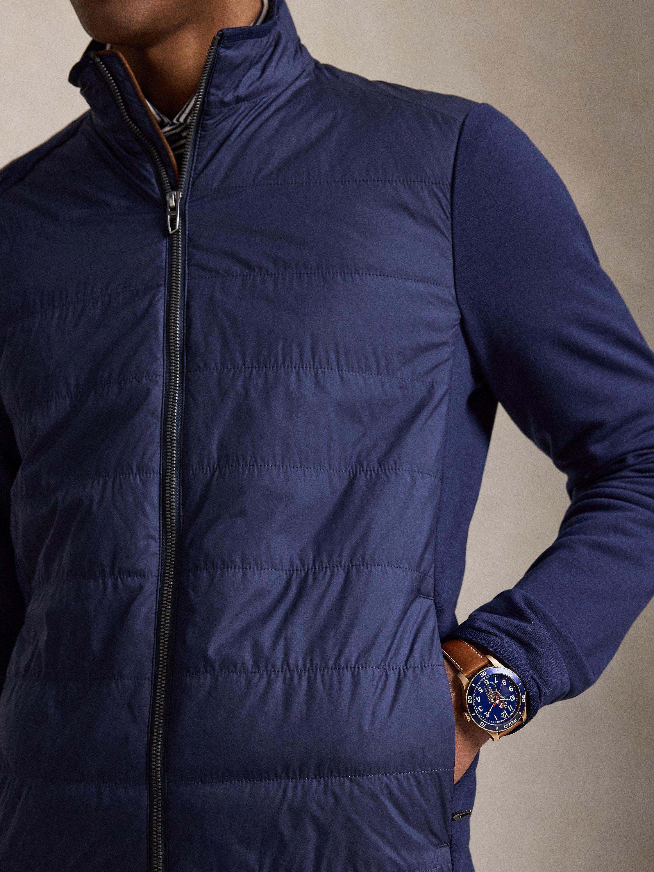 This performance-inspired design features a high neckline, knitted sleeves that offer up a welcome contrast and a convenient zip-fastened front for versatile styling.