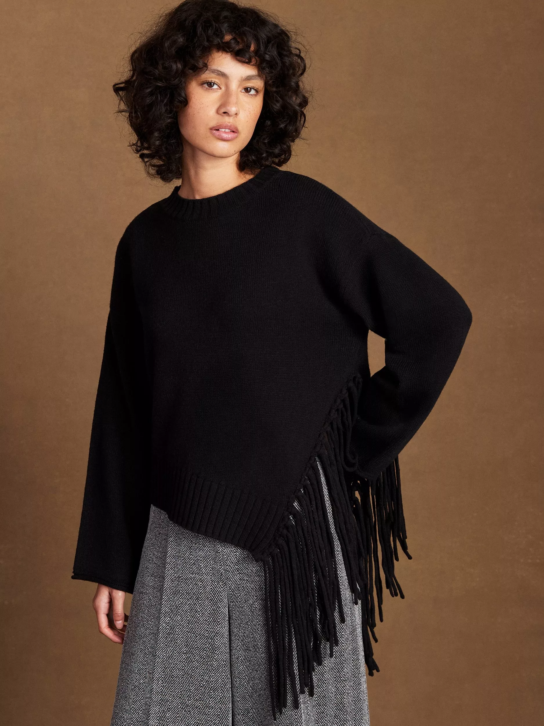 This Ro&Zo jumper brings comfort and warmth with its soft wool blend and medium weight. The crew neck and long sleeves offer relaxed style, while side fringing adds a stylish touch. Perfect for layering or making a smart impression wherever you go.