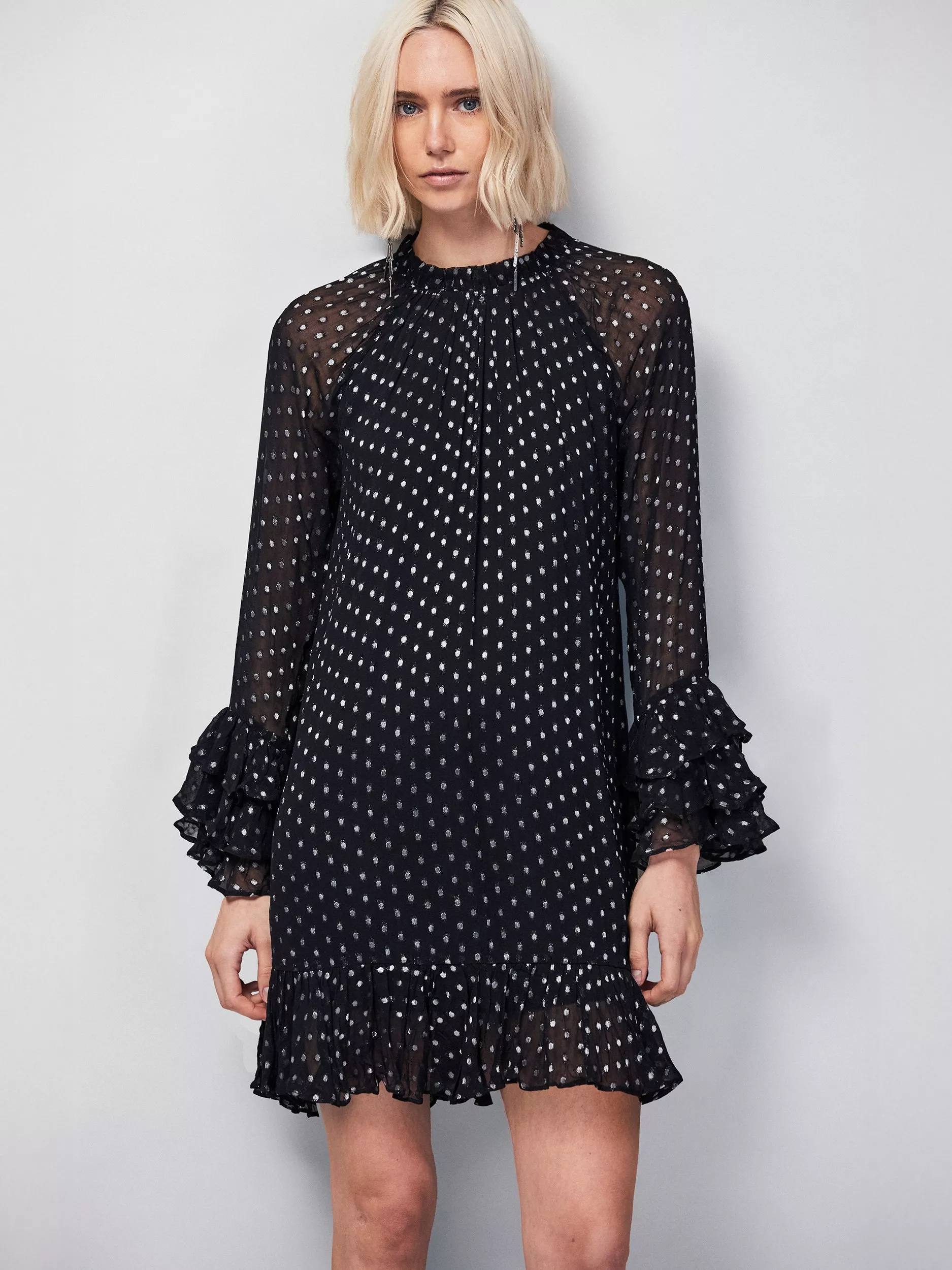 A playful mini dress from Ro&Zo, designed with ruffles and shimmer. The A-line cut and foiled polka dot pattern add a clever twist to your day or party style. Simply button up and enjoy.