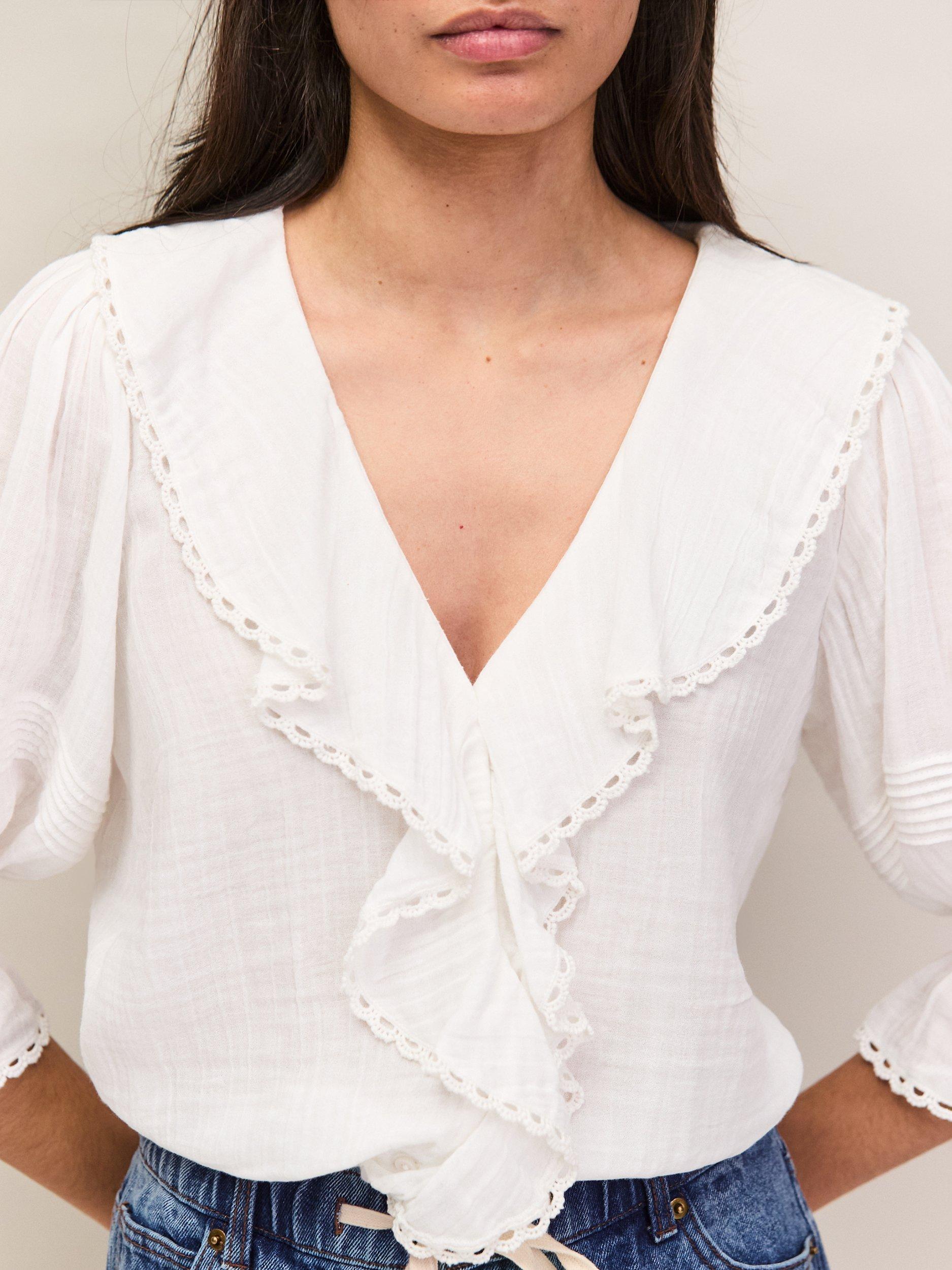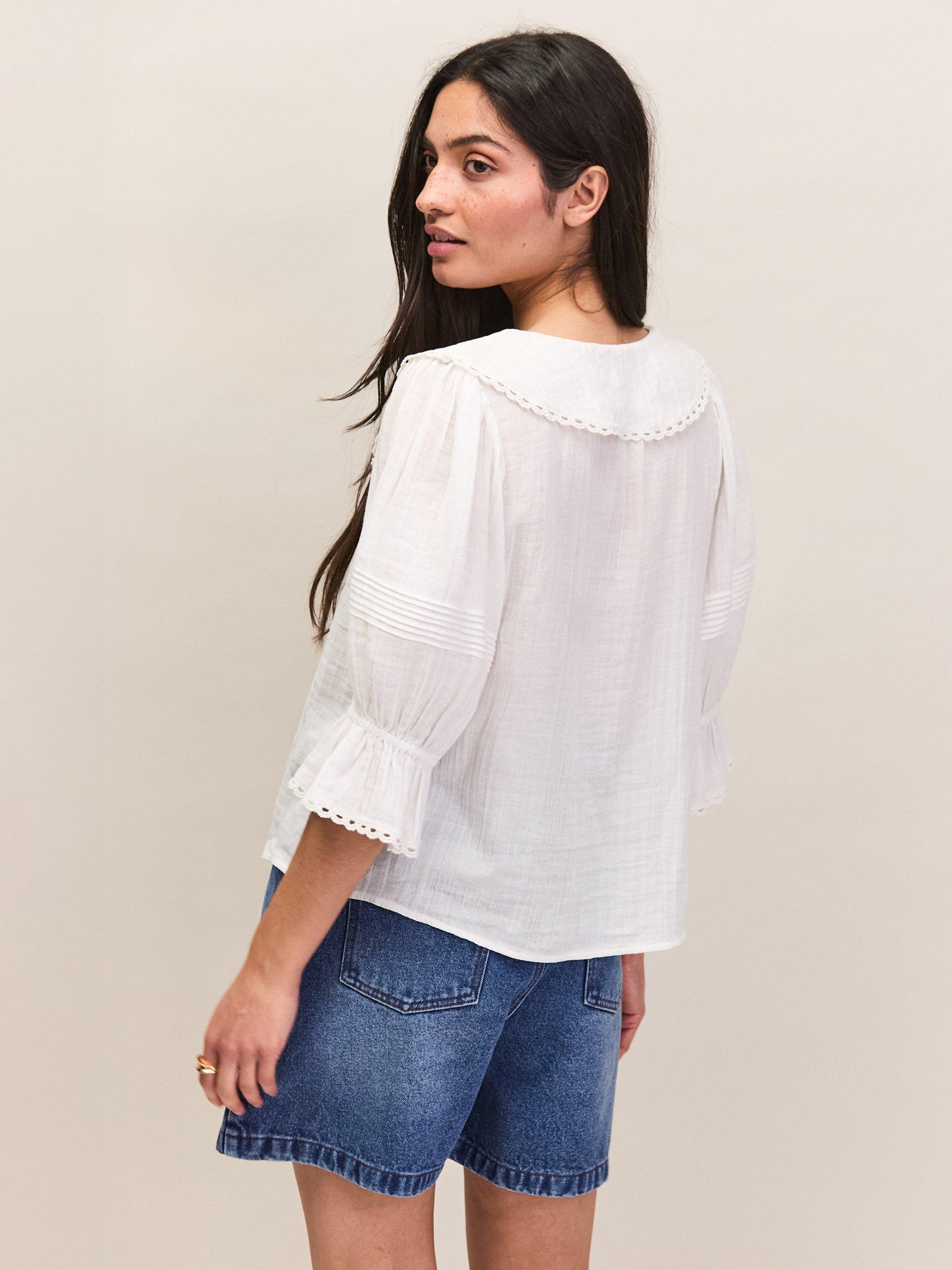 A crisp cotton cheesecloth blouse featuring three-quarter sleeves and a sharp V-neck, designed to layer seamlessly or stand alone through changing seasons.