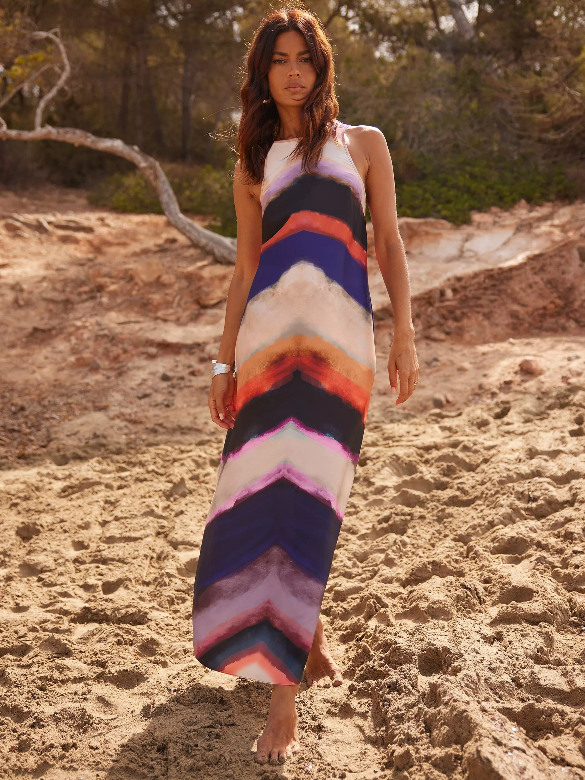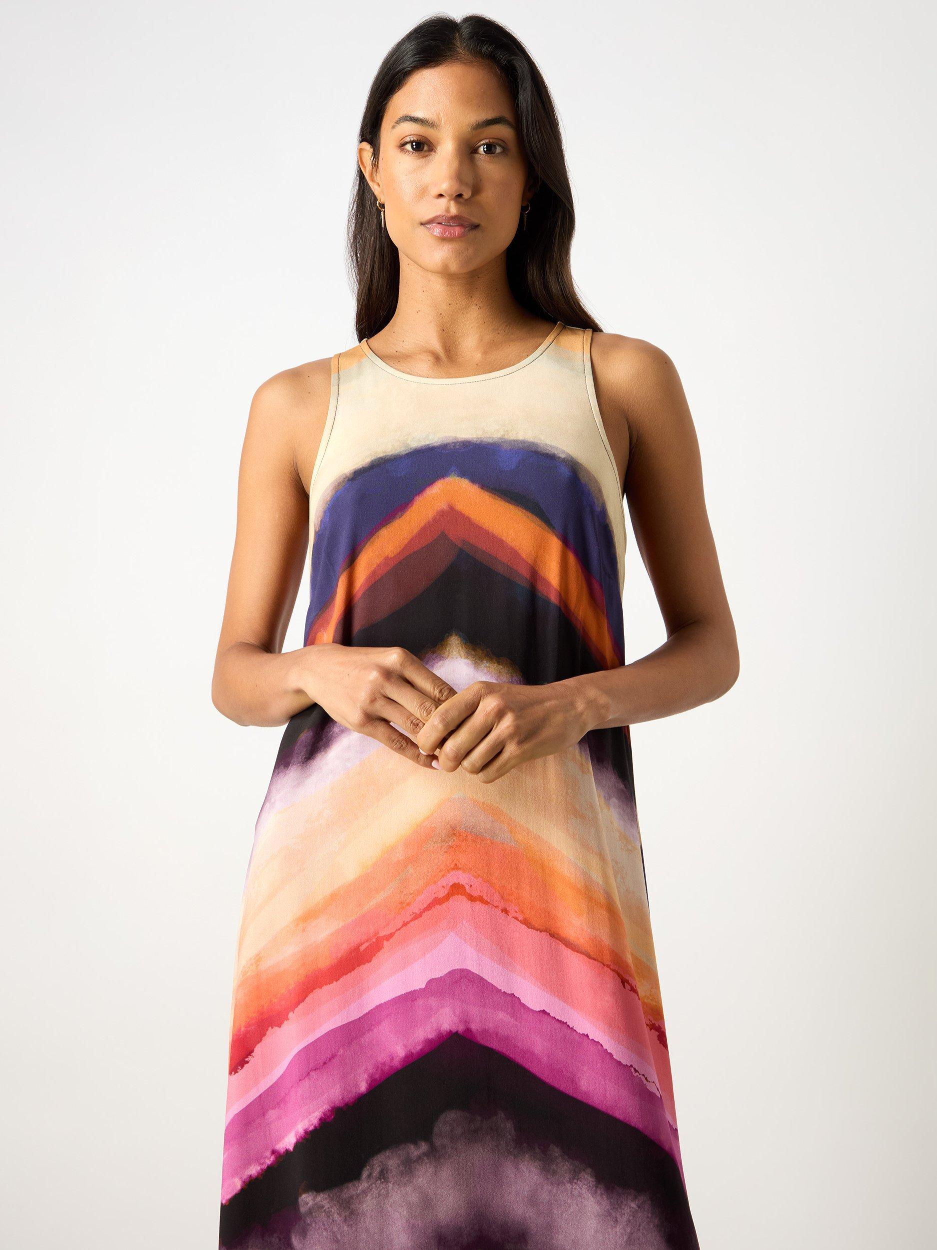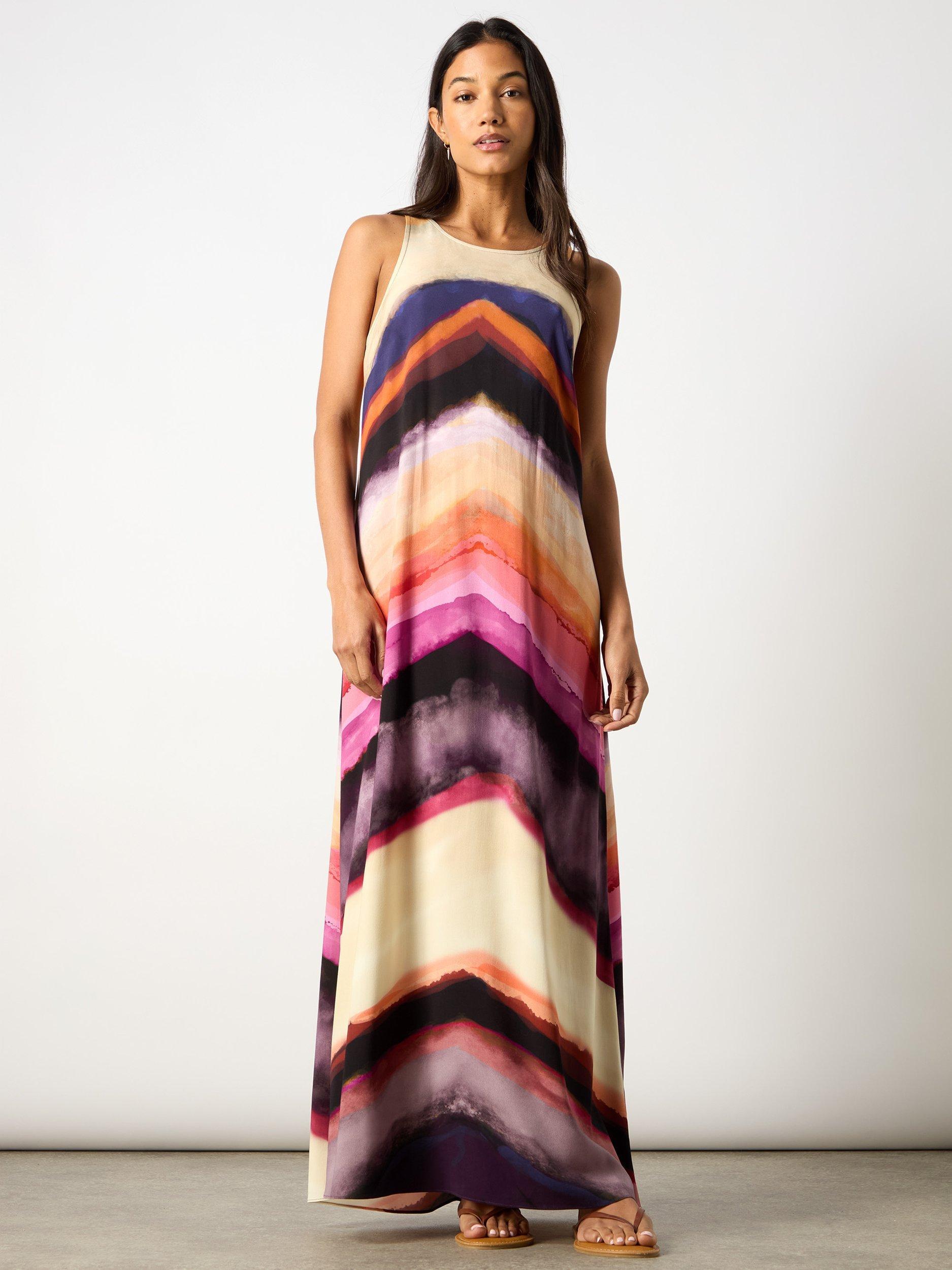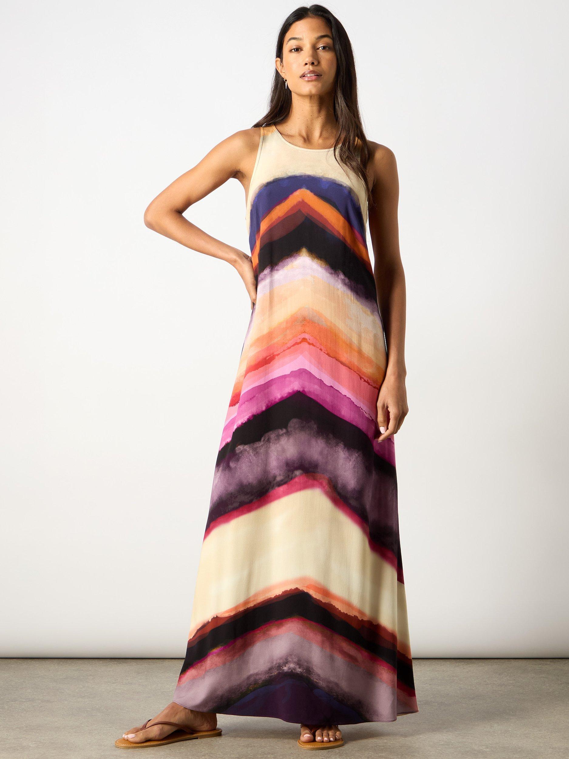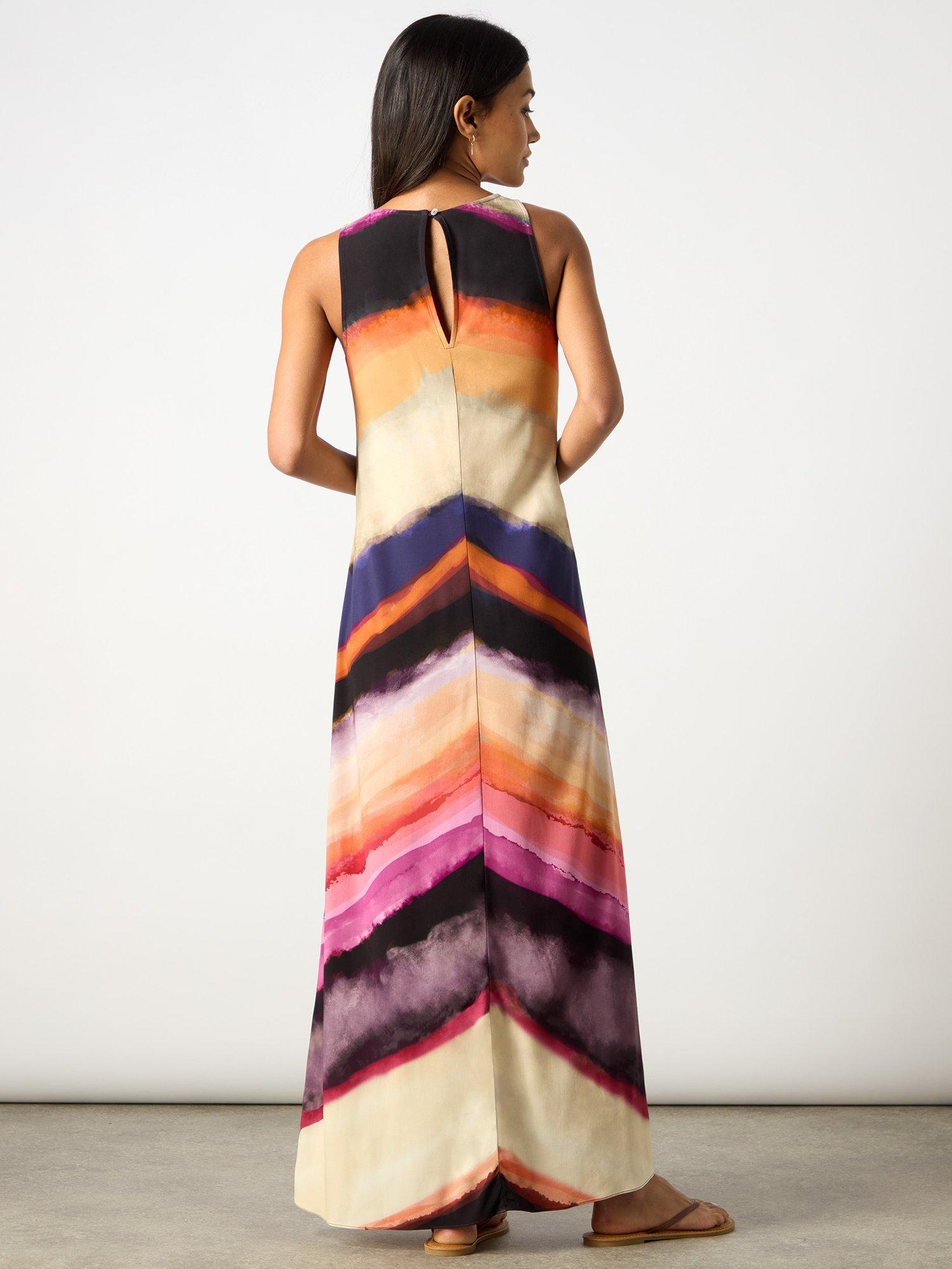 Designed to capture attention wherever you are, the Chevron Stripe Print Dress is a must-have for weddings, dinners, or any special occasion this season. This column-style dress features a dynamic and energising pattern, adding dimension to the dress. The variety of colours gives it versatility, allowing it to be worn for casual daytime outings or dressed up for evening events.