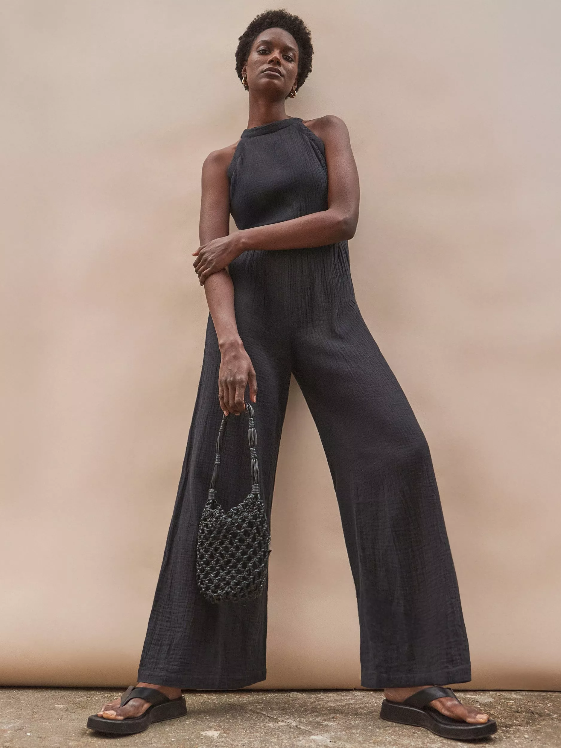 With a neat halter neck, this sleeveless jumpsuit from Ro&Zo is shaped to a billowy wide-leg silhouette and offers light, airy wear thanks to its pure cotton composition. Minimalist in design, this piece will have you floating around this summer with ease.