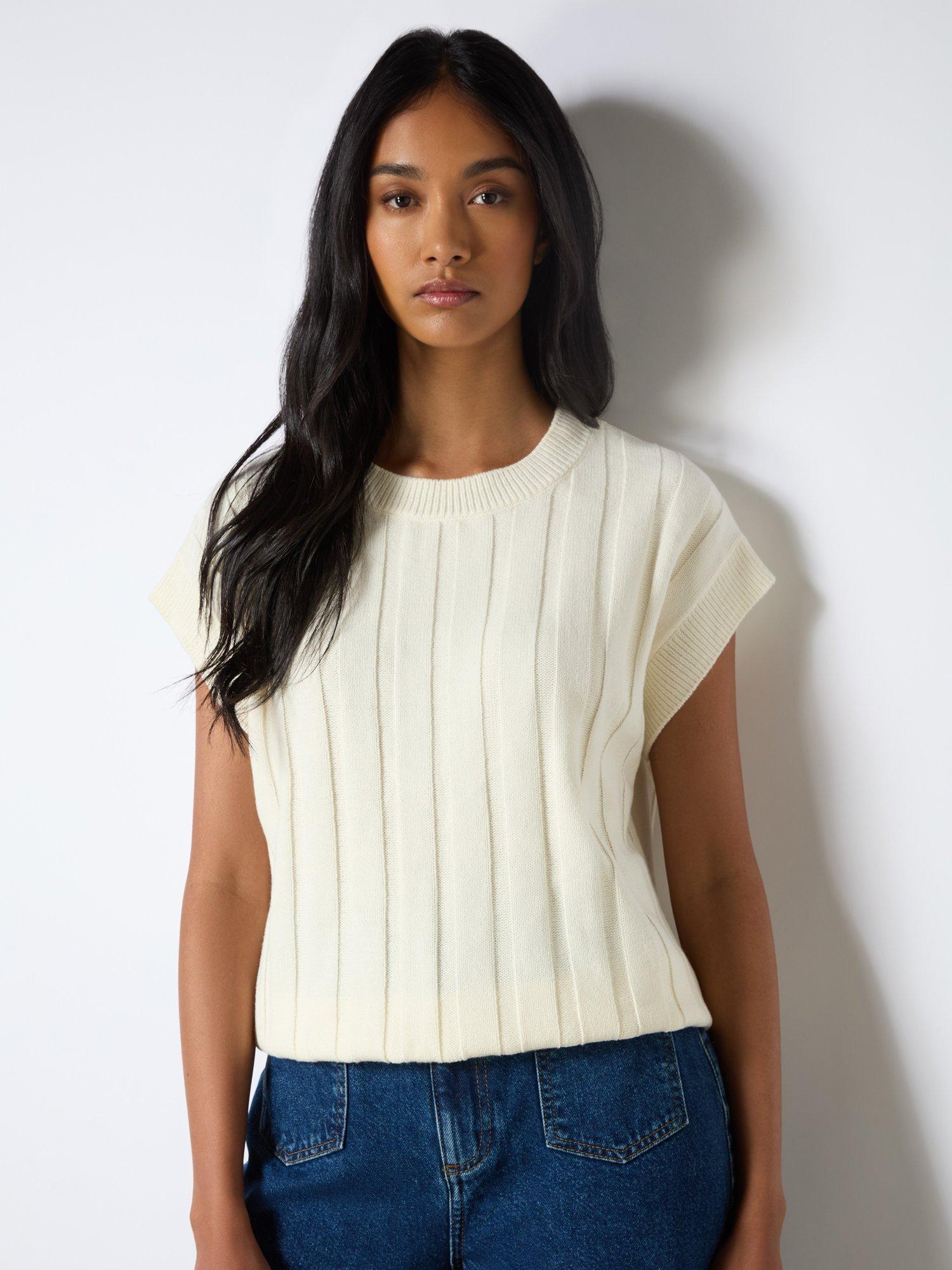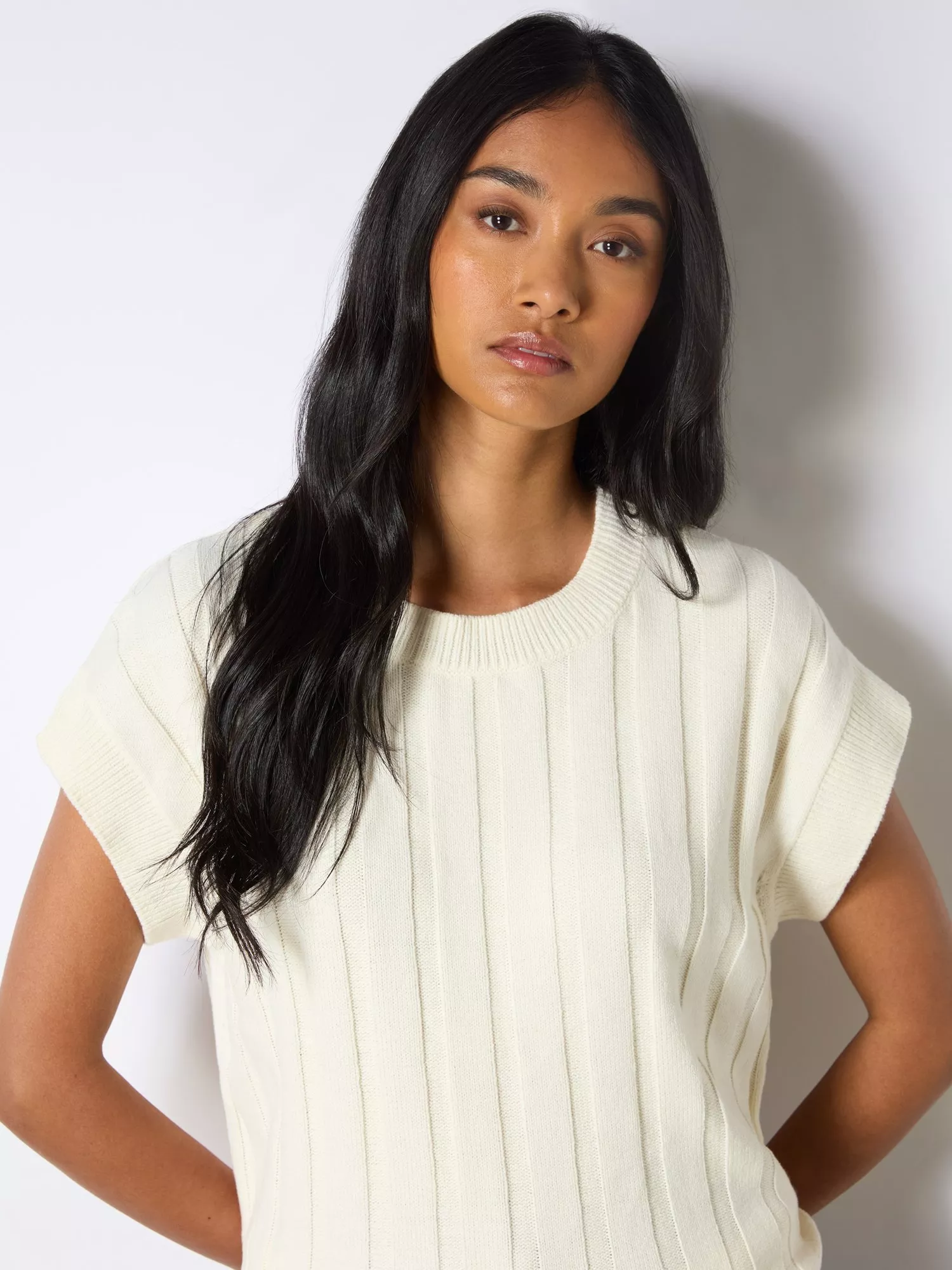Our Cream Ribbed Knit Vest features a relaxed, boxy fit crafted from a cotton blend yarn with wide rib detailing. Its versatile design includes a round neckline and a flattering below-waist length, perfect for layering or wearing alone. Make it casual with some denim jeans or dress it up with a stunning long-length silk skirt.