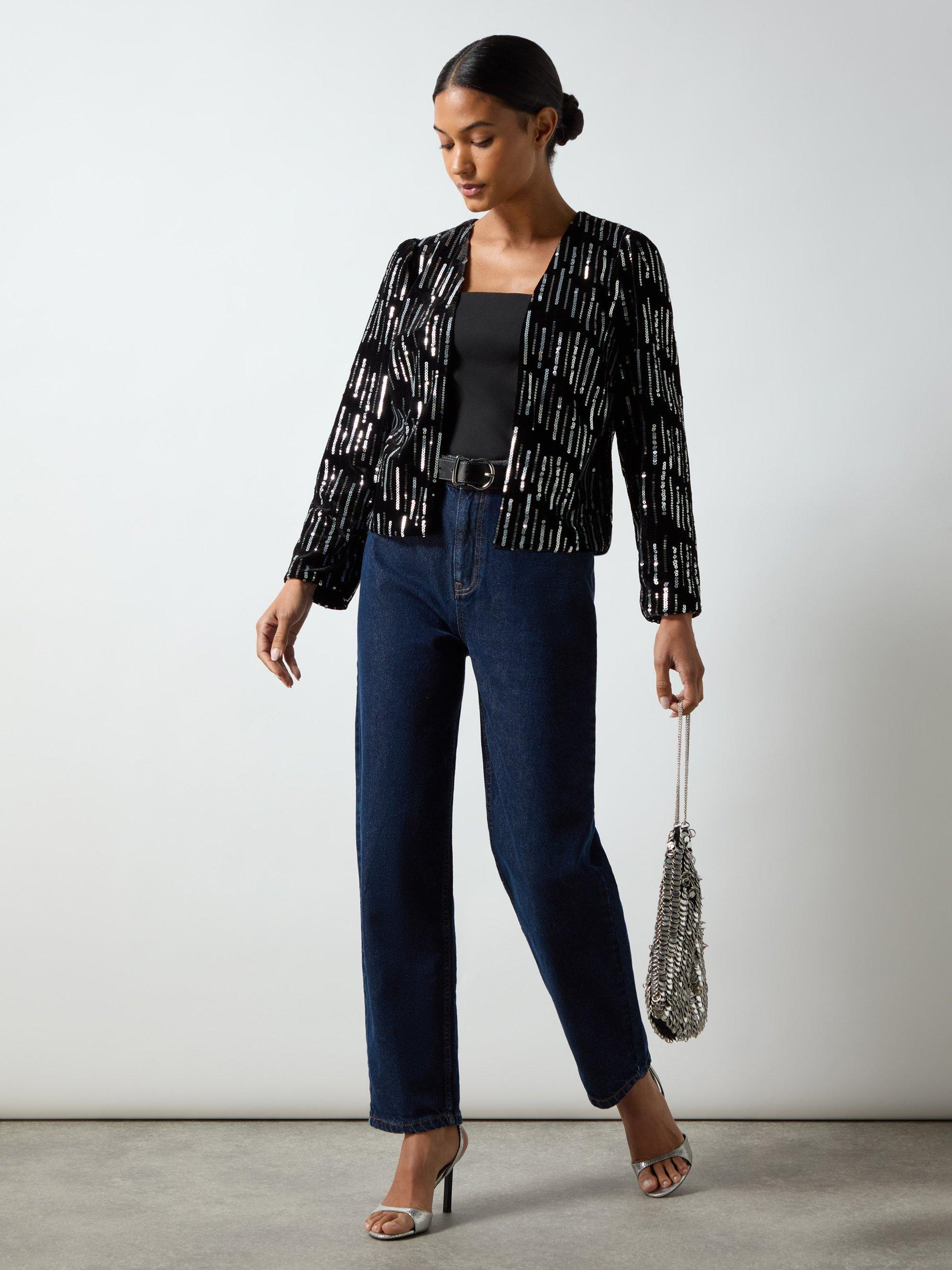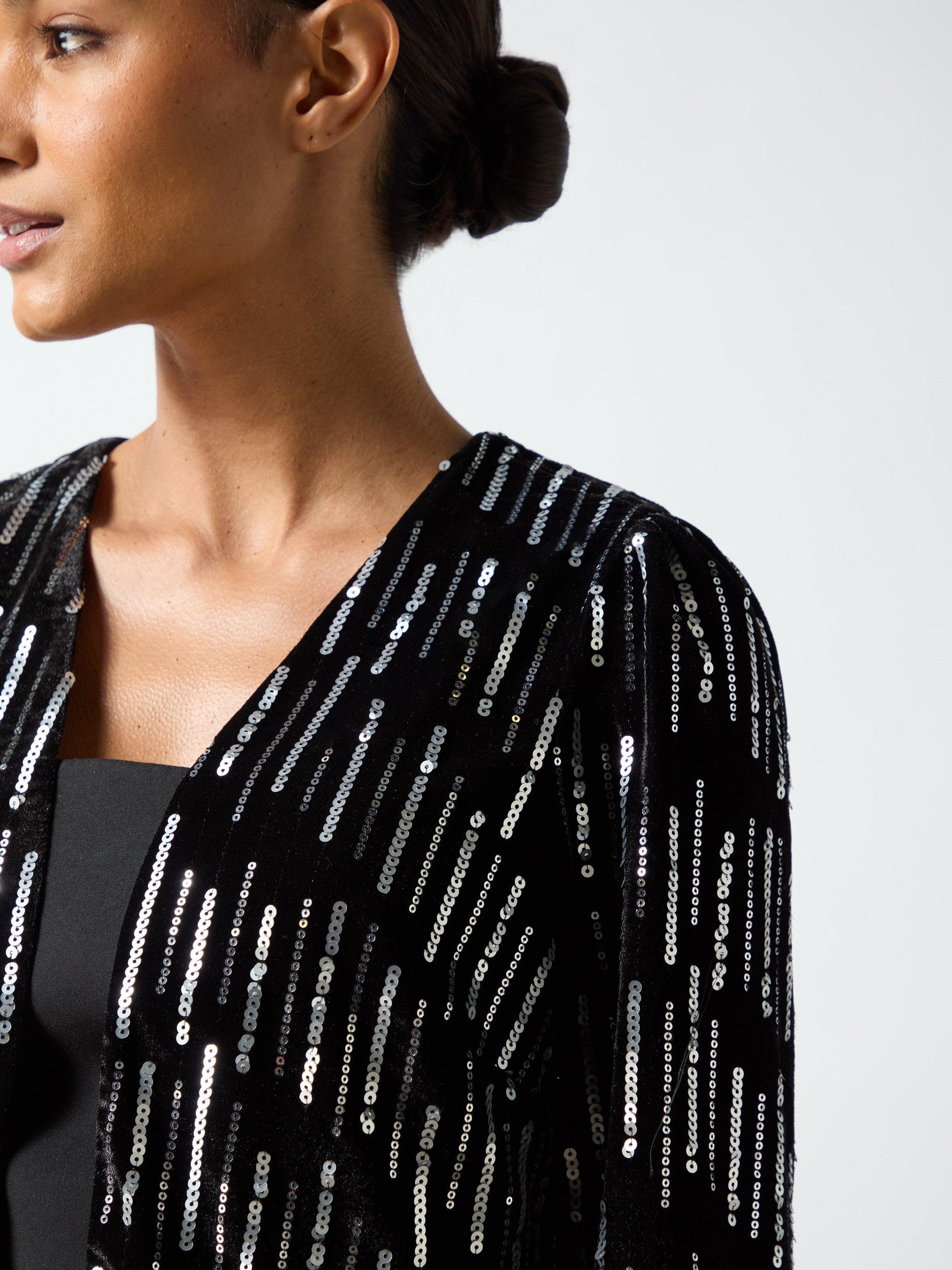 This Embellished Velvet Jacket is lined and includes small shoulder pads for shaping. It features straight sleeves with small gathers, finishing above the wrist, and is designed to waist length. This jacket exudes sophistication with its embellished velvet fabric and tailored silhouette.