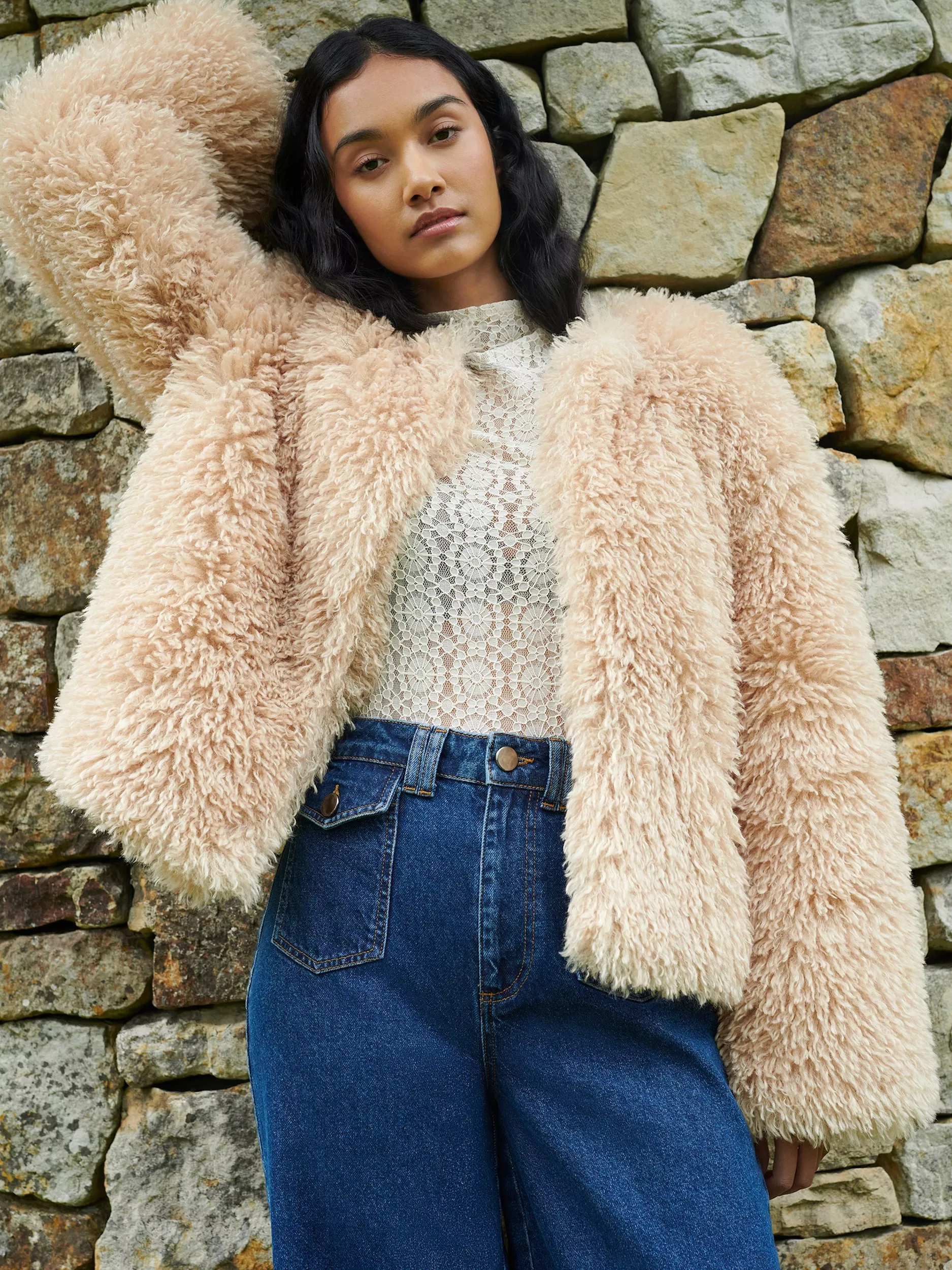 This Faux Fur Coat is fully lined and features a hook and eye fastening at the front. With its relaxed fit and below waistband length, it's versatile for dressing up or down, making it a key piece of outerwear to have in any wardrobe.