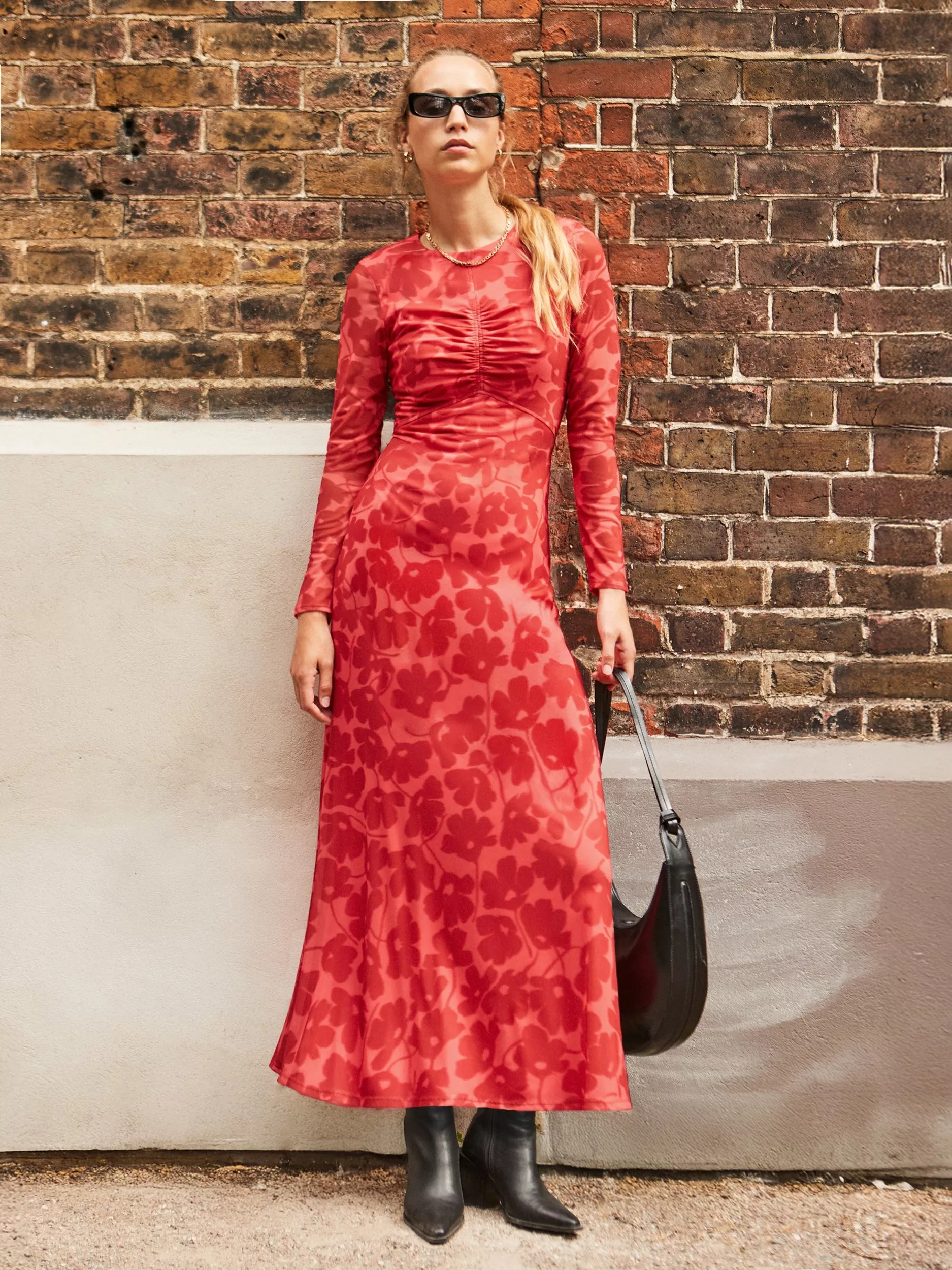 Ro&Zo’s maxi dress combines a clever ruched shape and playful floral shadow pattern for day-long comfort and standout style. Its stretch mesh fabric moves with you, while long sleeves and a round neck offer laid-back elegance.