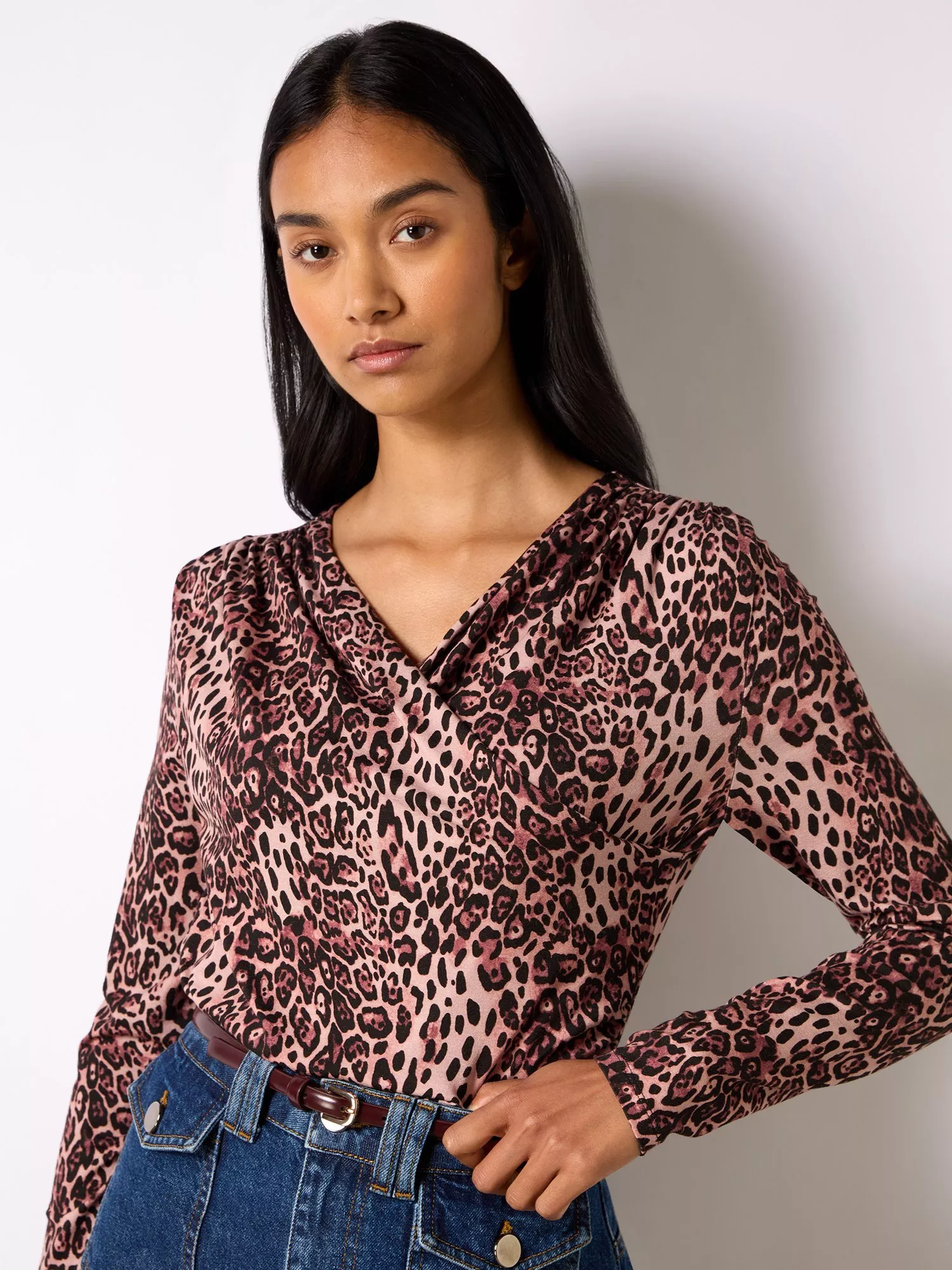 Embrace your wild side with the Leopard Print Jersey Drape Front Top, a statement piece that effortlessly combines comfort and chic style. Crafted from luxuriously soft jersey fabric, this top drapes elegantly over your silhouette, offering a flattering fit for all body types. Whether you're dressing up for a night out or adding a touch of glam to your everyday look, this top is your go-to choice.