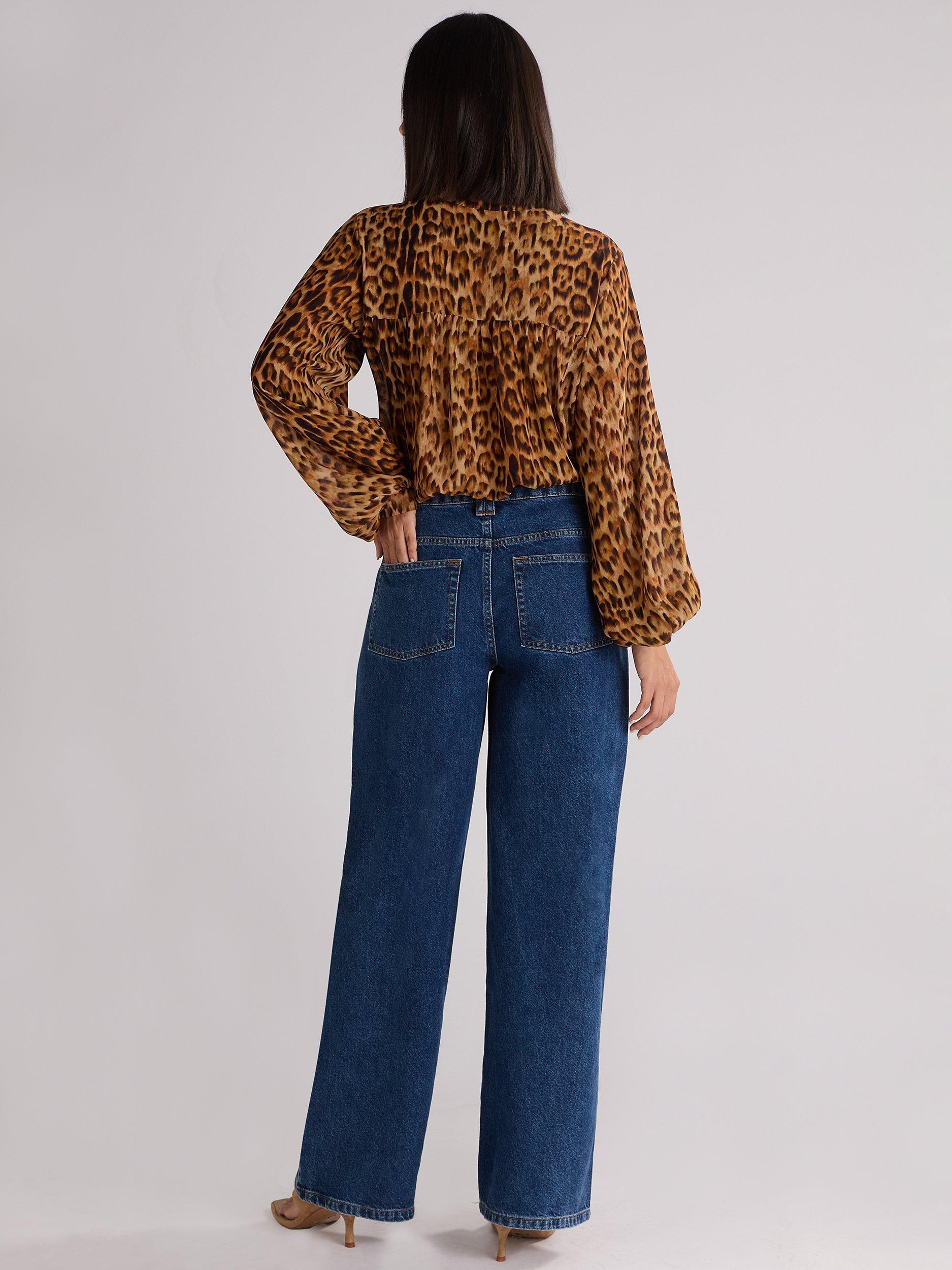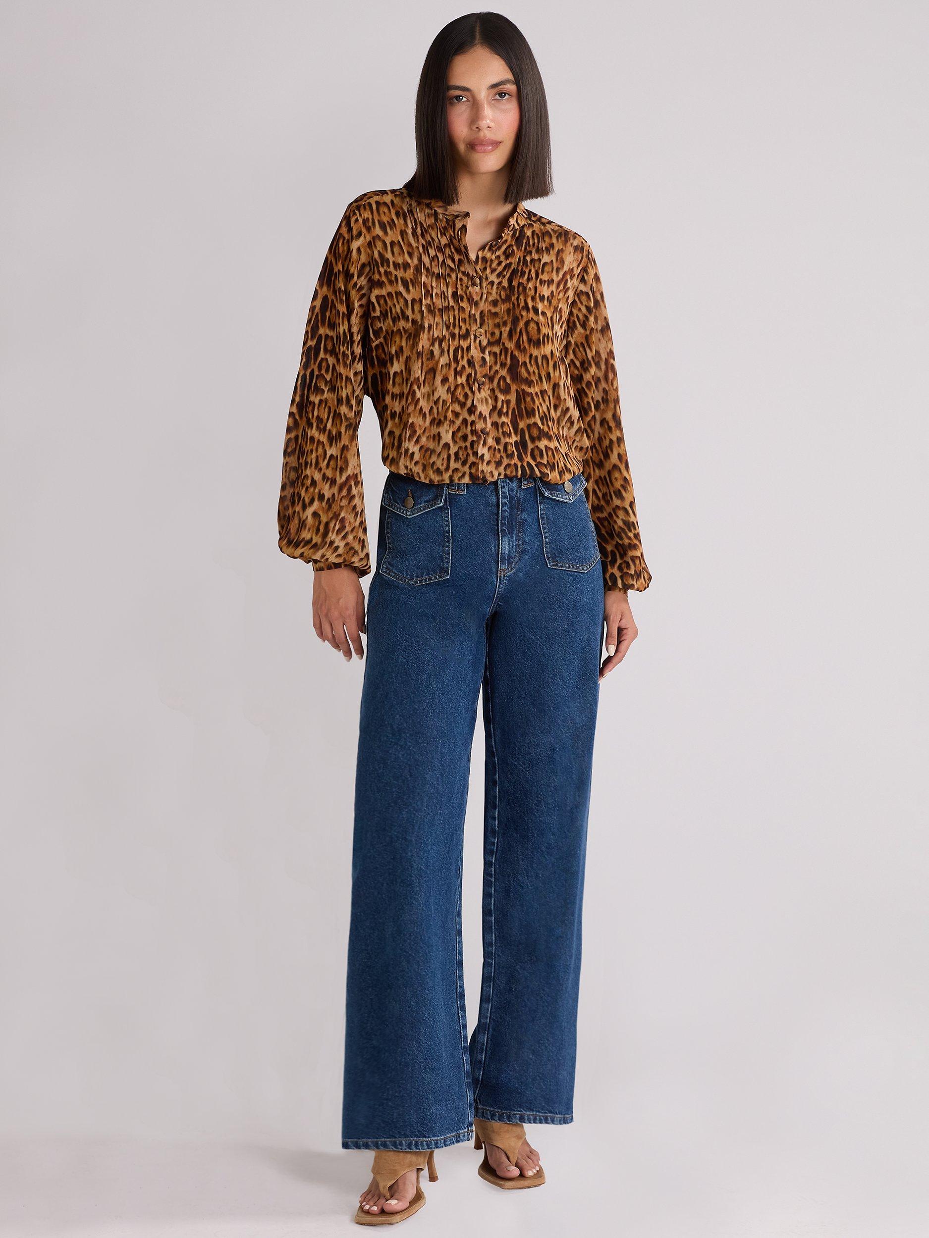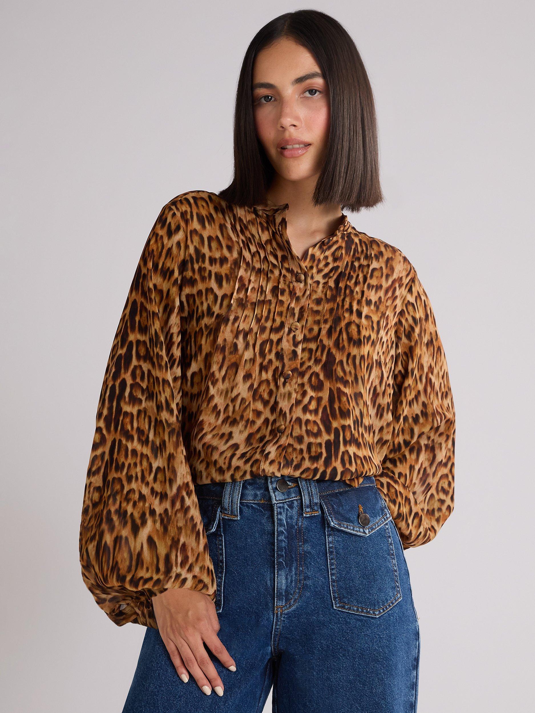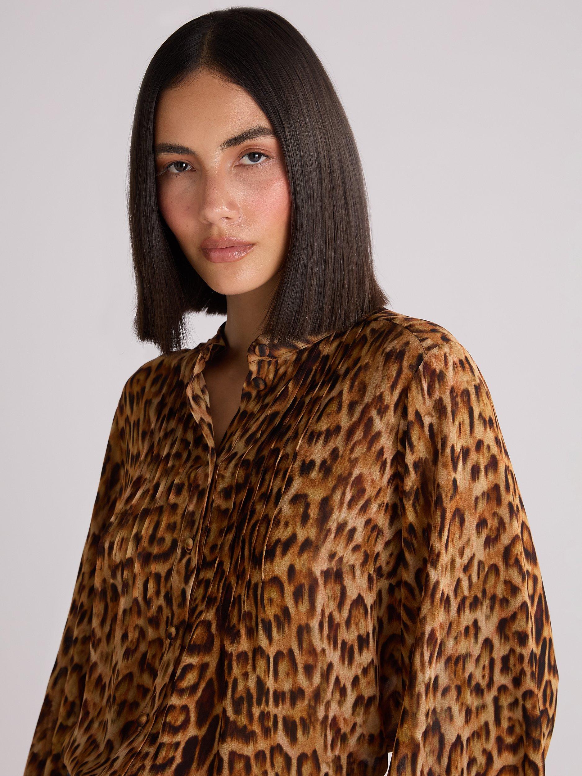 Ro&Zo's leopard print pintuck blouse is made from 100% viscose chiffon, featuring a button front with a Nehru collar. An unlined style, showcasing neat pintuck details on the front bodice and a voluminous blouson hem with cuffs. This blouse falls below the waistband, combining elegance and comfort.