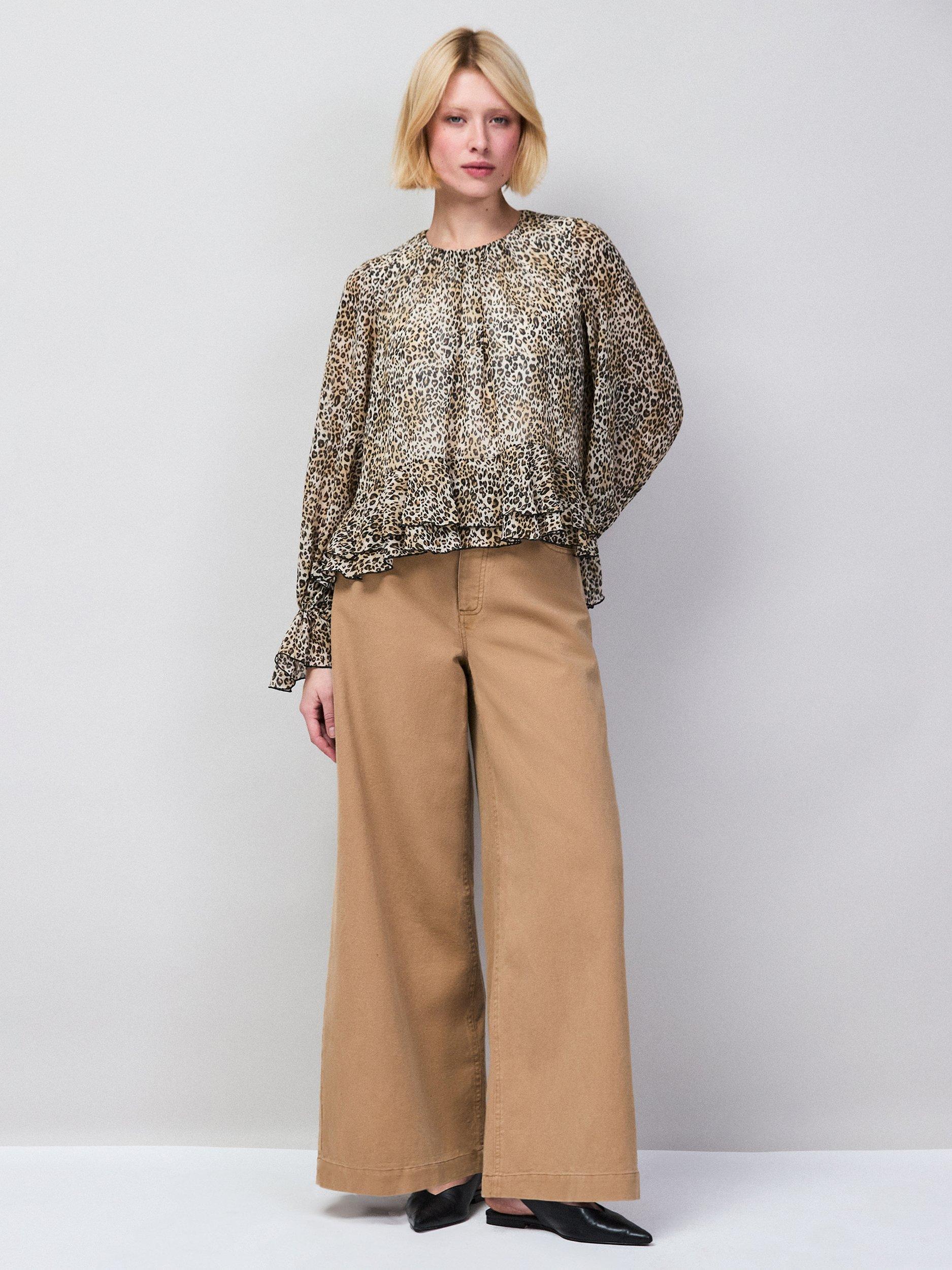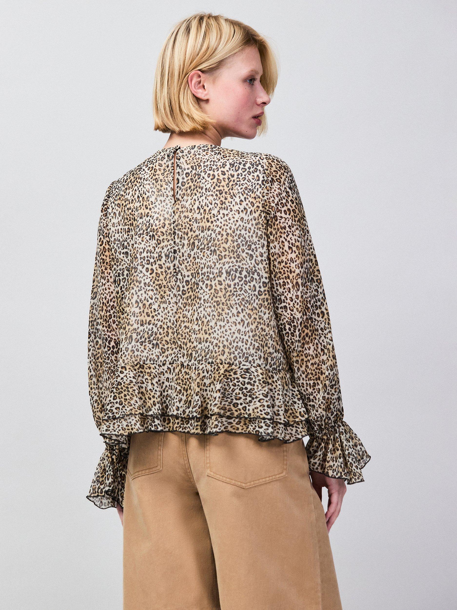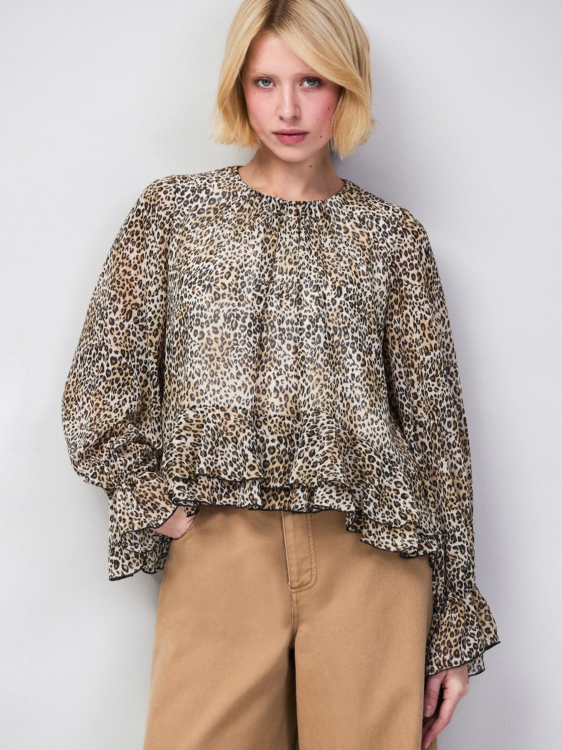 An effortless blouse from Ro&Zo, featuring a crew neck, ruffle trim and long sleeves. Wrapped in leopard print, it's everyday ease with a stylish twist.