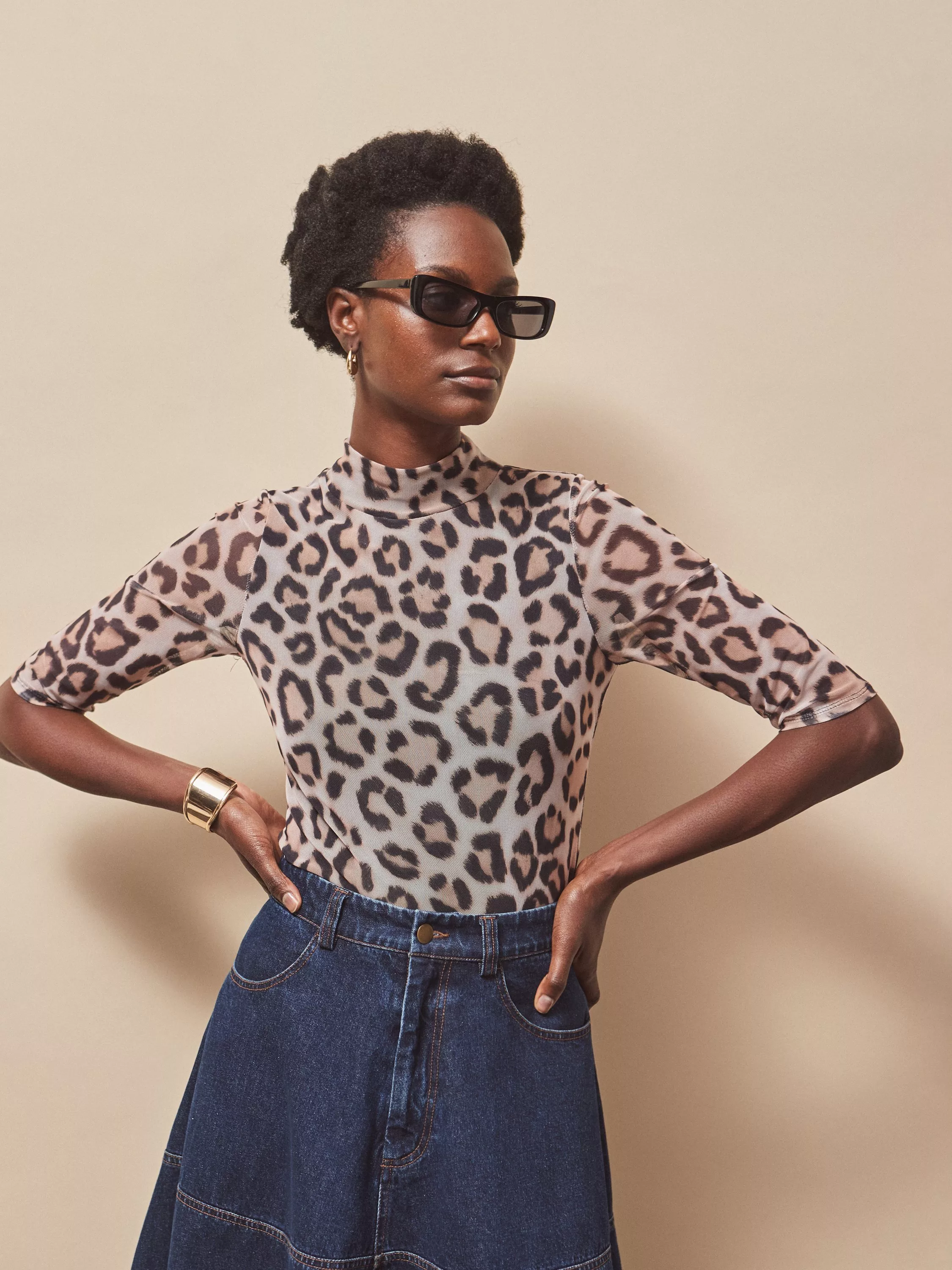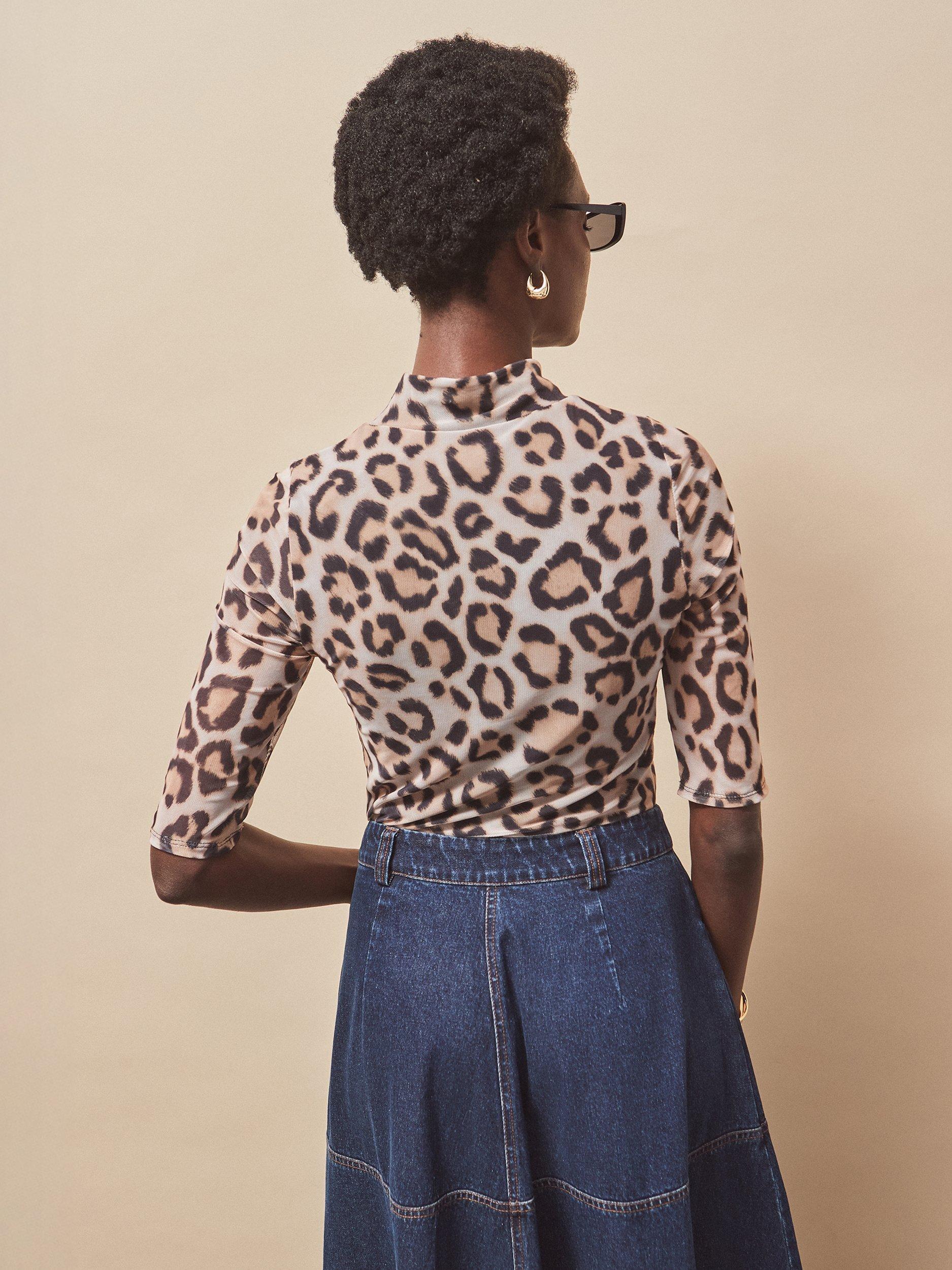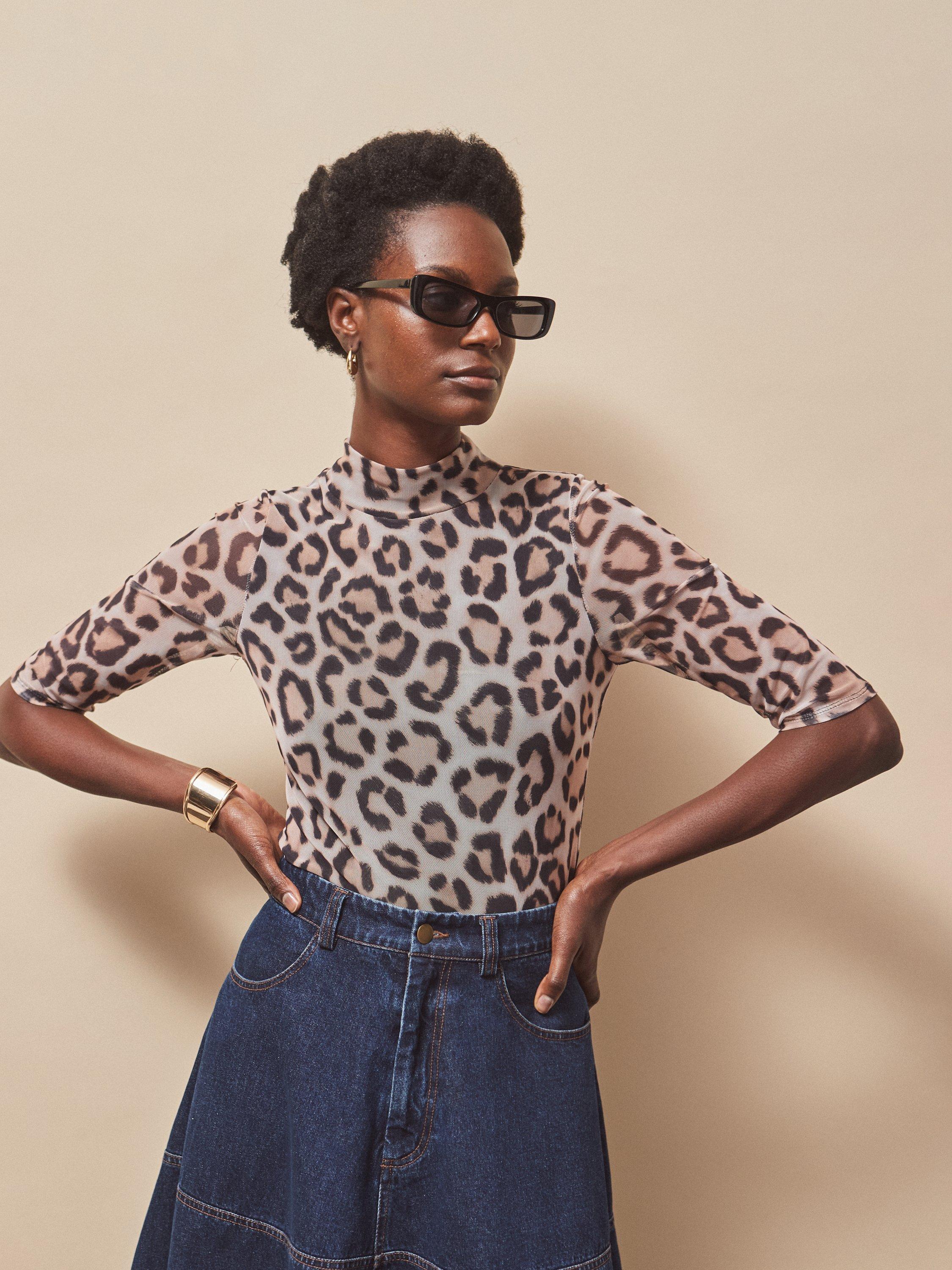 Ro&Zo’s leopard print mesh top blends a clever turtleneck with a comfortable fit, perfect for adding interest to any daytime look. Elbow-length sleeves and soft lining offer day-long comfort, with a playful edge that easily elevates your wardrobe for desk-to-dinner wear.