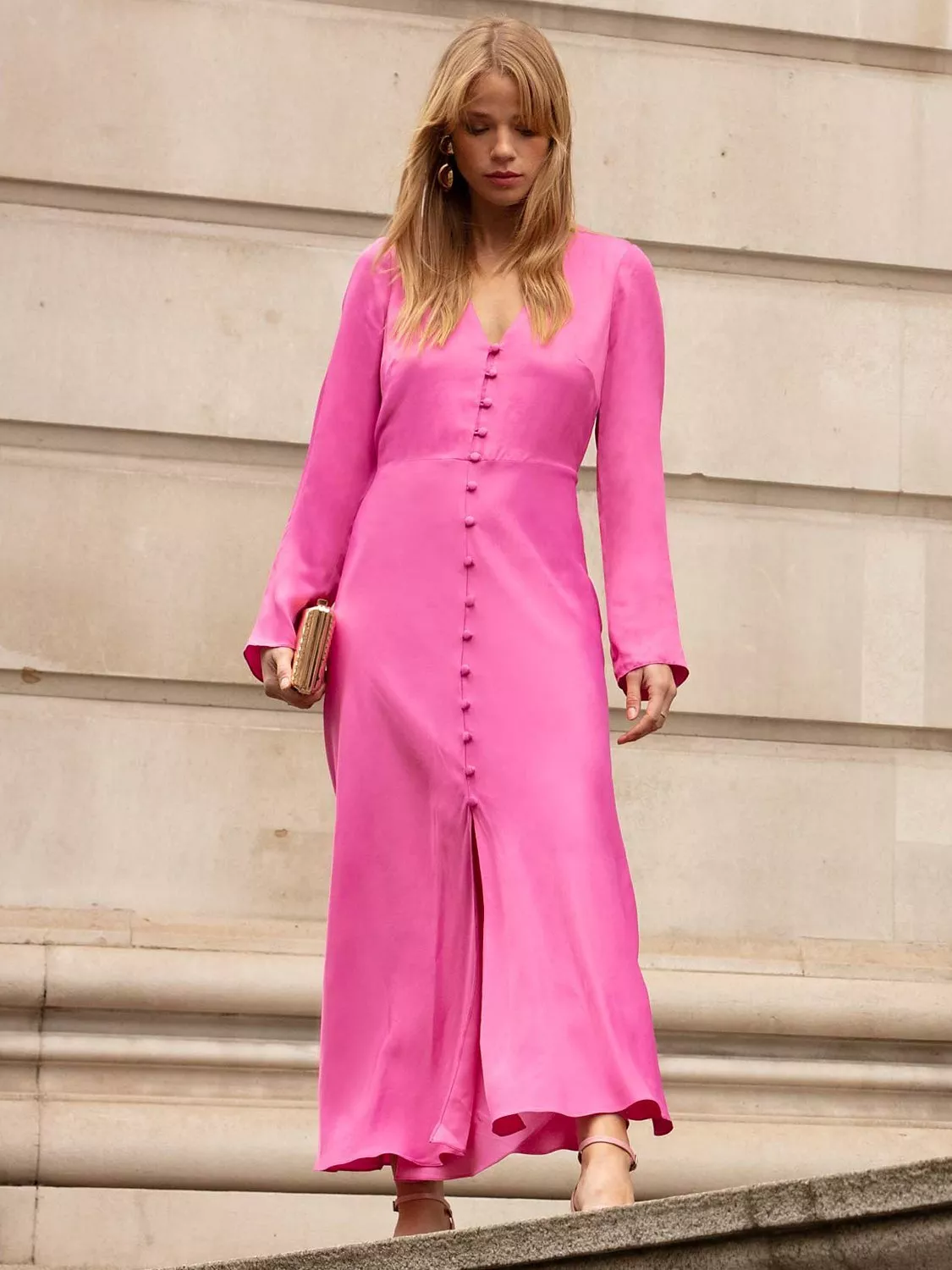 Ro&ZoLilah Satin Button Front Midi Dress, Pink