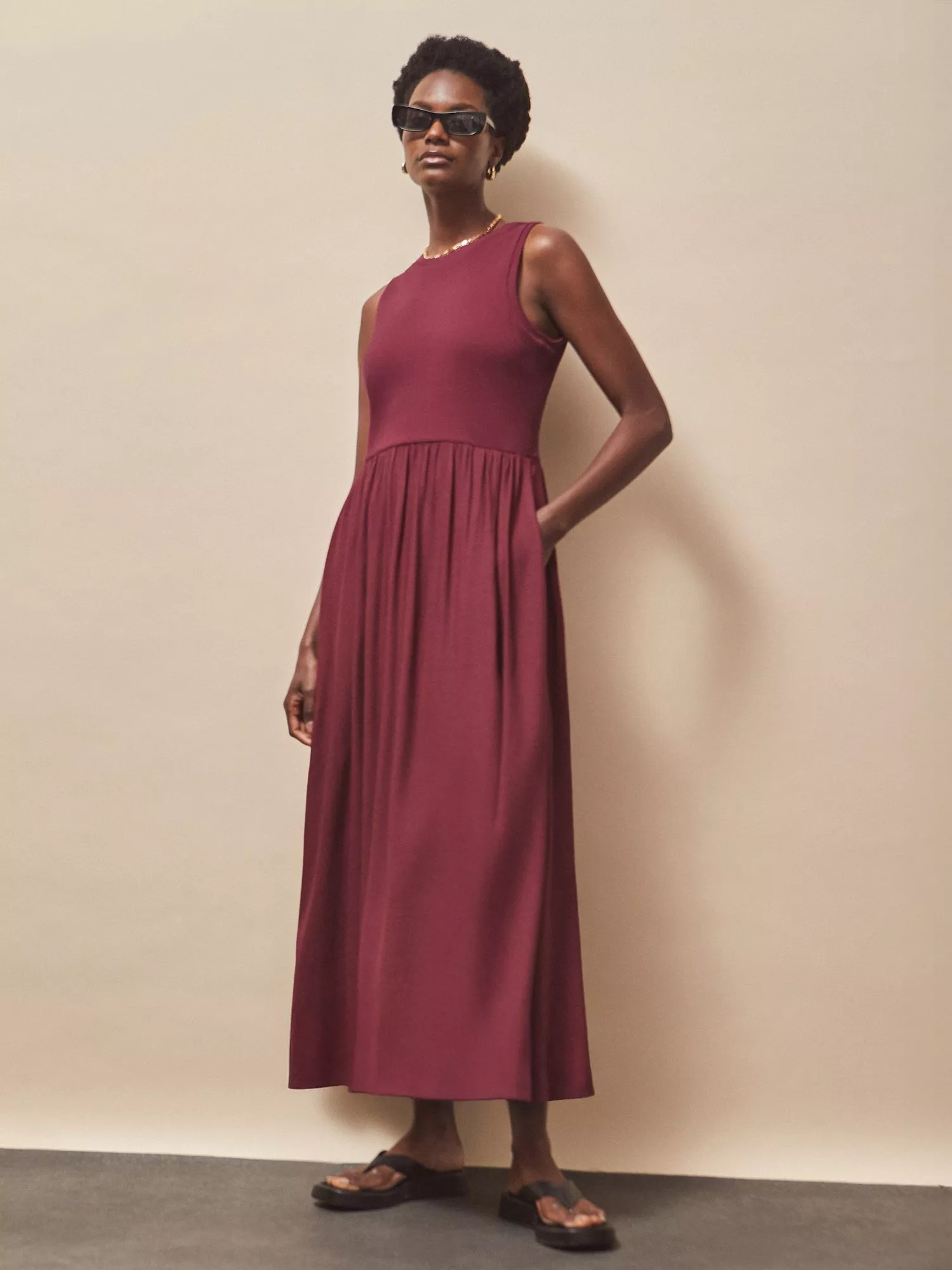Ro&Zo’s fit and flare maxi dress brings comfort and ease to your day. The sleeveless style and round neck keep you cool, while the soft jersey top and woven skirt let you move freely wherever your plans take you.