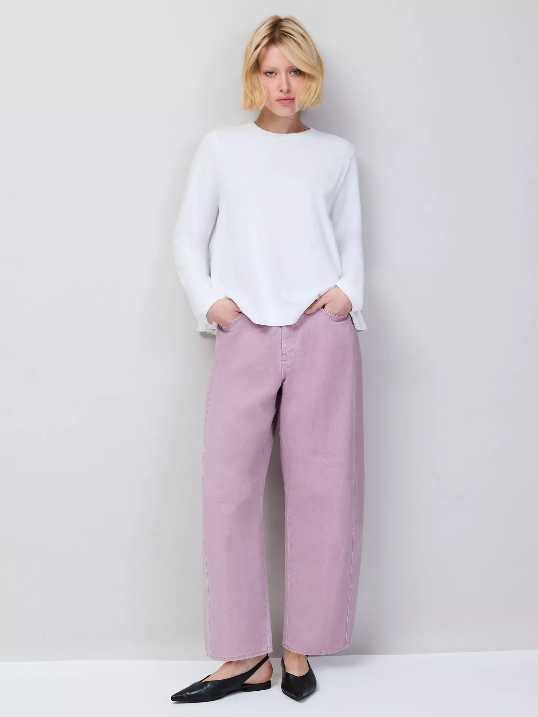 A pair of petite modern barrel-fit jeans from Ro&Zo. Made from pure cotton with a comfortable mid rise and a zip fly, they fall to a regular length.