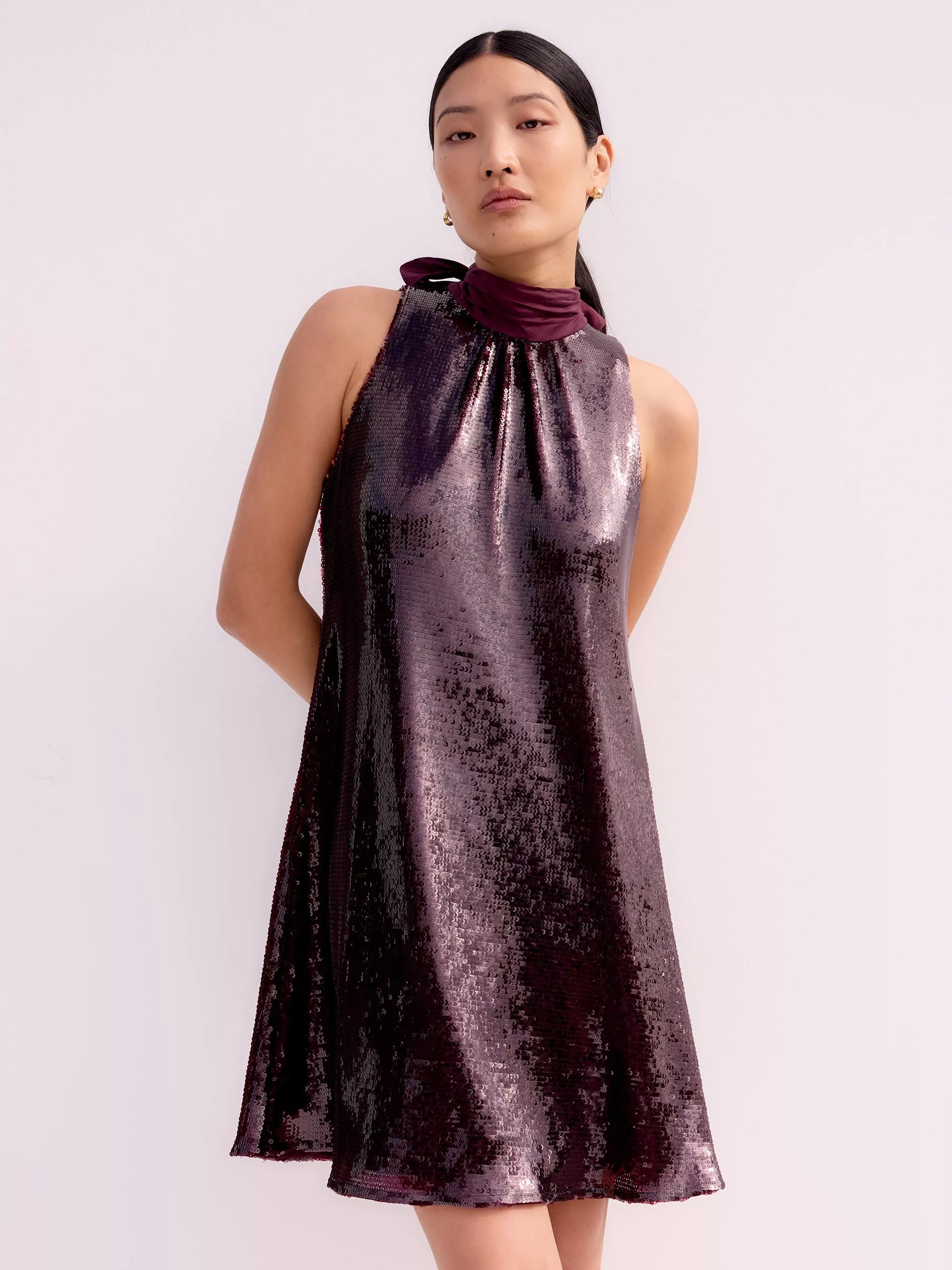This sleeveless mini dress by Ro&Zo features a halter neckline whilst the embellished detailing ands some shimmer.