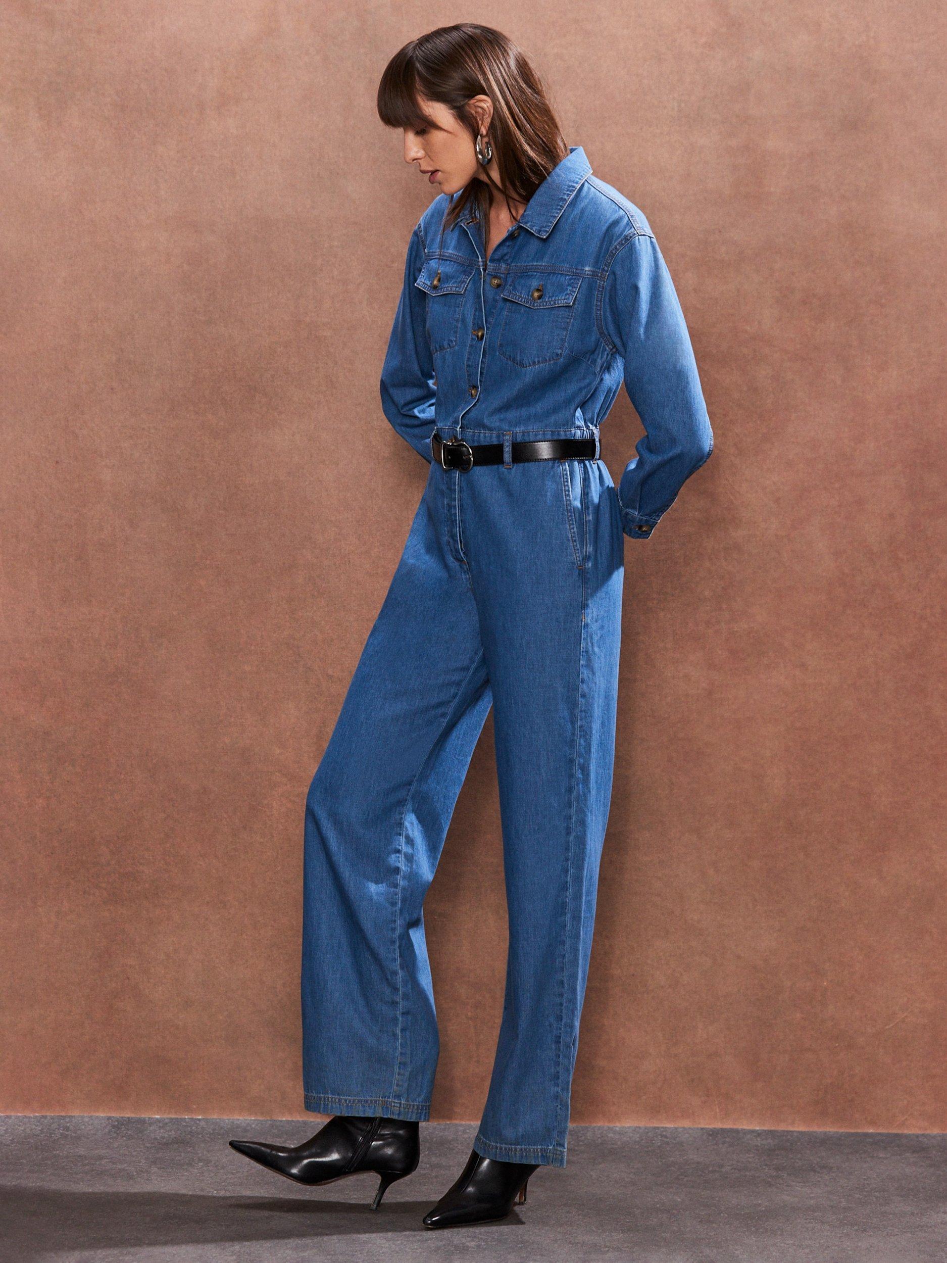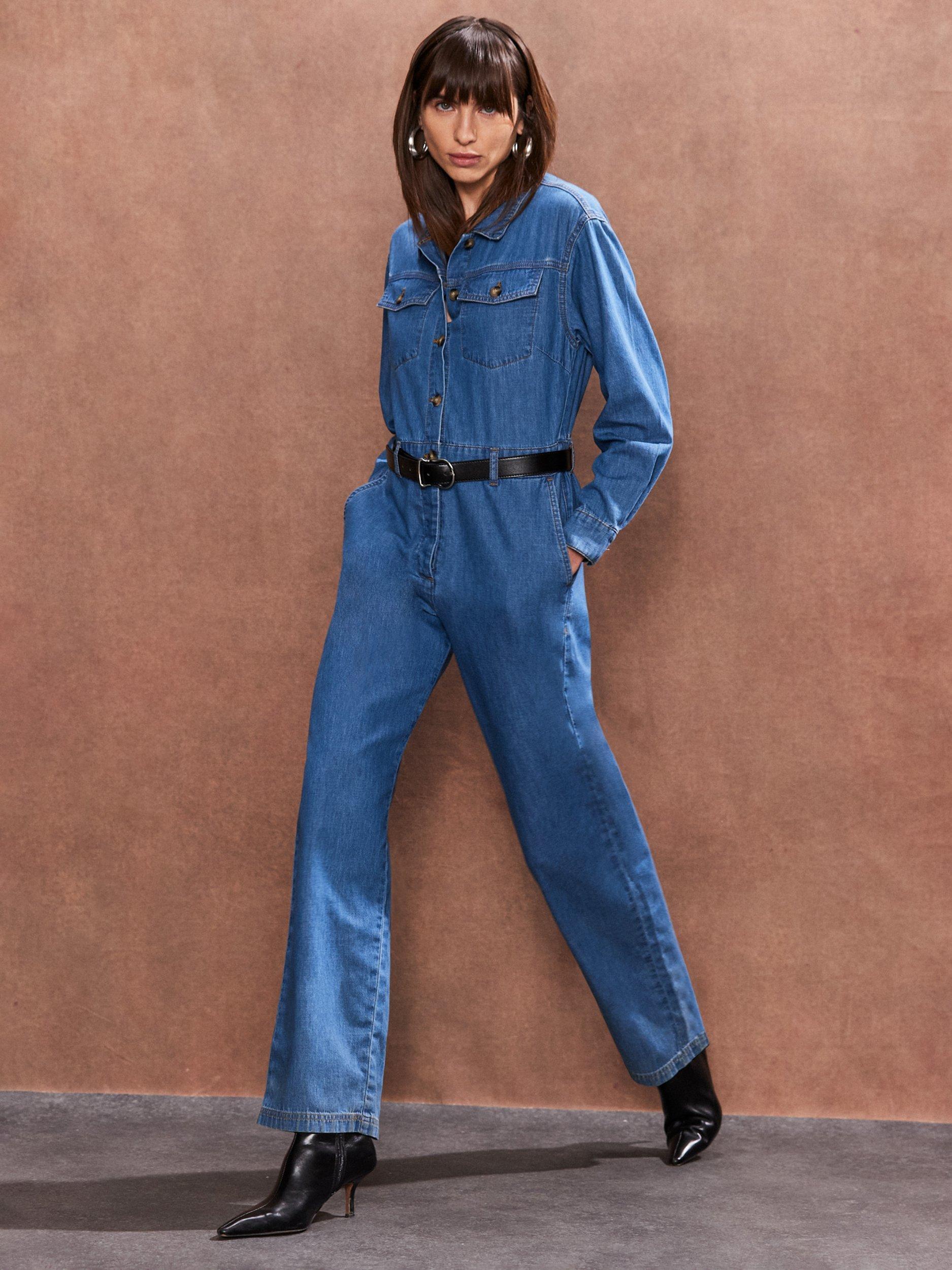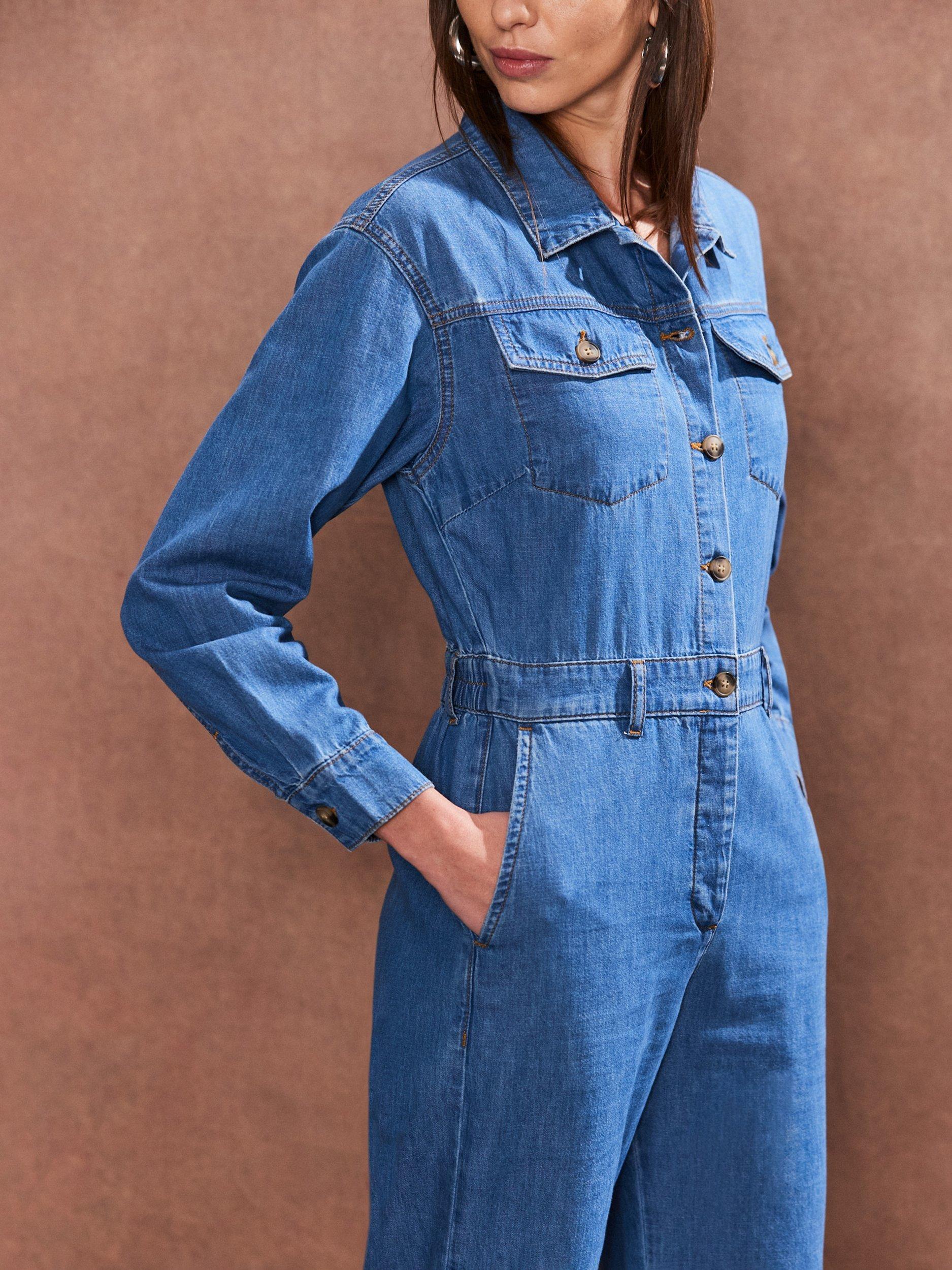 The perfect choice for your work wardrobe this season, this Denim Jumpsuit is an easy chuck on style. With its horn button detailing, soft cotton denim and straight leg silhouette, this jumpsuit says style and sophistication without compromising on comfort and practicality. Embrace the utility look with leather boots or soften with a cosy, colourful knit.