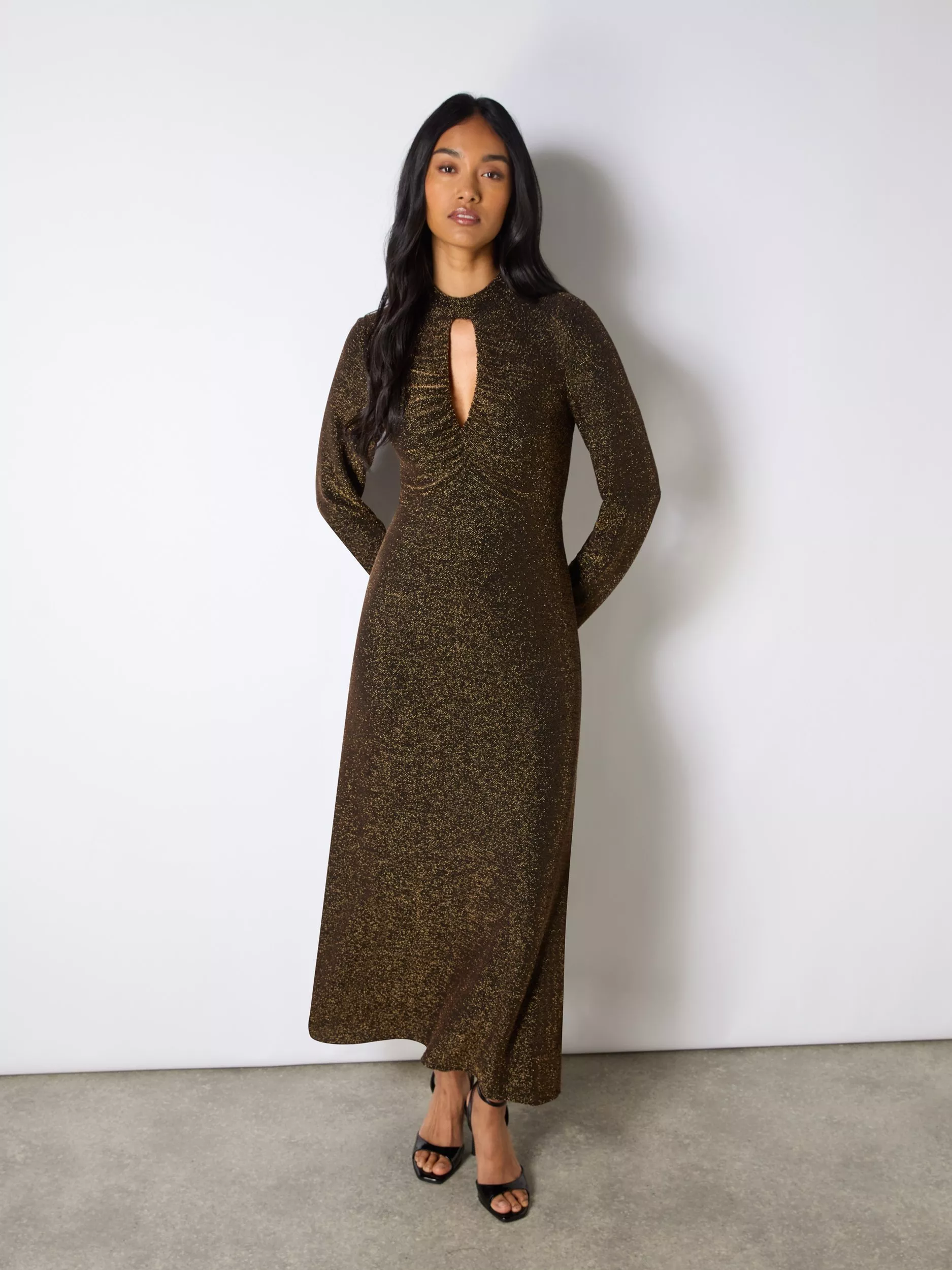 The Petite Zara Sparkle Jersey Keyhole Front Dress for the petite 5ft 3" and under women, is fully lined and crafted from stretch fabric for comfort. It features a high neckline with a keyhole detail and ruching around the keyhole area. With a slim-fit full-length sleeve and a long midi length, this dress offers a stylish and flattering silhouette for various occasions.