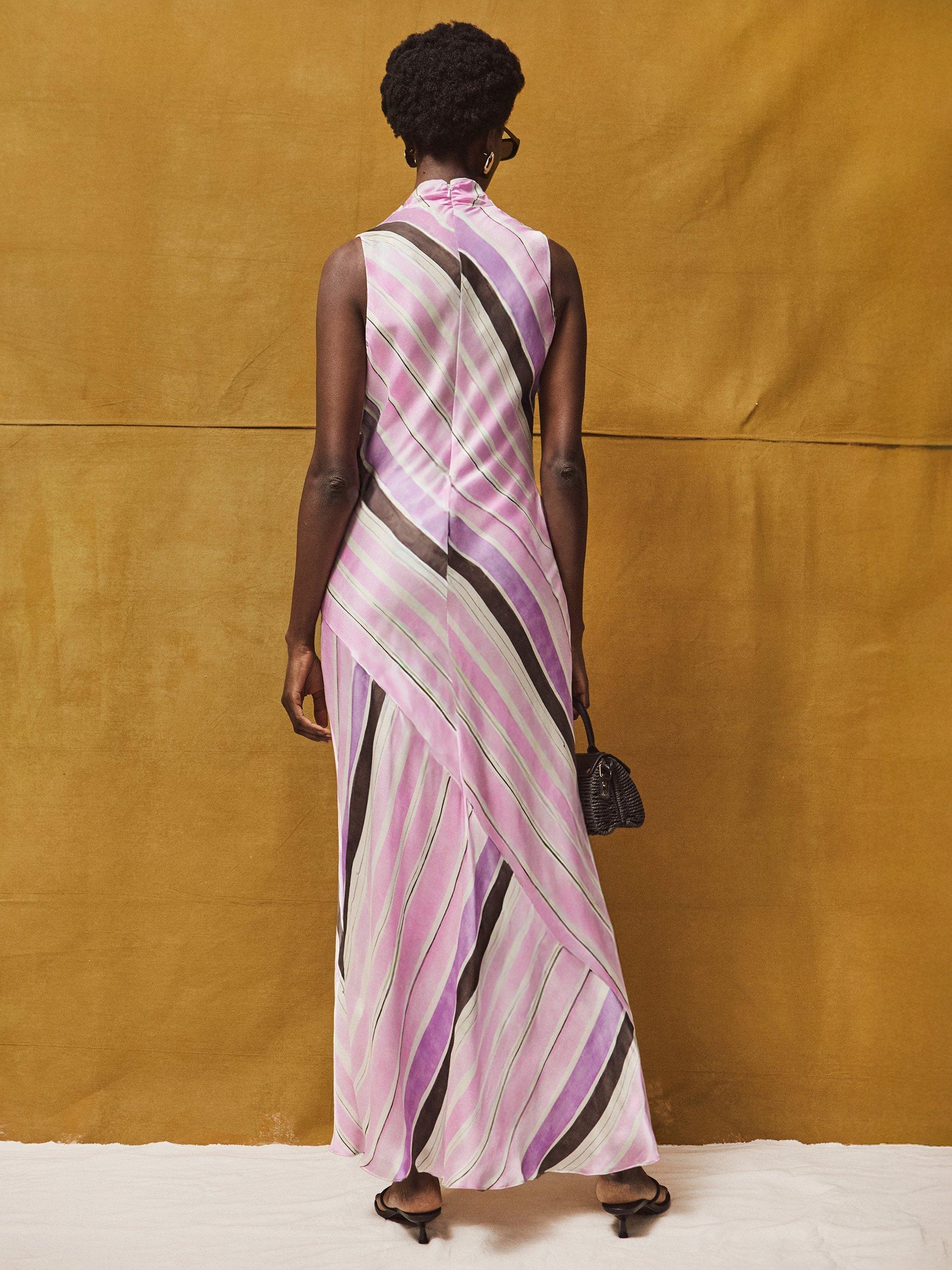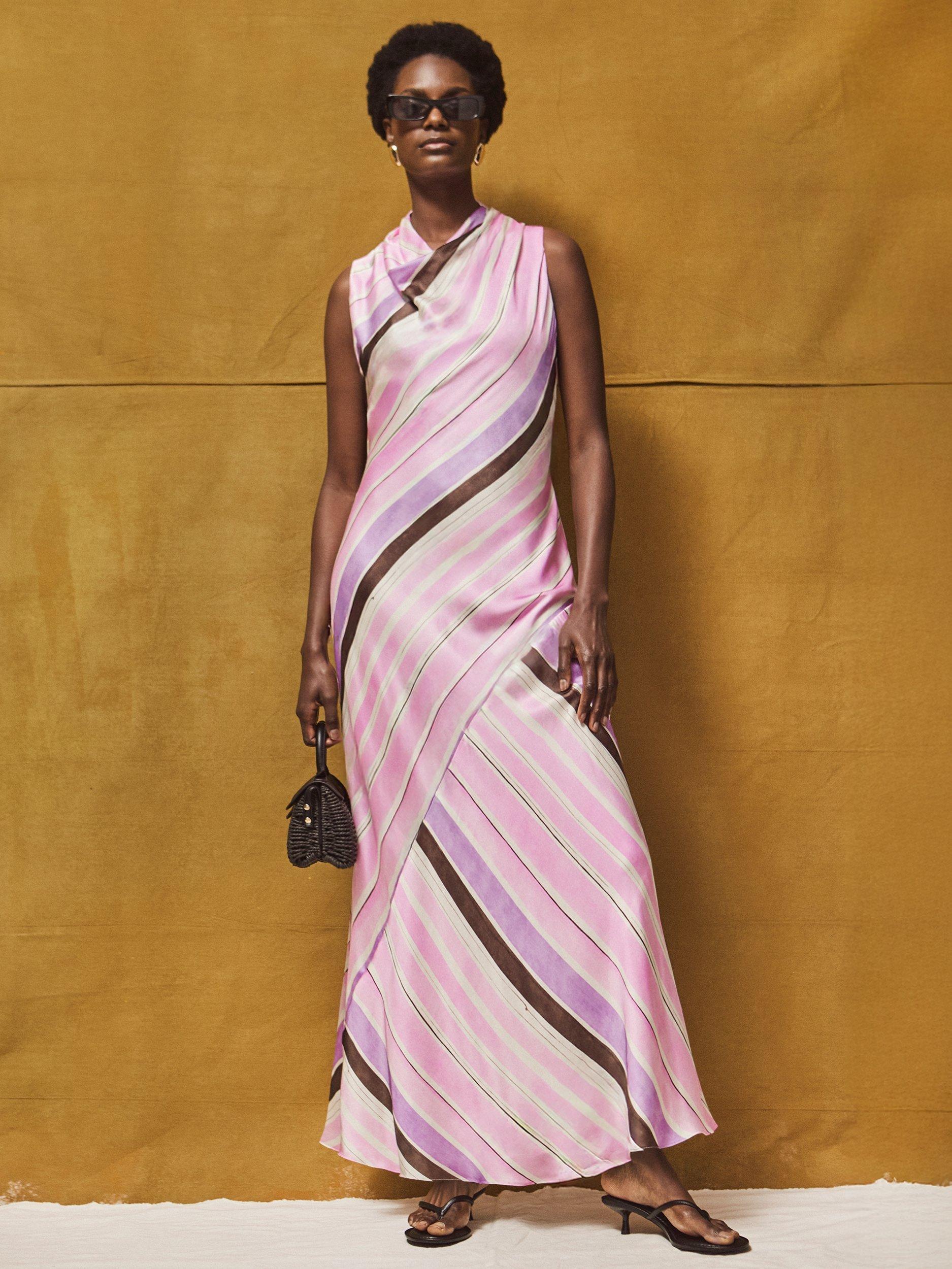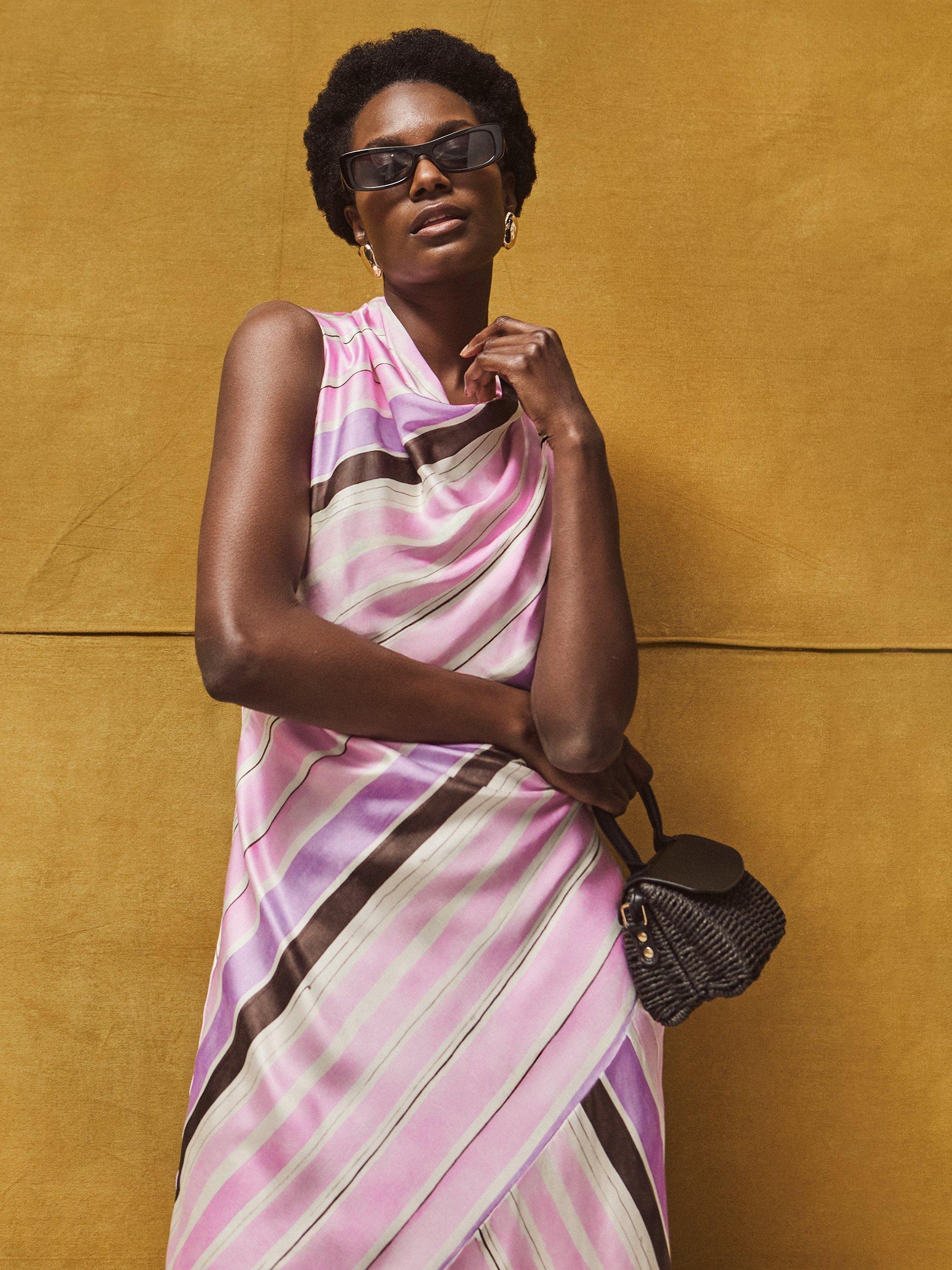 The Phoebe dress is perfect for special occasions, from weddings to birthday parties. Crafted from lustrous satin with bold stripes, it's detailed with a cowl neckline. We love the flattering bias cut and the fact that it's fully lined, meaning you don't have to worry about layering a slip beneath. Tap into the '00s styling with kitten heels and a shoulder bag.