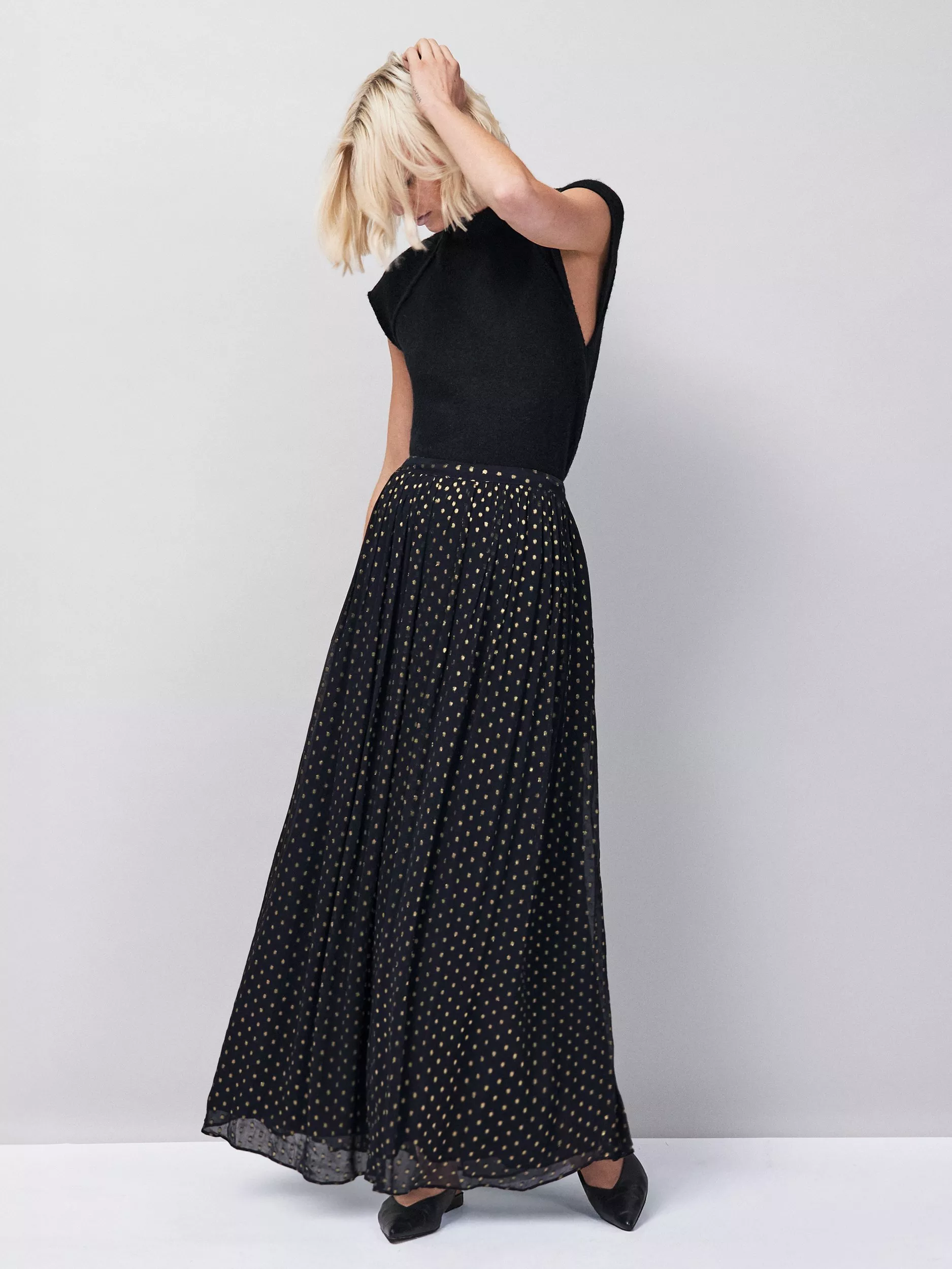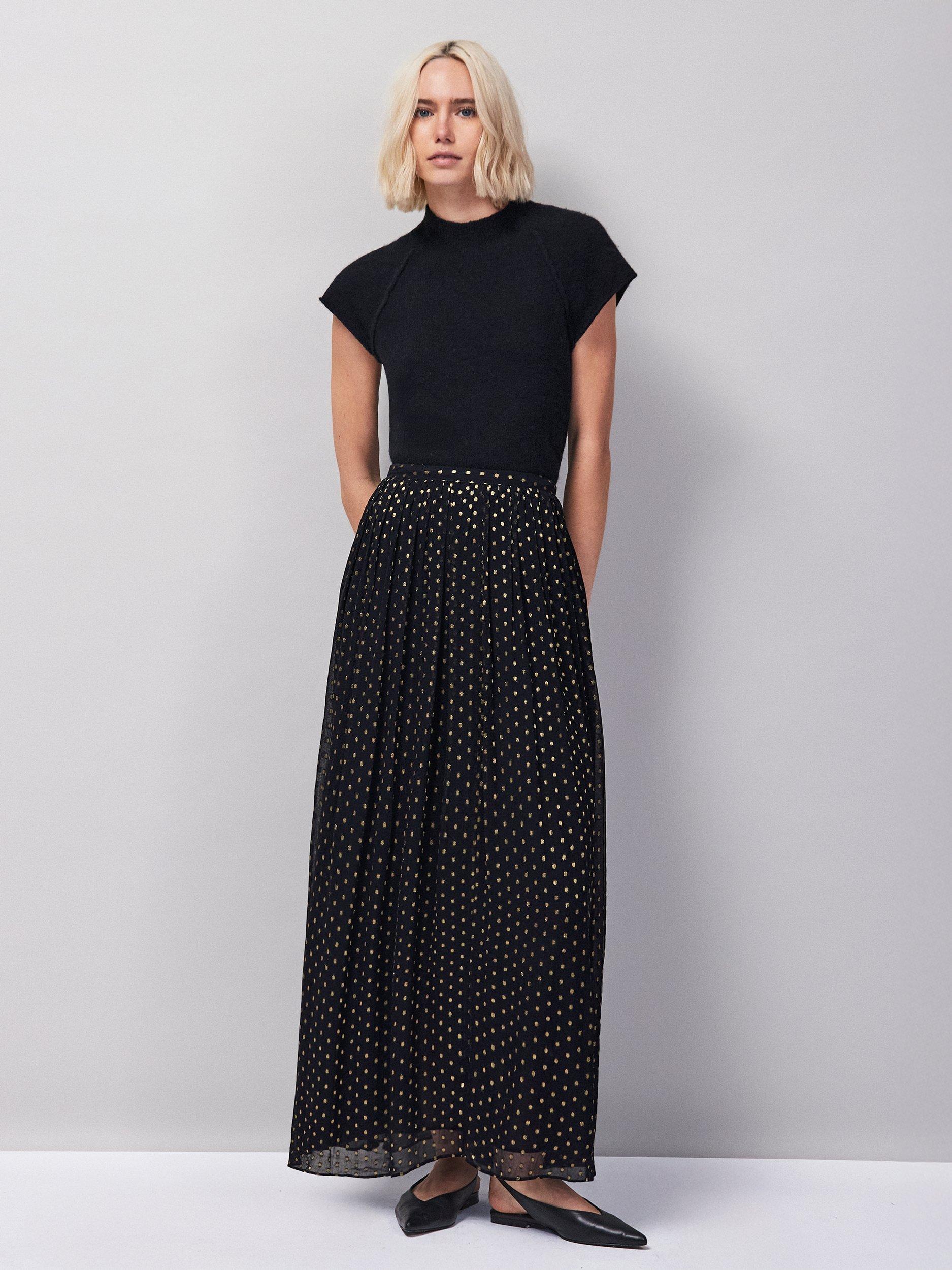 A floor-grazing skirt by Ro&Zo. A-line silhouette softened by pleats, it's made from a viscose blend and finished with gold foil shimmer.