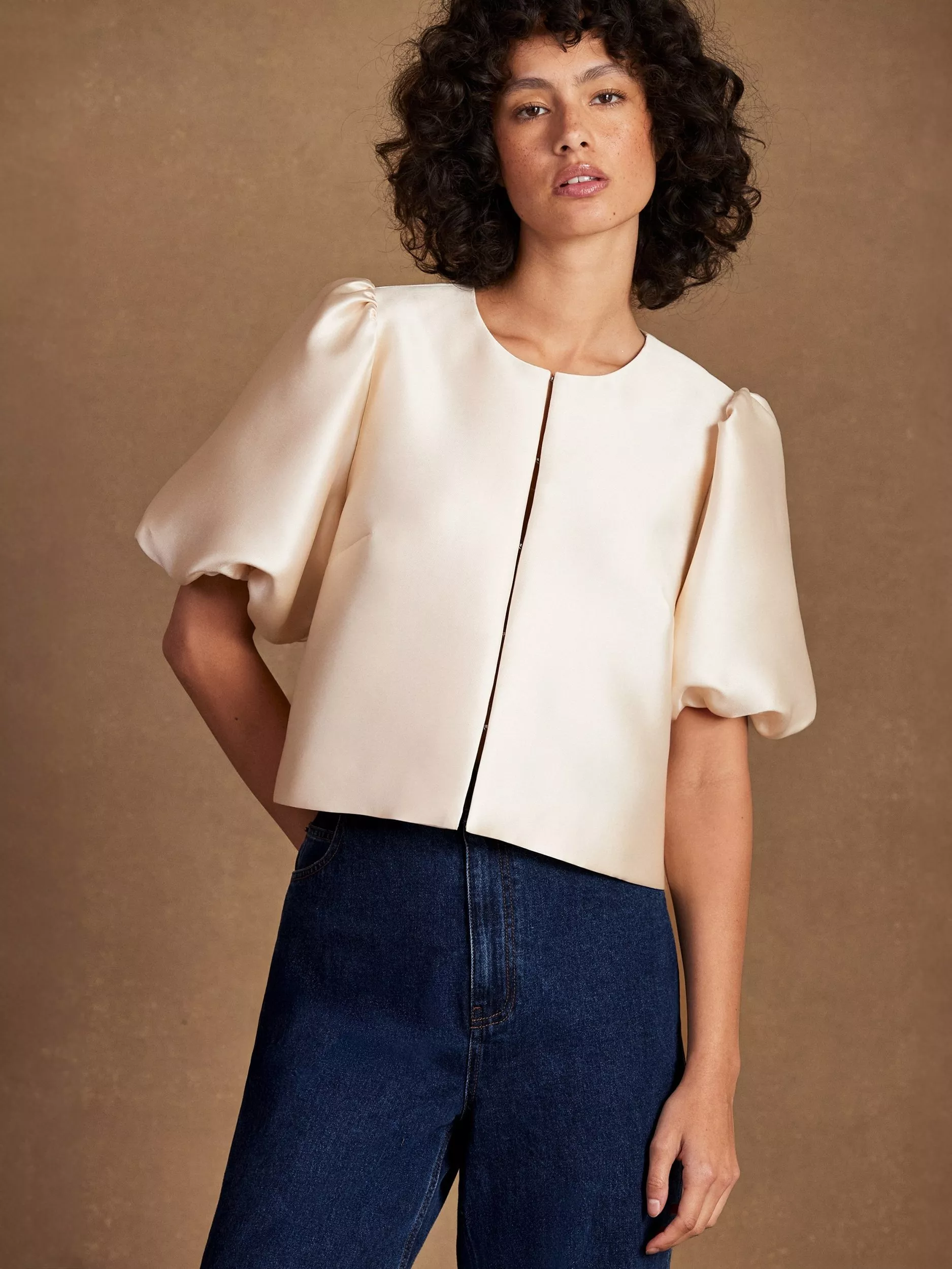 A shirt blouse by Ro&Zo. Featuring a round neck and short puff sleeves, it has a go-with-anything plain design. A great piece for everyday.