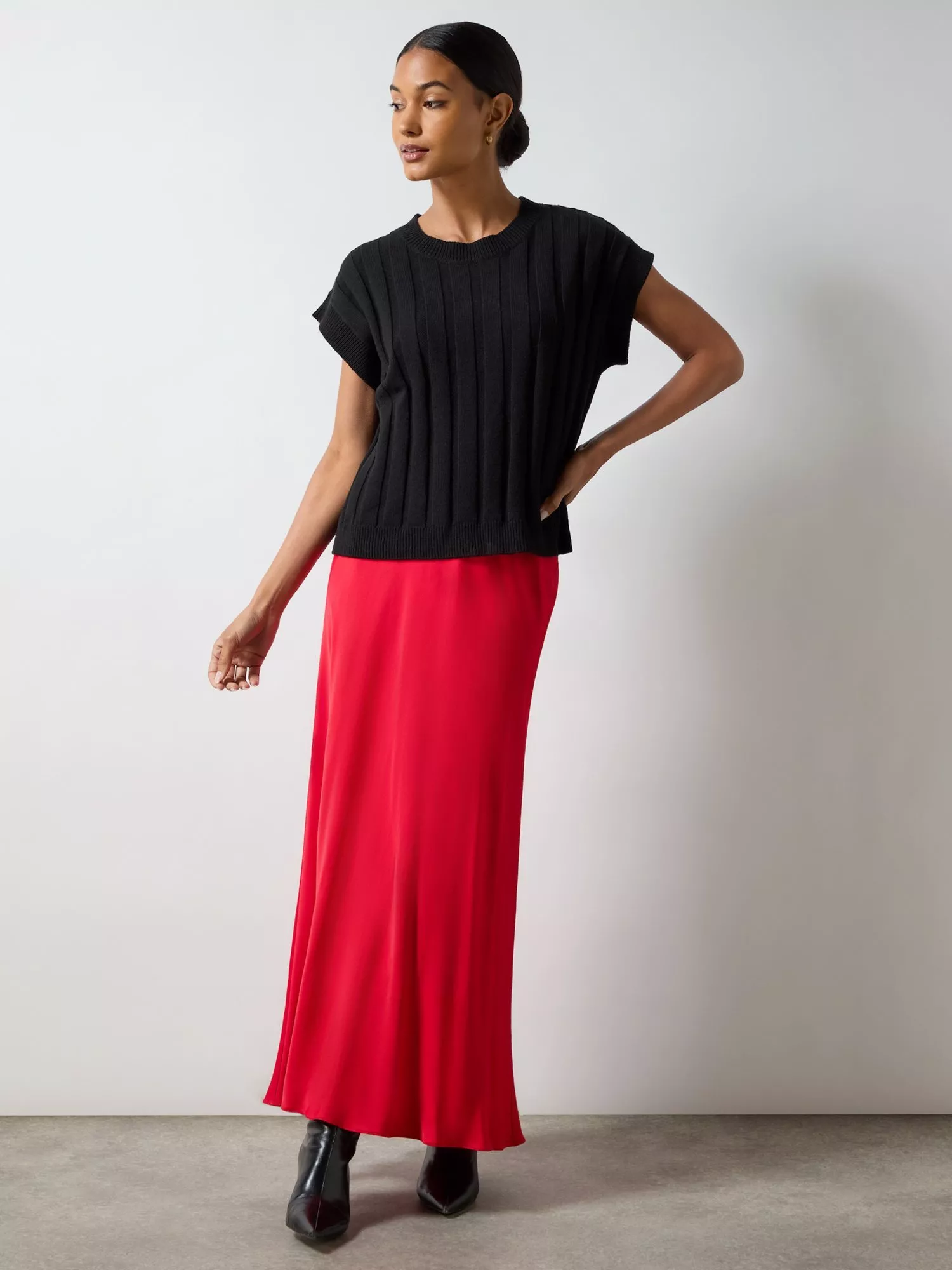 Ro&Zo's ribbed knit vest features a relaxed, boxy fit crafted from a cotton blend yarn with wide rib detailing. Its versatile design includes a round neckline and below-waistband length, perfect for wearing alone or layered over blouses and shirts. This piece effortlessly combines comfort and style for a chic, modern look.