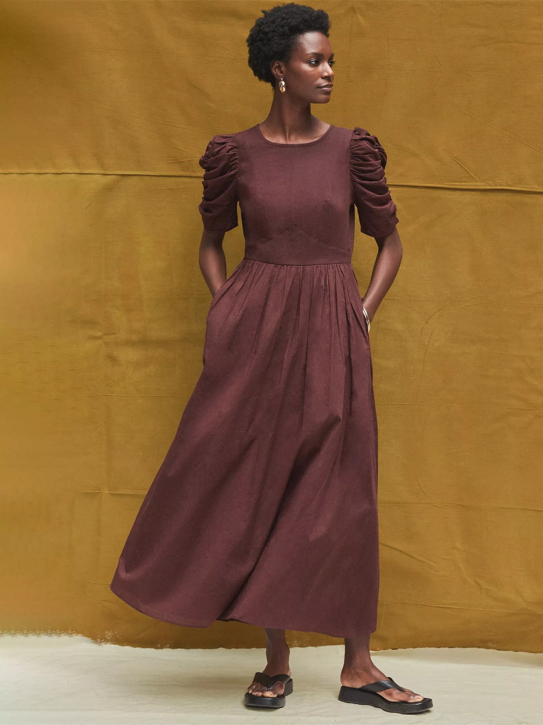 Ro&ZoRuched Puff Sleeve Midi Dress, Brown
