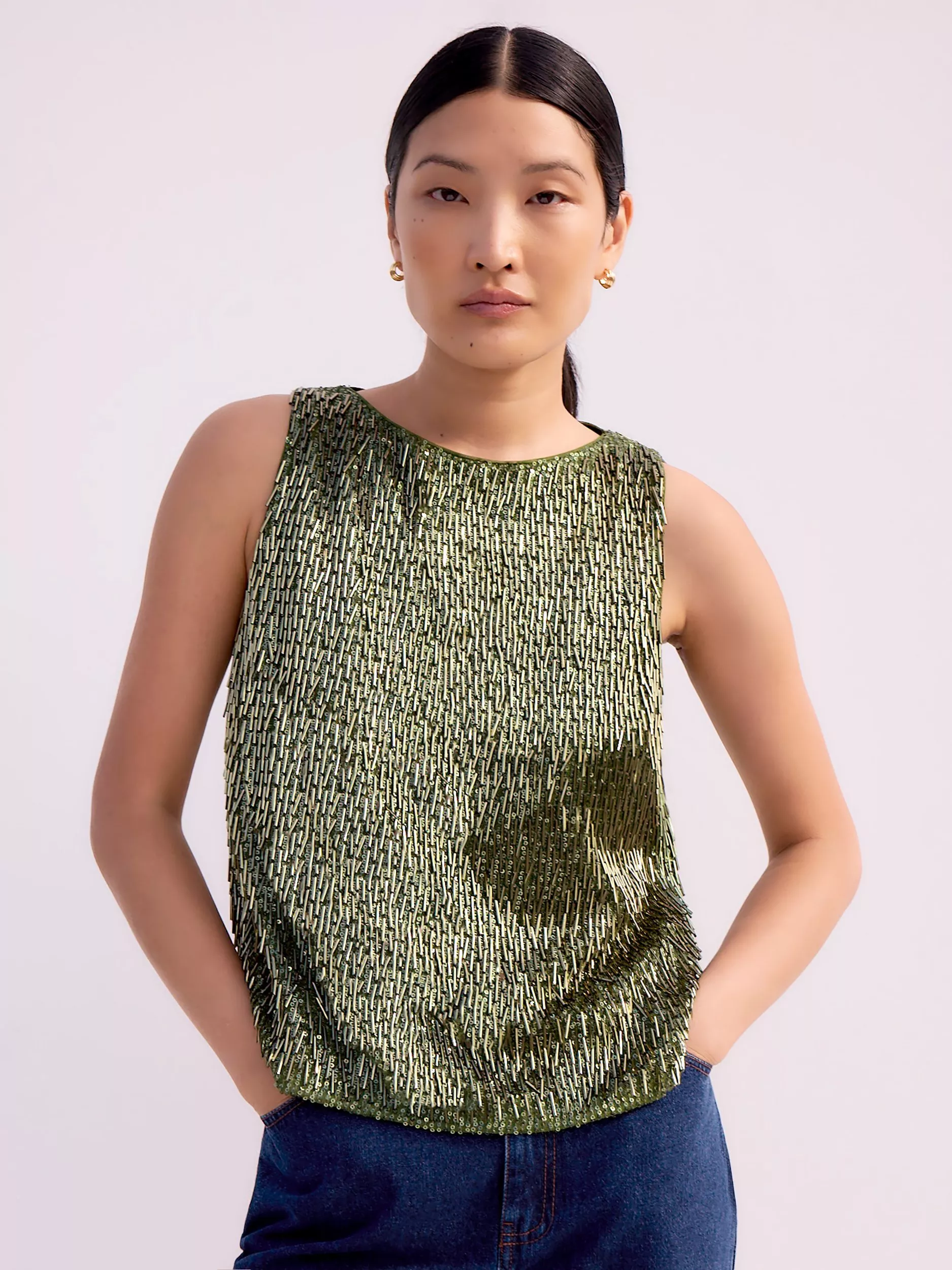 Embellished with scores of shimmering sequins and beads, this sleeveless top is the perfect party plus-one. Designed with a classic boat neck.