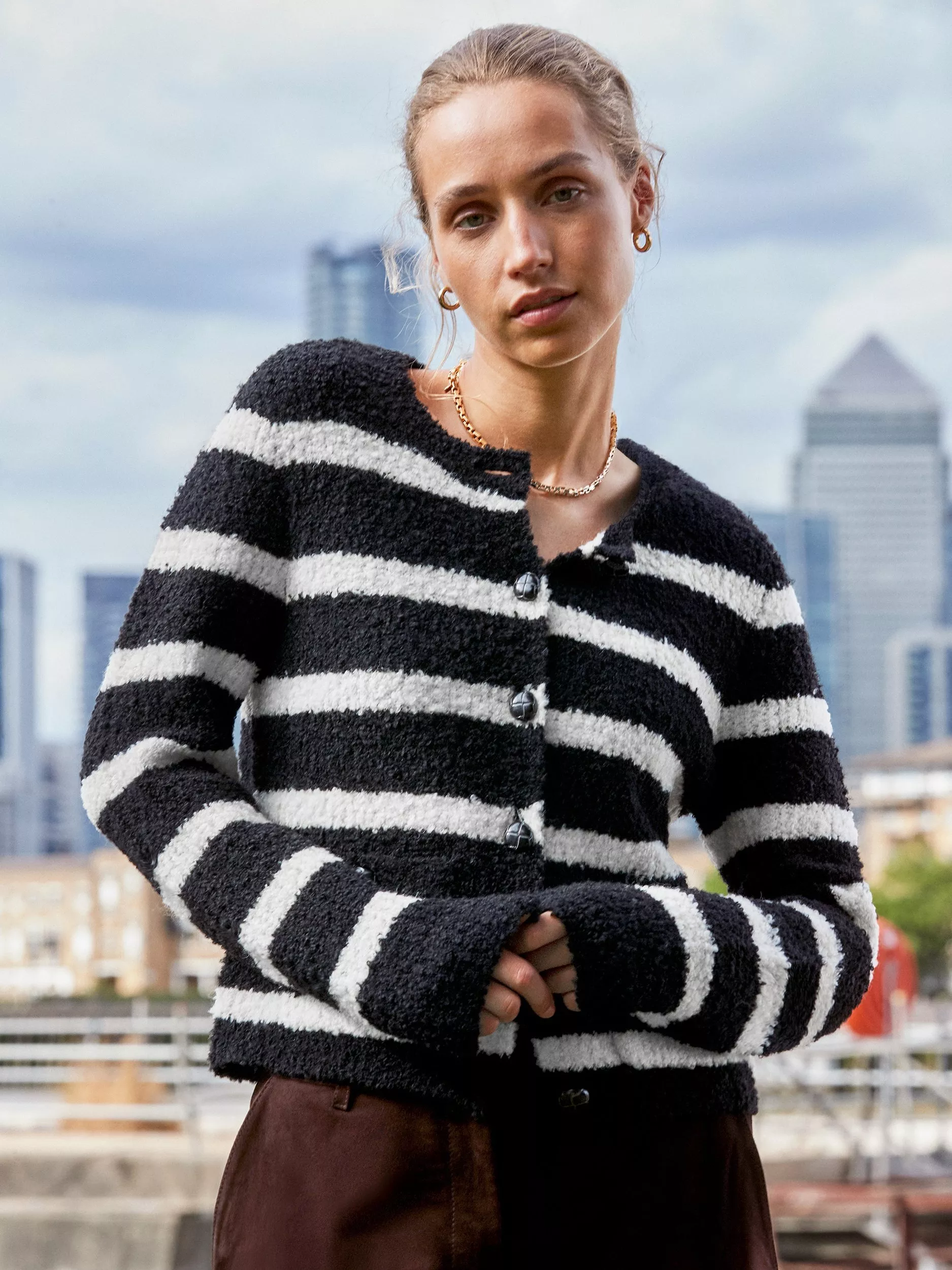 Cut with a round neck and long sleeves, this mid-weight stripe print cardigan by Ro&Zo is a fine match for grey skies in a warming woollen blend.