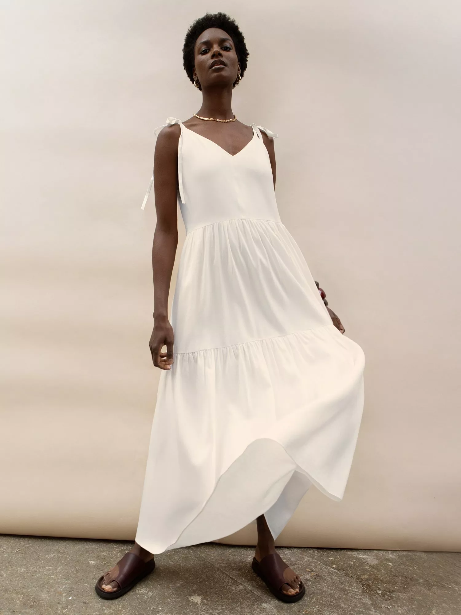 Cut to drop into a tiered silhouette, this maxi dress from Ro&Zo comes in featherlight cotton. With a fuss-free but smart v-neckline and tie spaghetti straps, it redefines your collection with the minimum of fuss.
