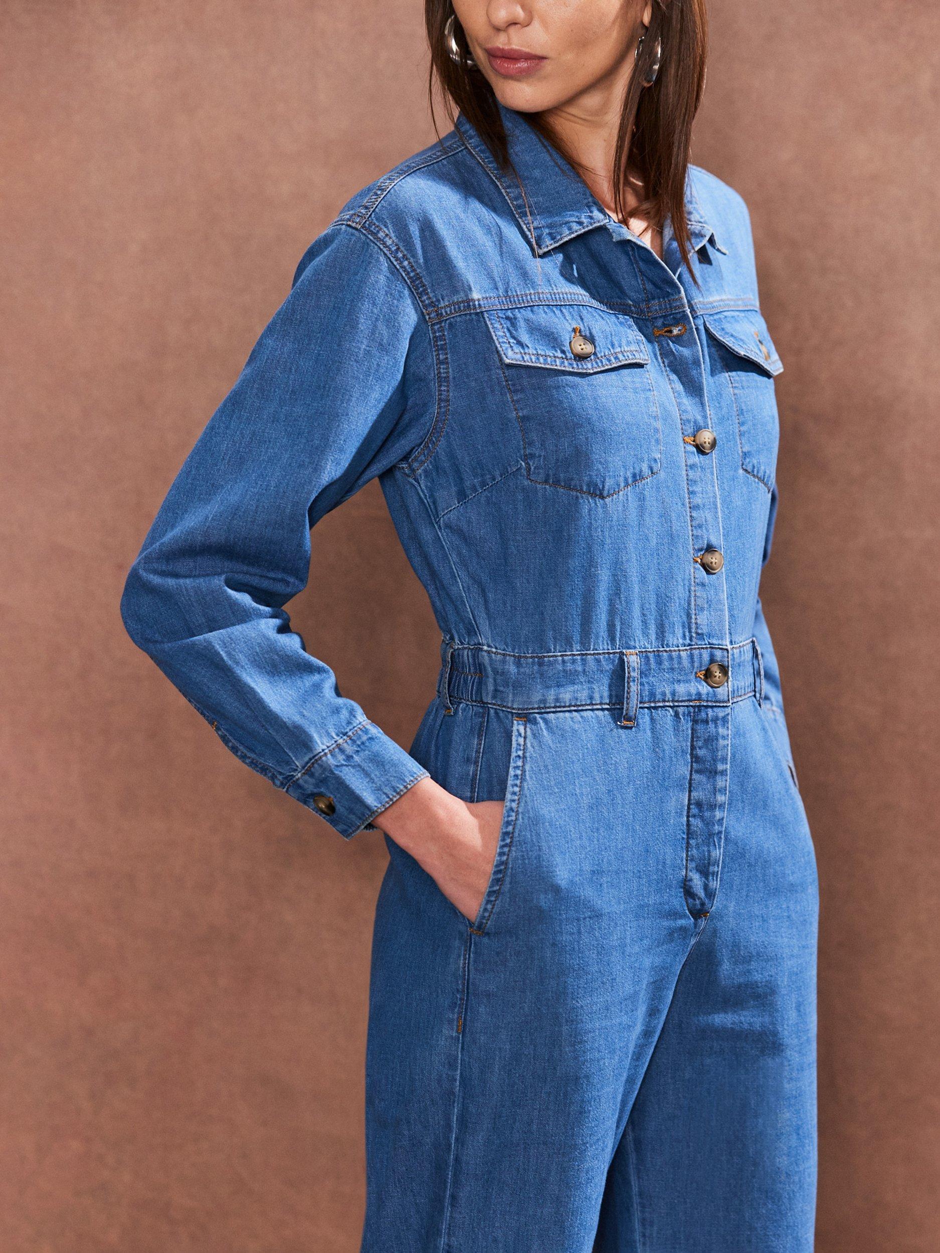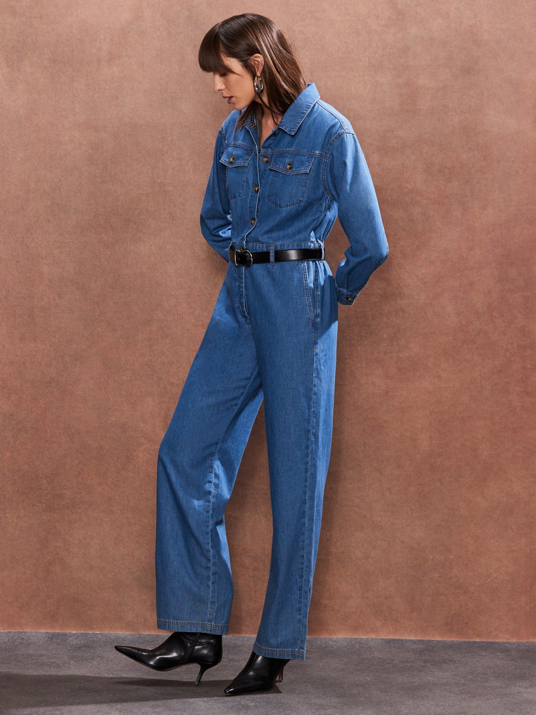 The perfect choice for your work wardrobe this season, this Denim Jumpsuit is an easy chuck on style. With its horn button detailing, soft cotton denim and straight leg silhouette, this jumpsuit says style and sophistication without compromising on comfort and practicality. Embrace the utility look with leather boots or soften with a cosy colourful knit.