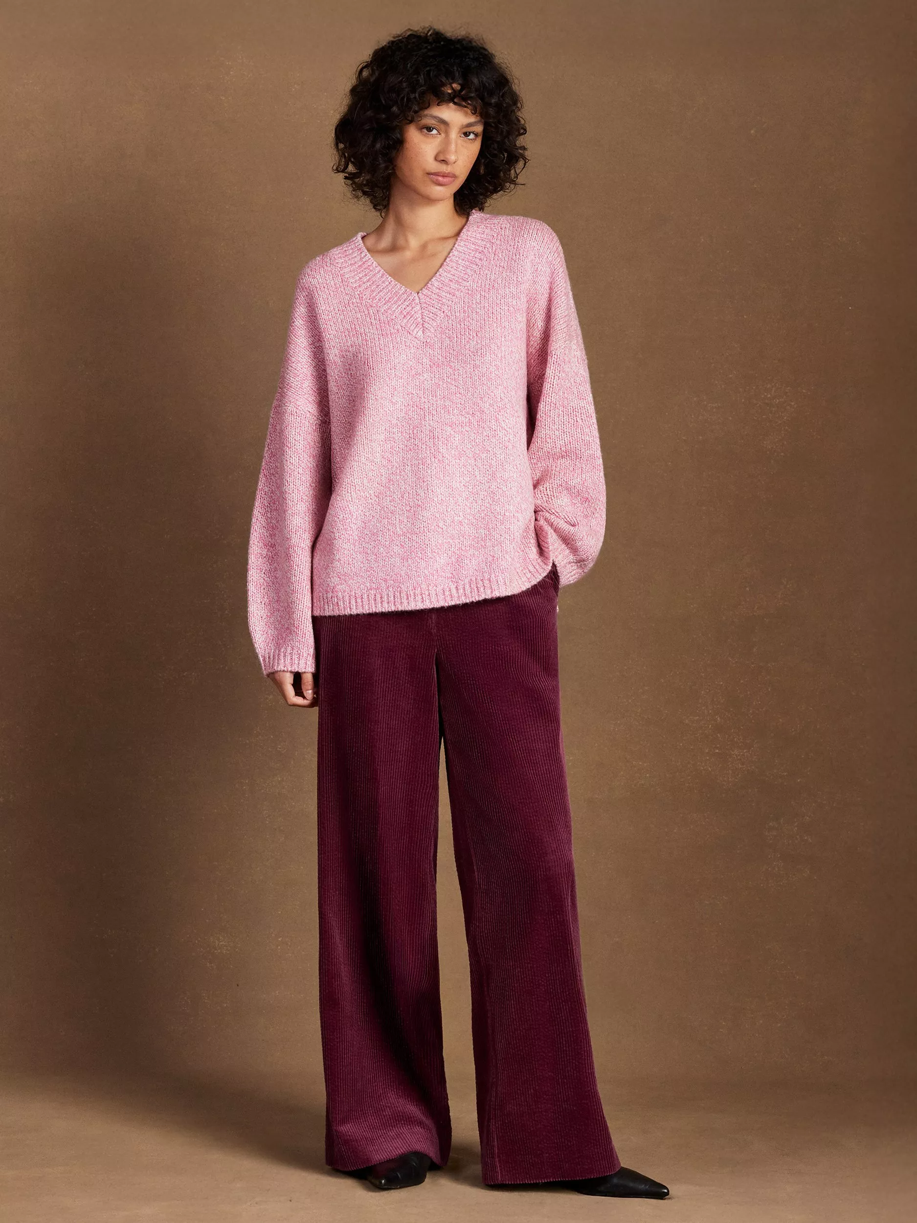 With a V-shaped neckline and long sleeves, this mid-weight jumper by Ro&Zo is a fine match for grey skies in a warming woollen blend.