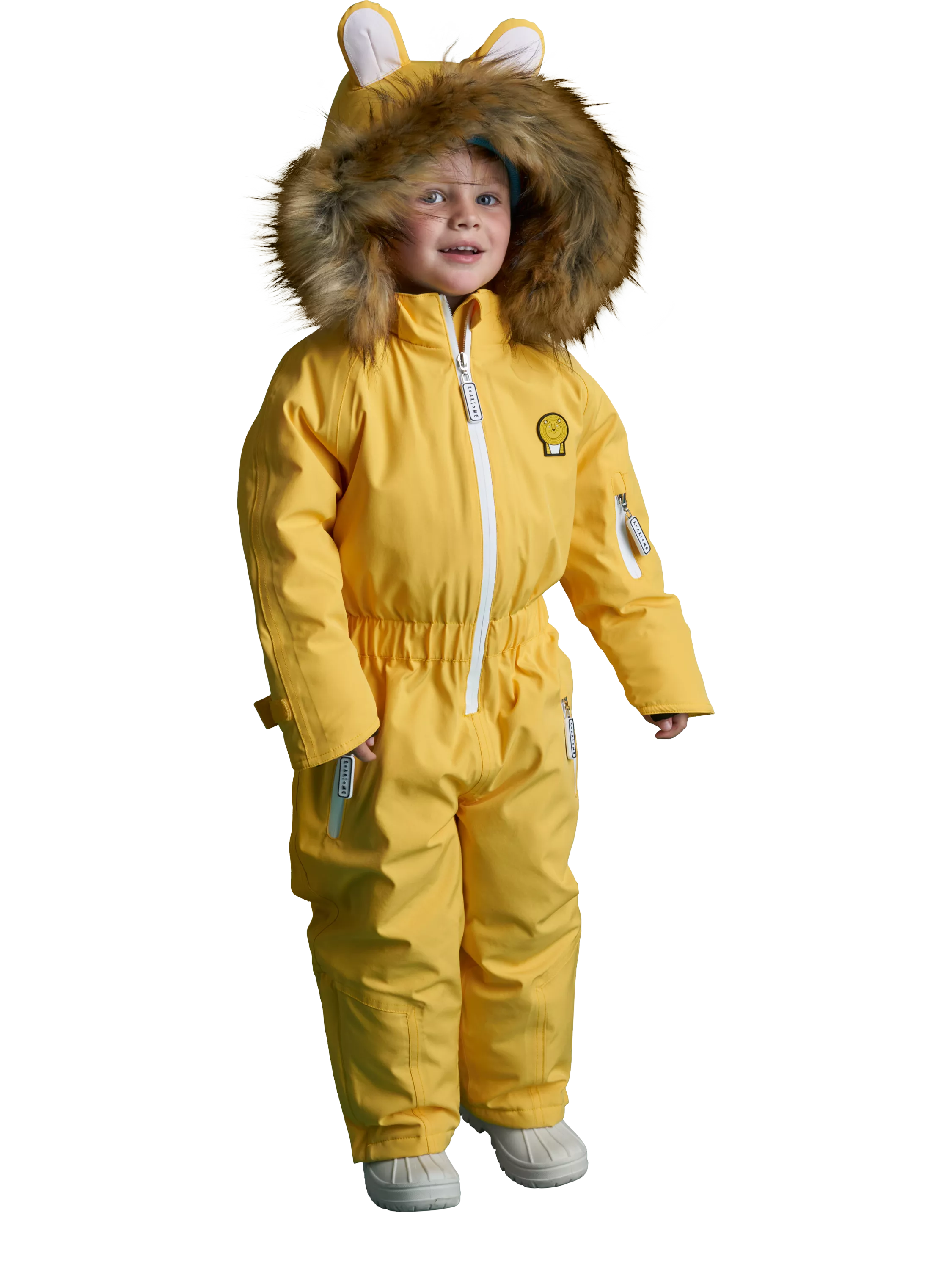 This award winning snowsuit showcases lion ears and a faux fur mane! Totally waterproof, tested to temperatures of -30°C, with taped seams, aqua seal zips and removable hood and faux fur.
