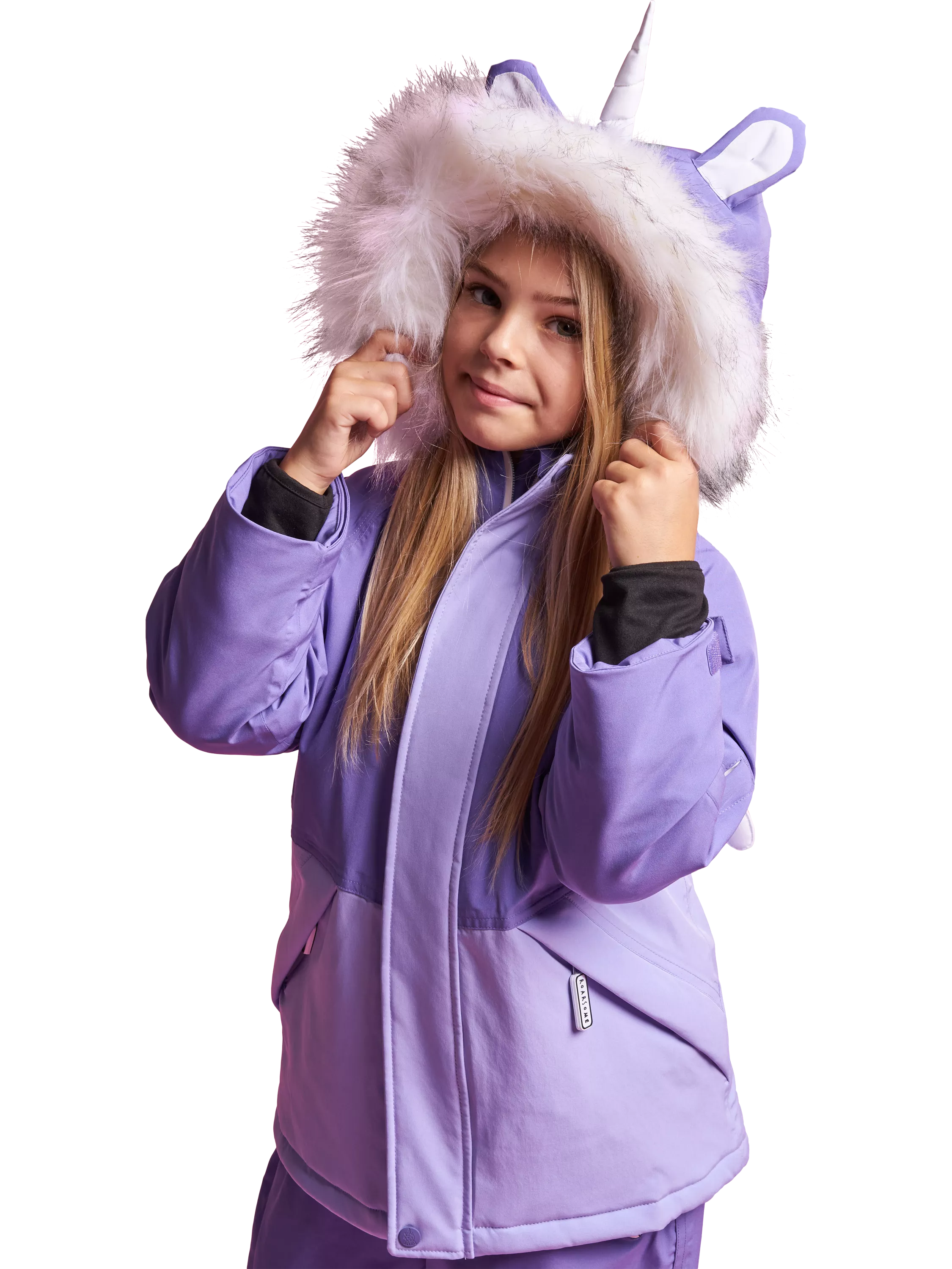 This ski jacket showcases unicorn ears and horn! Totally waterproof, tested to temperatures of -30°C, with taped seams, aqua seal zips and removable hood and faux fur.