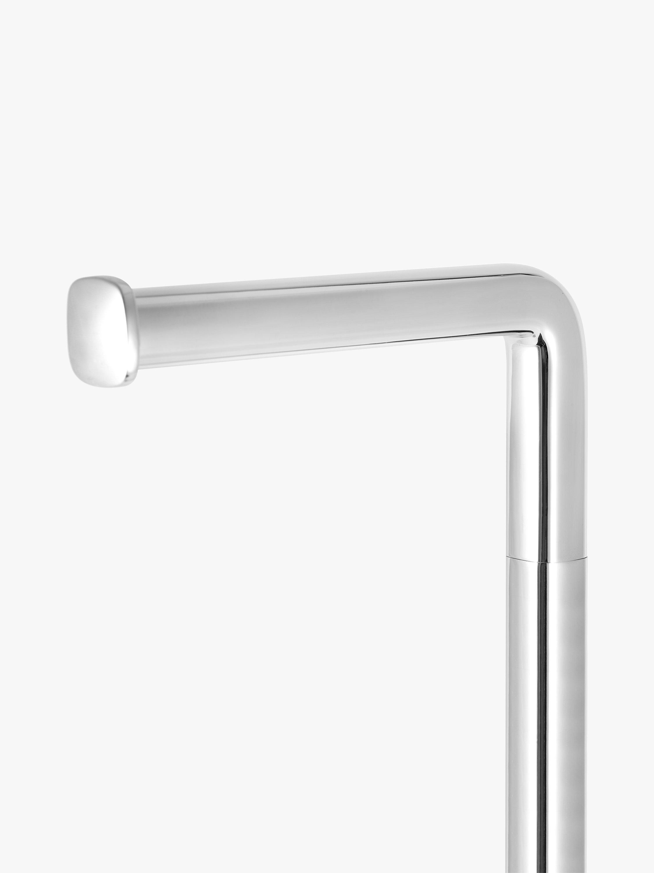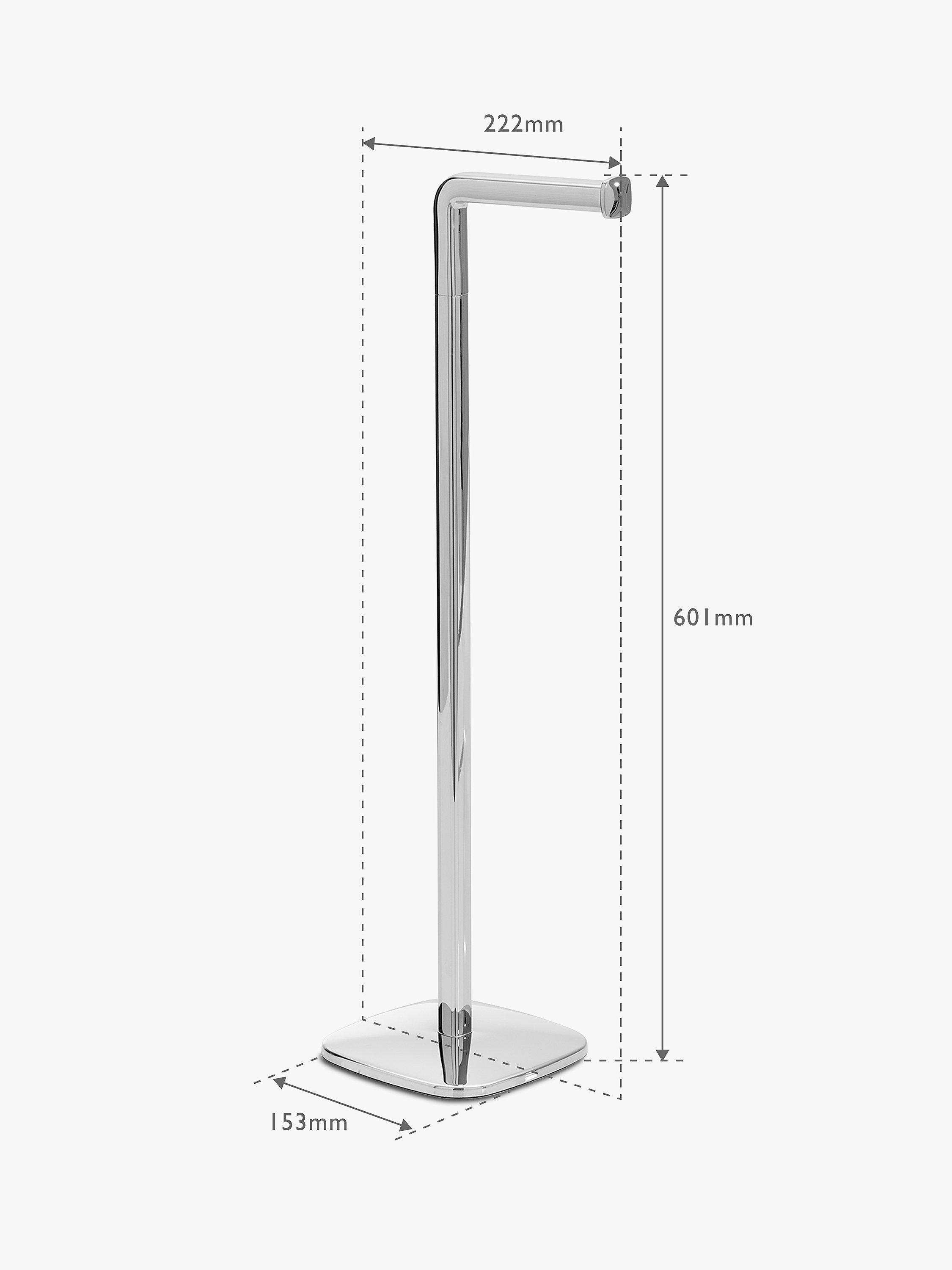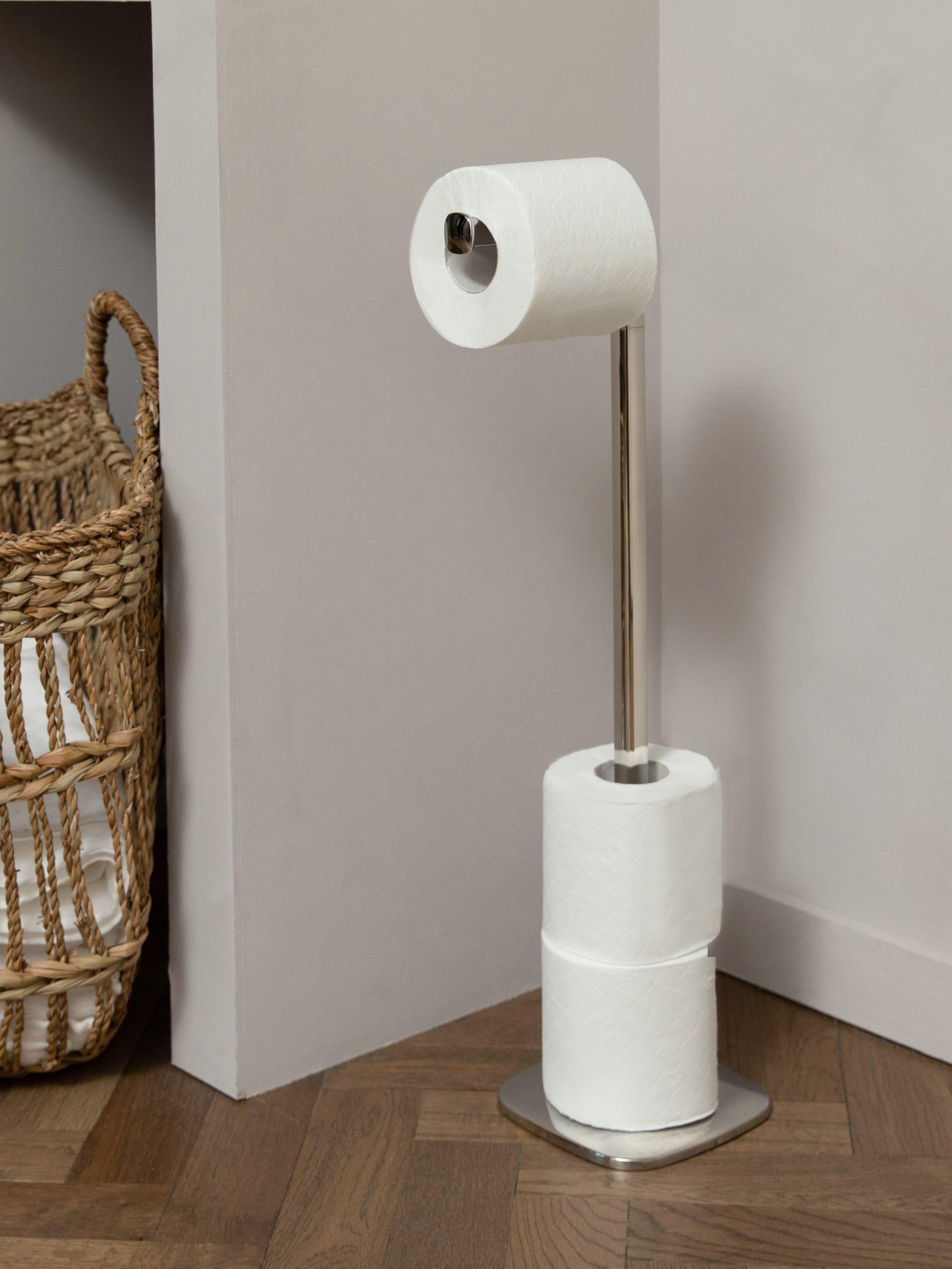 This freestanding butler stores up to 3 toilet rolls in addition to the one in use. The base is weighted for stability and it features a magnetic head assembly for ease of use.