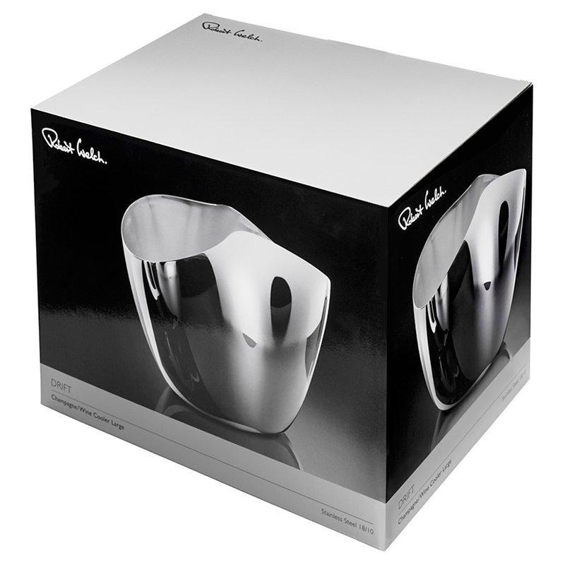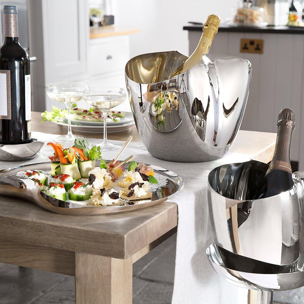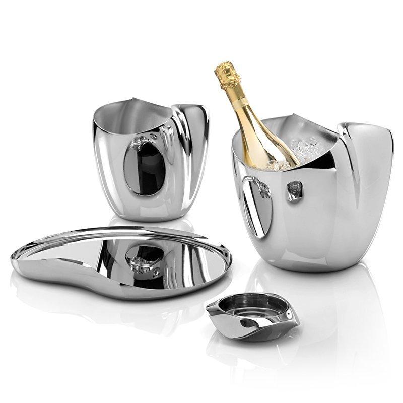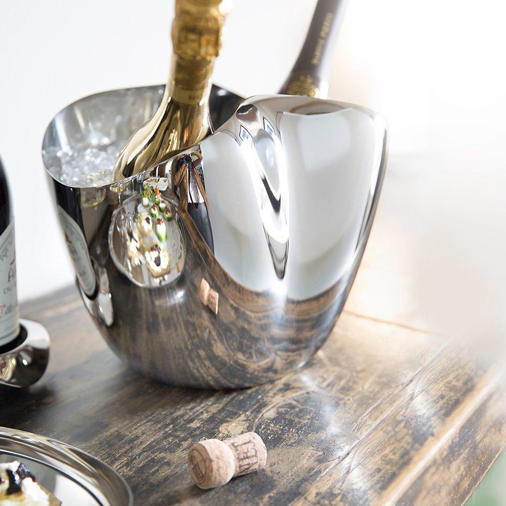 The Drift Champagne / Wine Cooler is generously proportioned to enable ice to fully surround the bottles within. It comfortably holds two champagne bottles or three standard-sized wine bottles. The high-polished surface and undulating shape of the body create dramatic light reflections for a truly distinctive centrepiece.