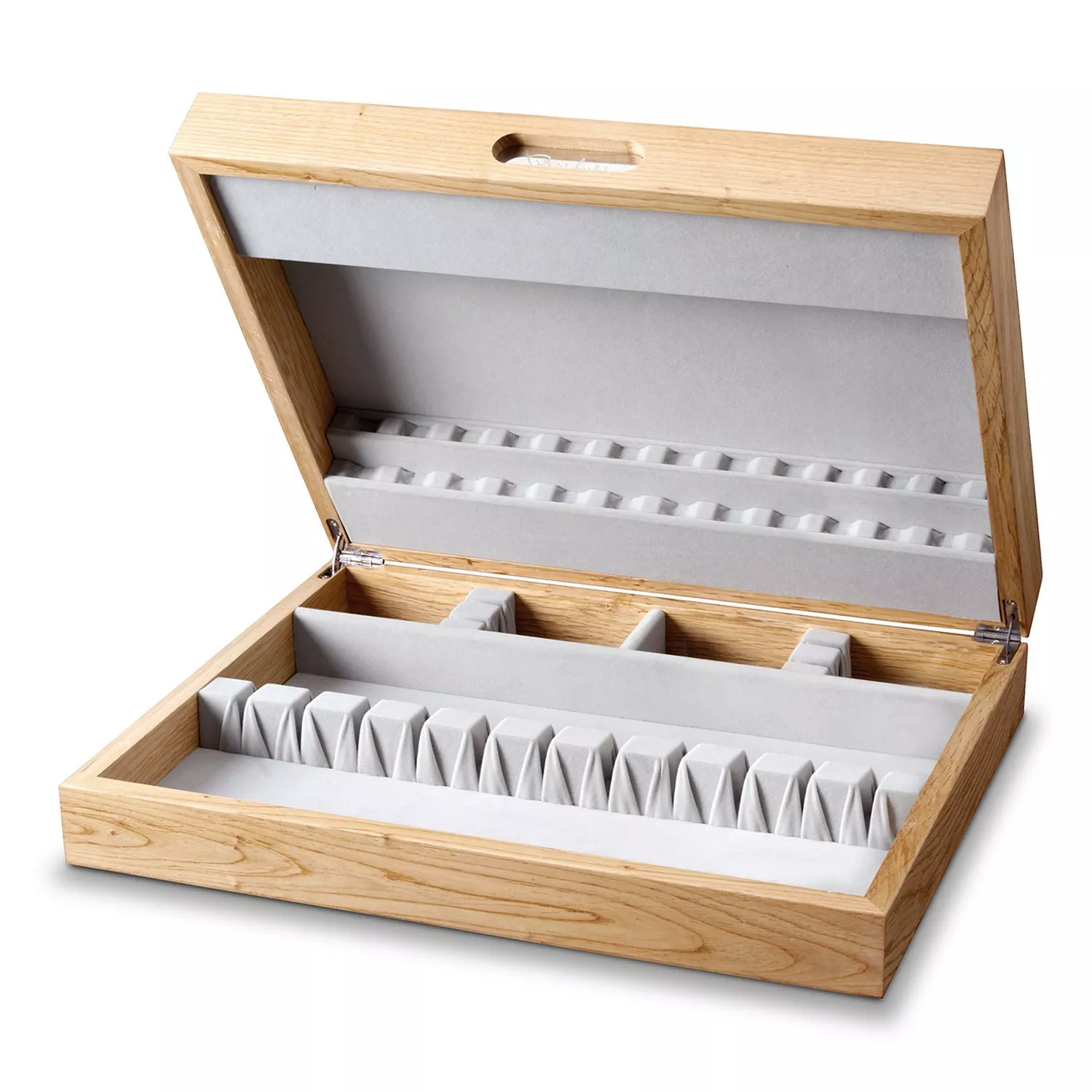 Keep your dinner service organised by presenting them in this chic cutlery canteen, by Robert Welch M.B.E. Crafted from oak, with a grey velvet flock lining, this canteen houses up to 90 pieces, including 12 place settings and 6 serving pieces.