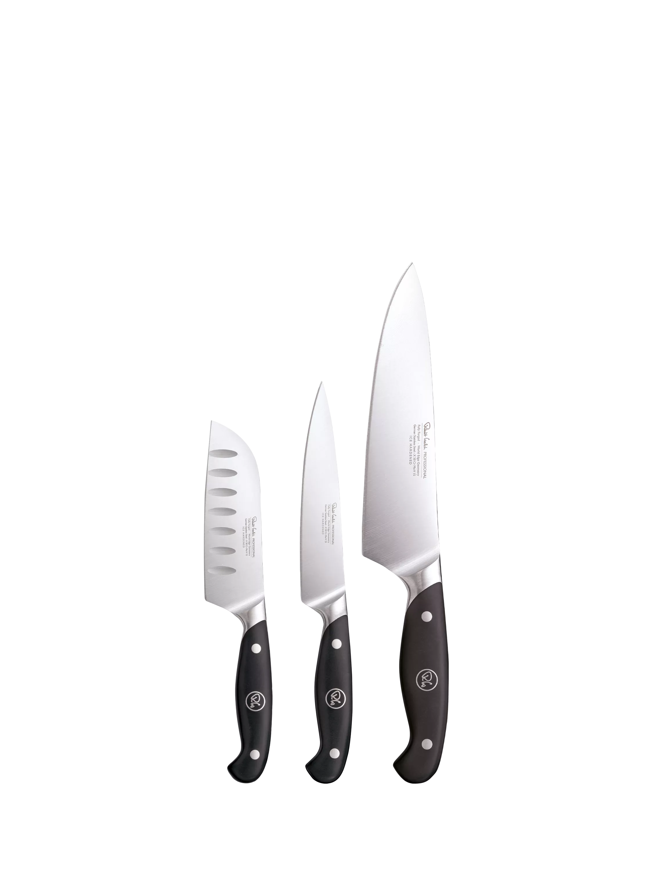 A gift-boxed Robert Welch Professional Home Chef Set of three kitchen knives. Each knife has an ice-hardened stainless-steel blade and a classic handle, perfectly weighted and balanced for comfort and easy cutting and chopping.