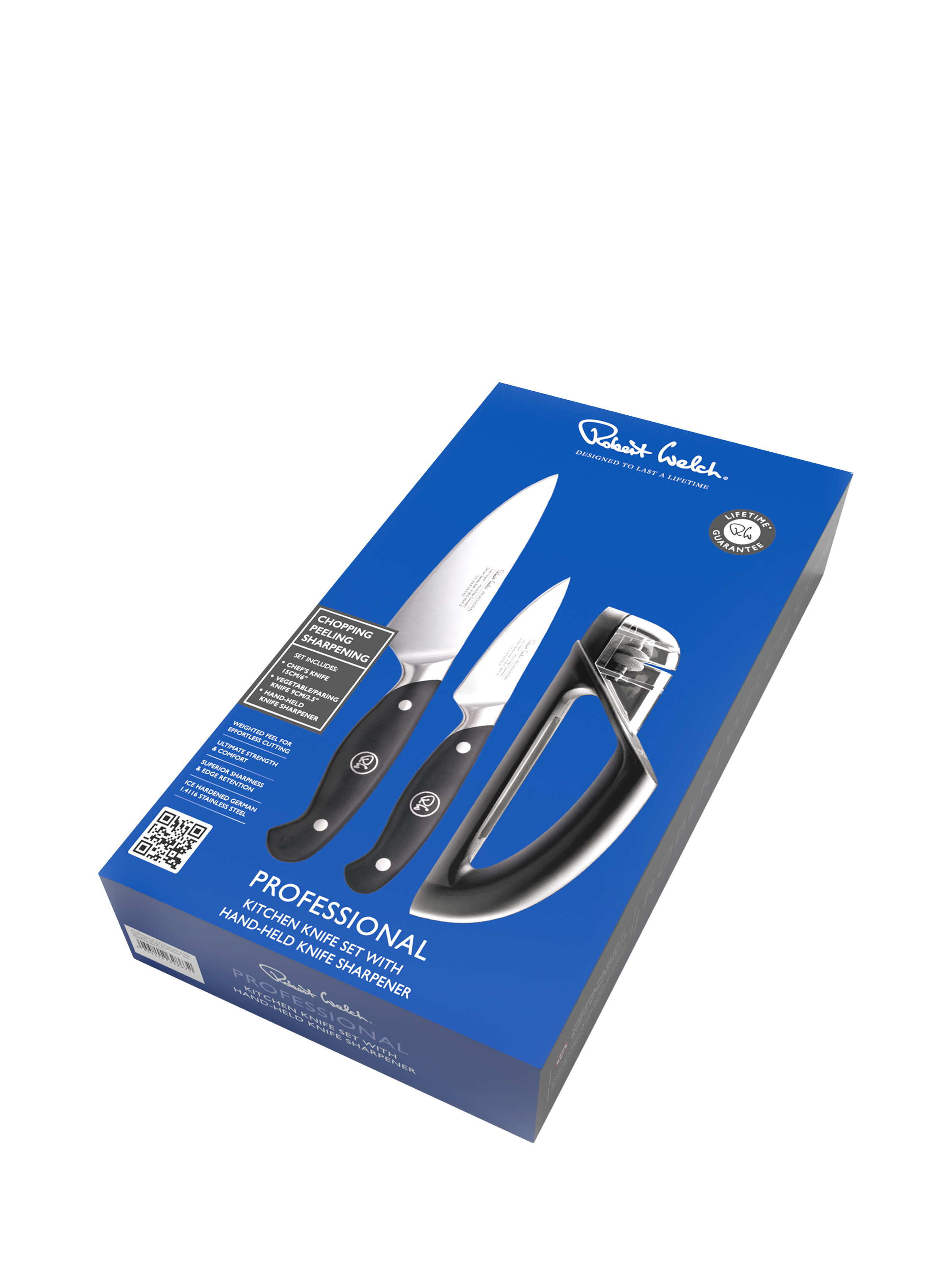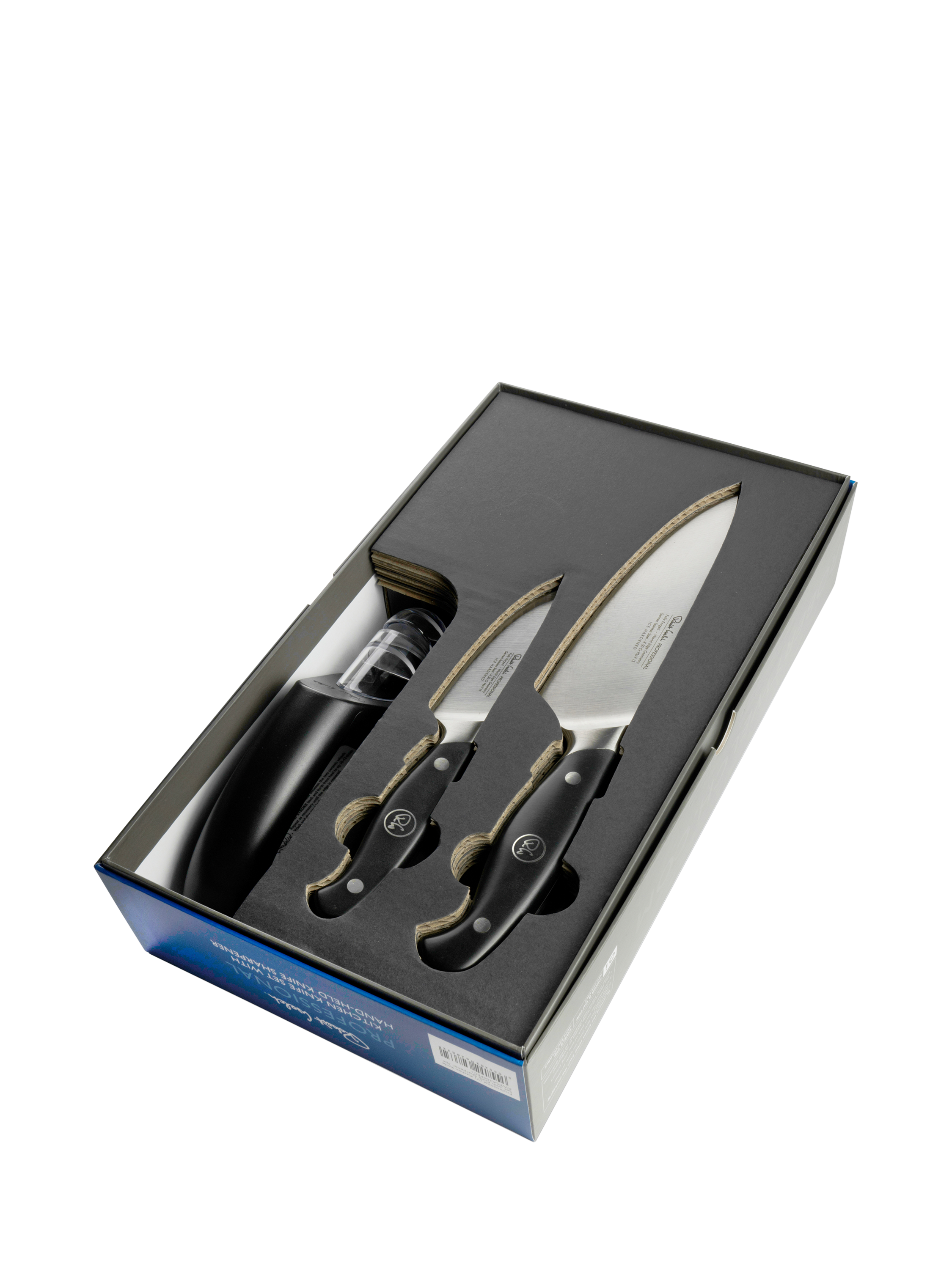 A gift-boxed Robert Welch Professional Kitchen Knife Set with a knife sharpener. Each knife has an ice-hardened stainless-steel blade and a classic handle, perfectly weighted and balanced for comfort and easy cutting and chopping.