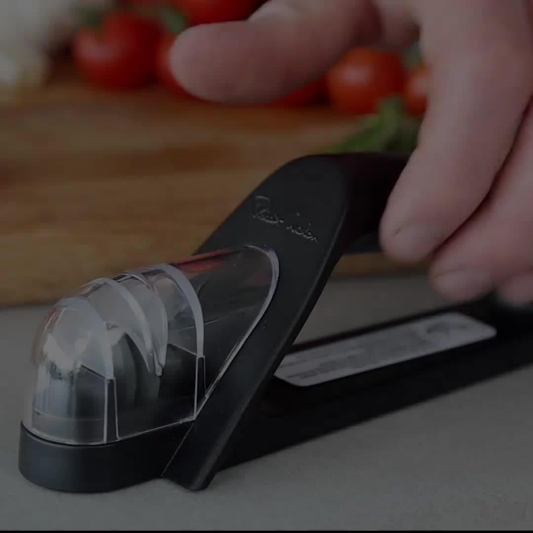 The set includes a 9cm paring knife, perfect for tasks requiring accuracy, such as peeling, trimming, and slicing. The 15cm chef's knife has a curved edge, ideal for chopping, slicing, and dicing. The handheld sharpener can be used right or left-handed and contains a replaceable ceramic sharpening wheel to micro-sharpen and hone your plane-edged kitchen knives. The sharpener is weighted for stability and safety with a non-slip base.