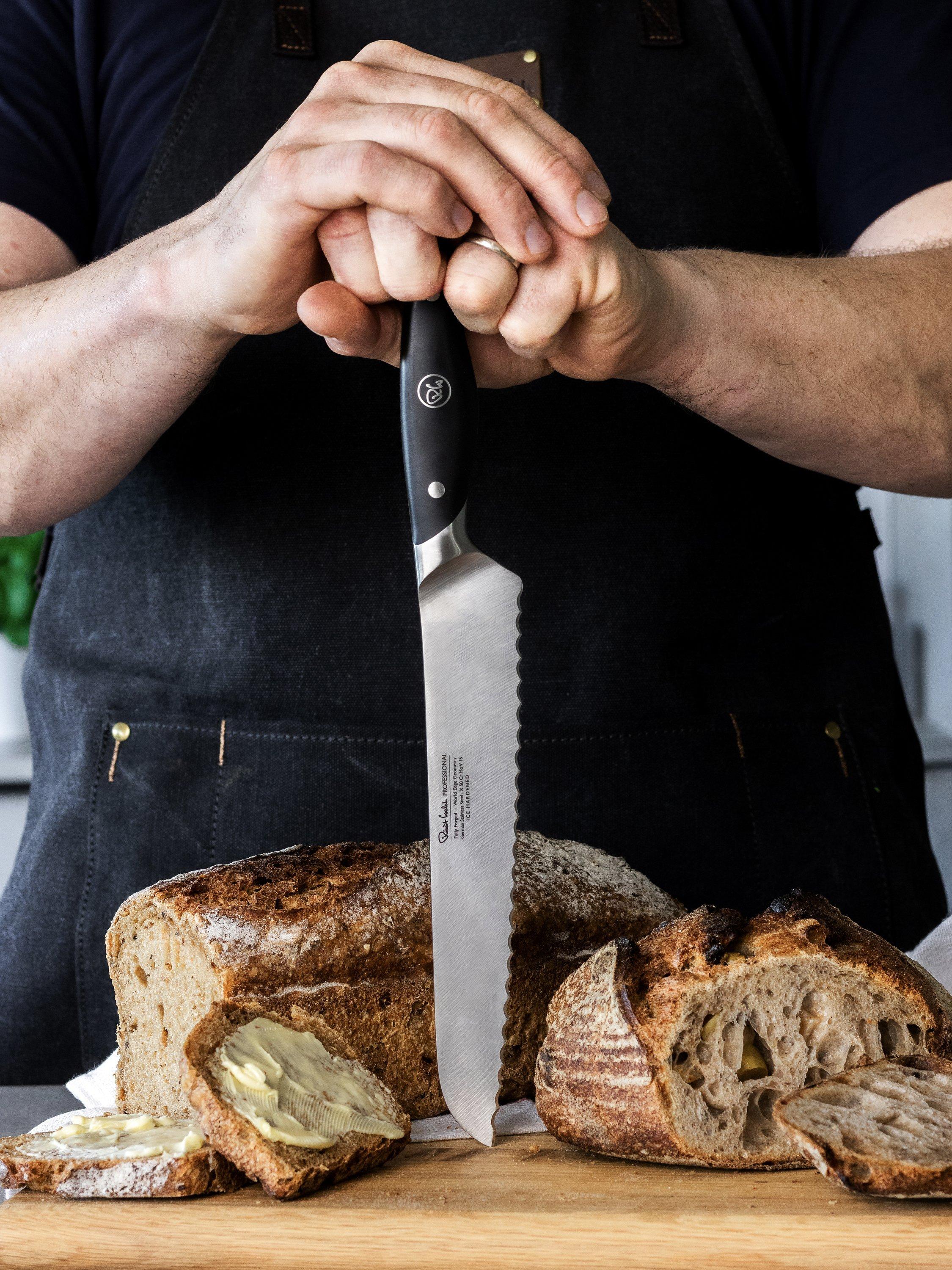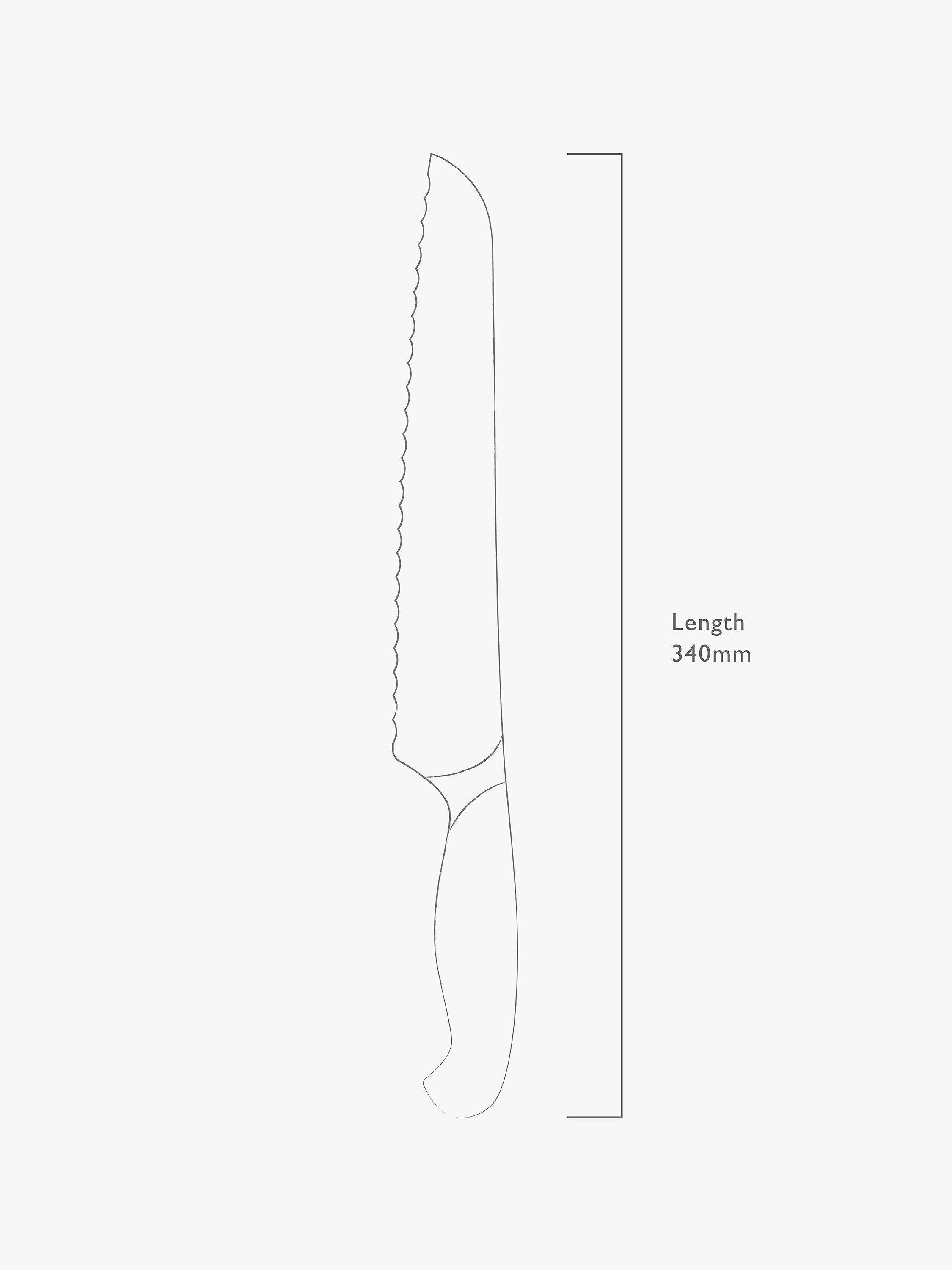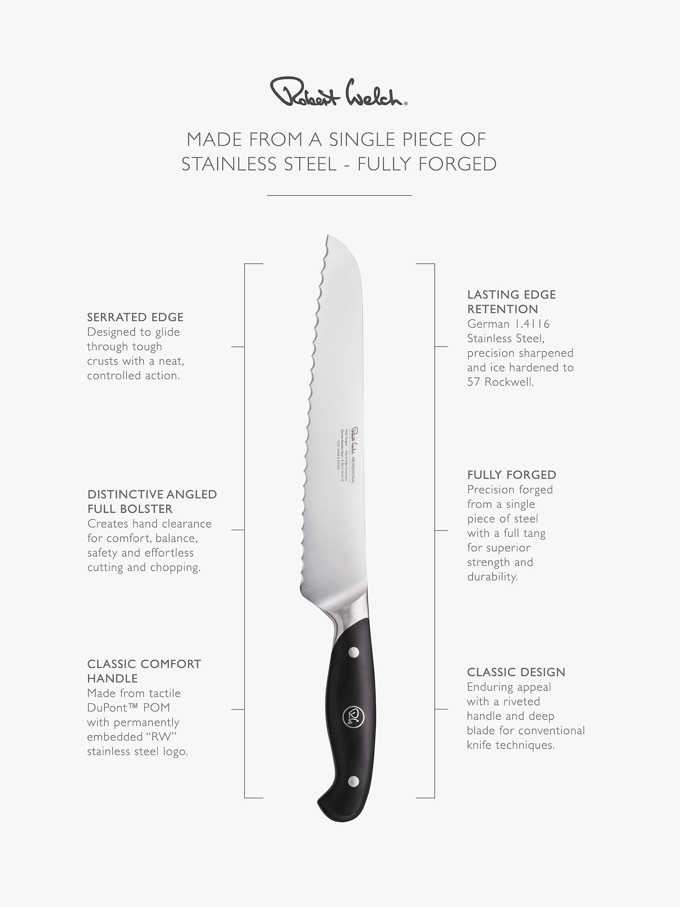 Made from a single piece of stainless steel for durability and strength, this fully forged knife is precision sharpened and completed with a comfortable riveted handle. Designed to glide through tough crusts, this 22cm-blade bread knife has a serrated edge, angled for balance in the hand and effortless cutting.