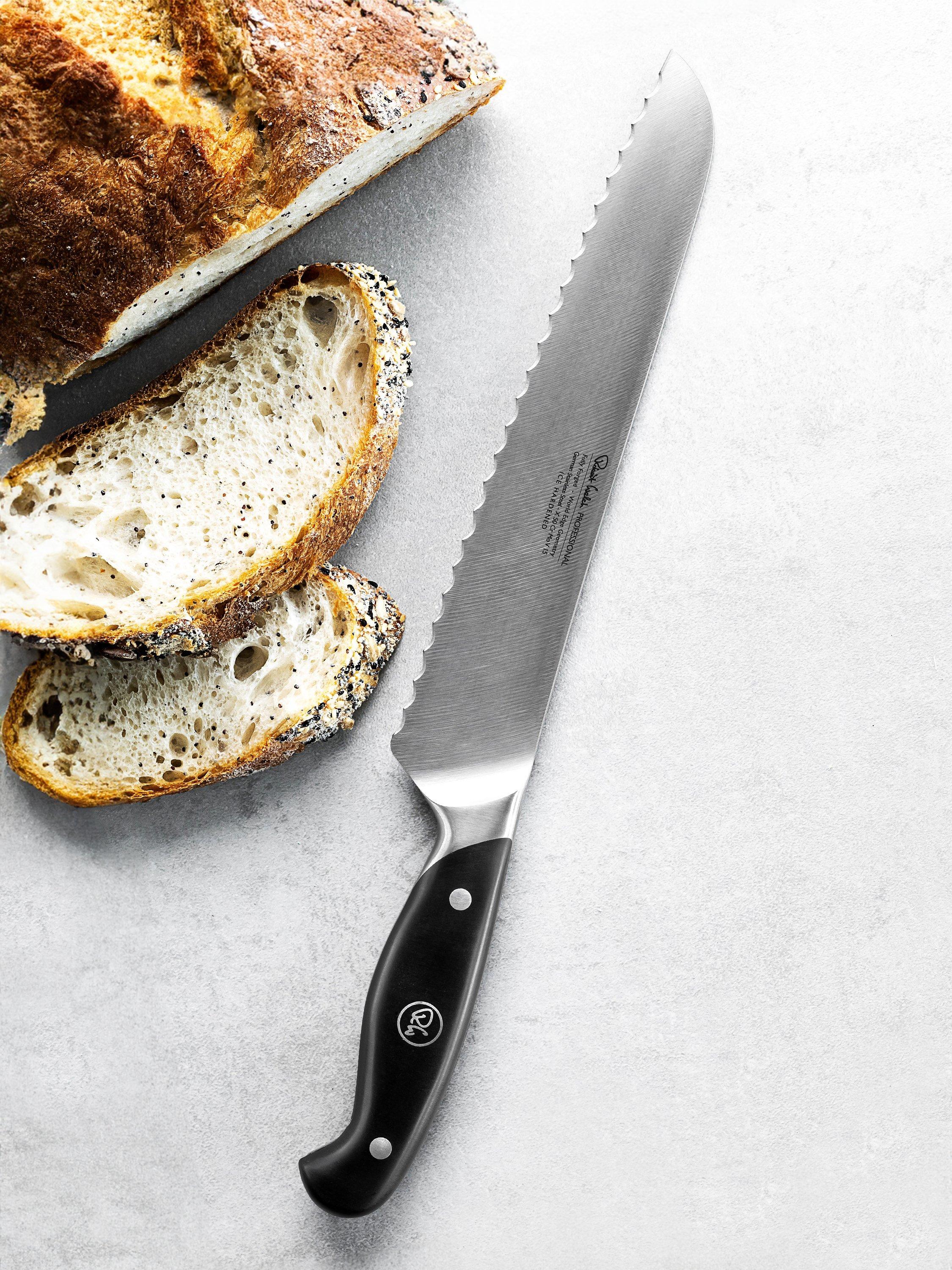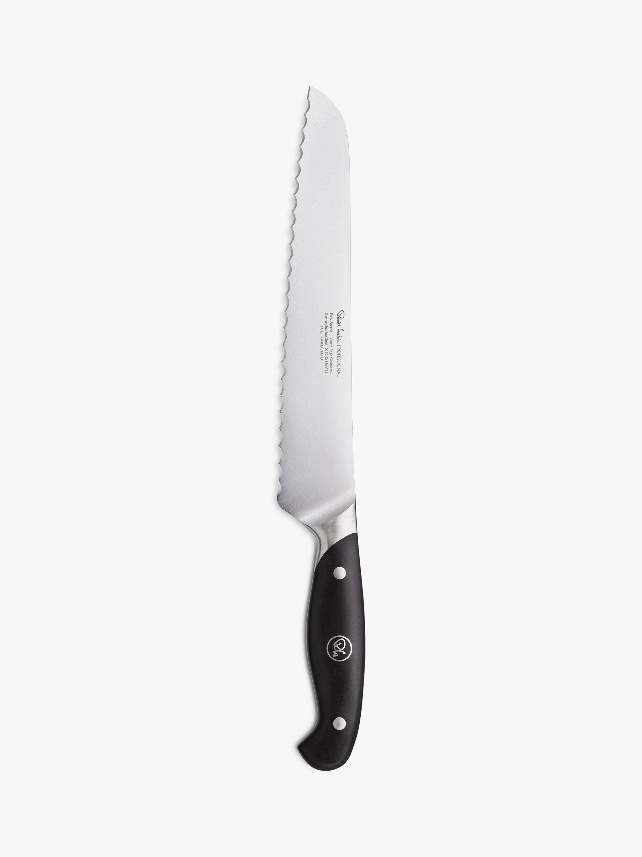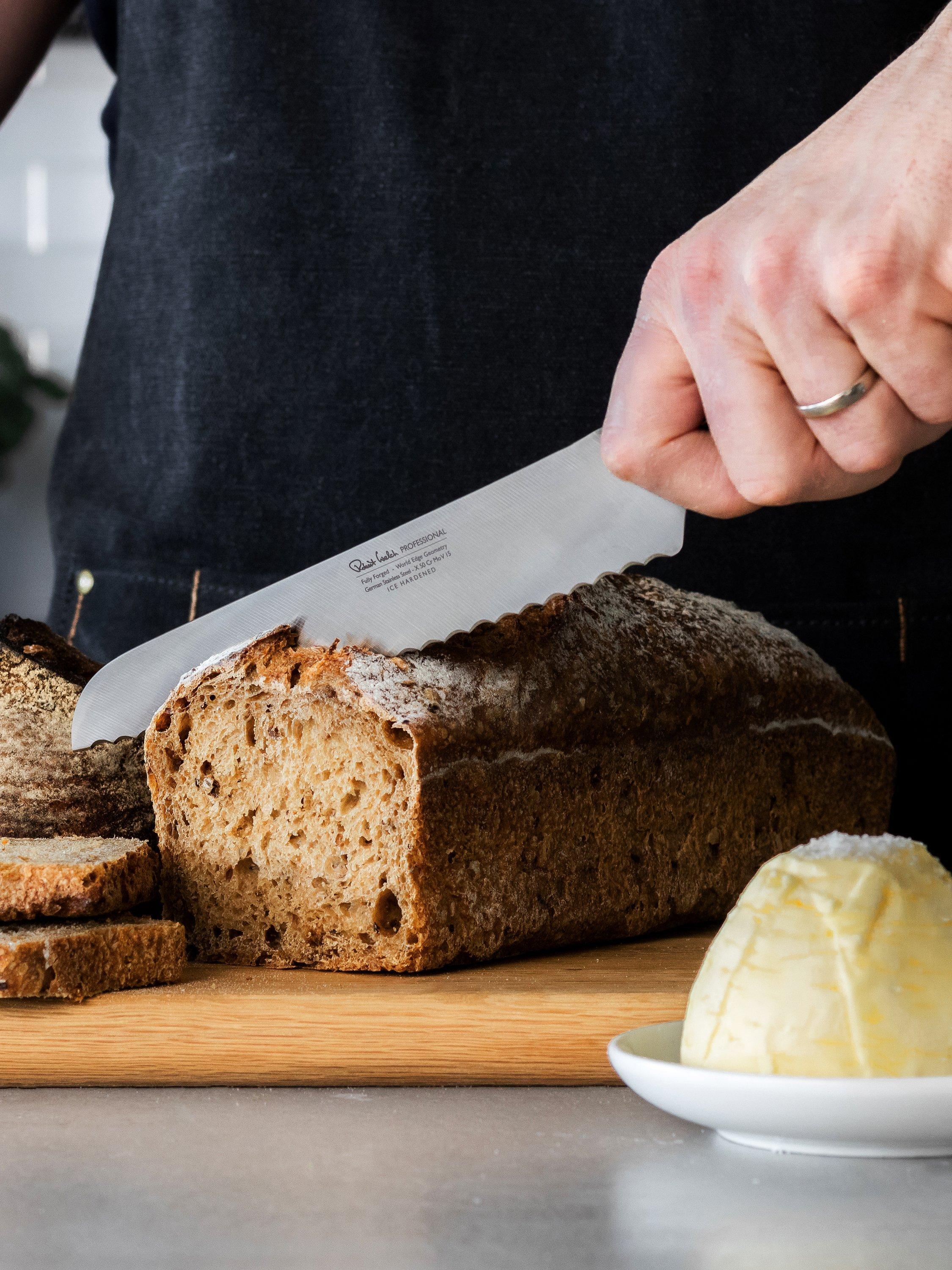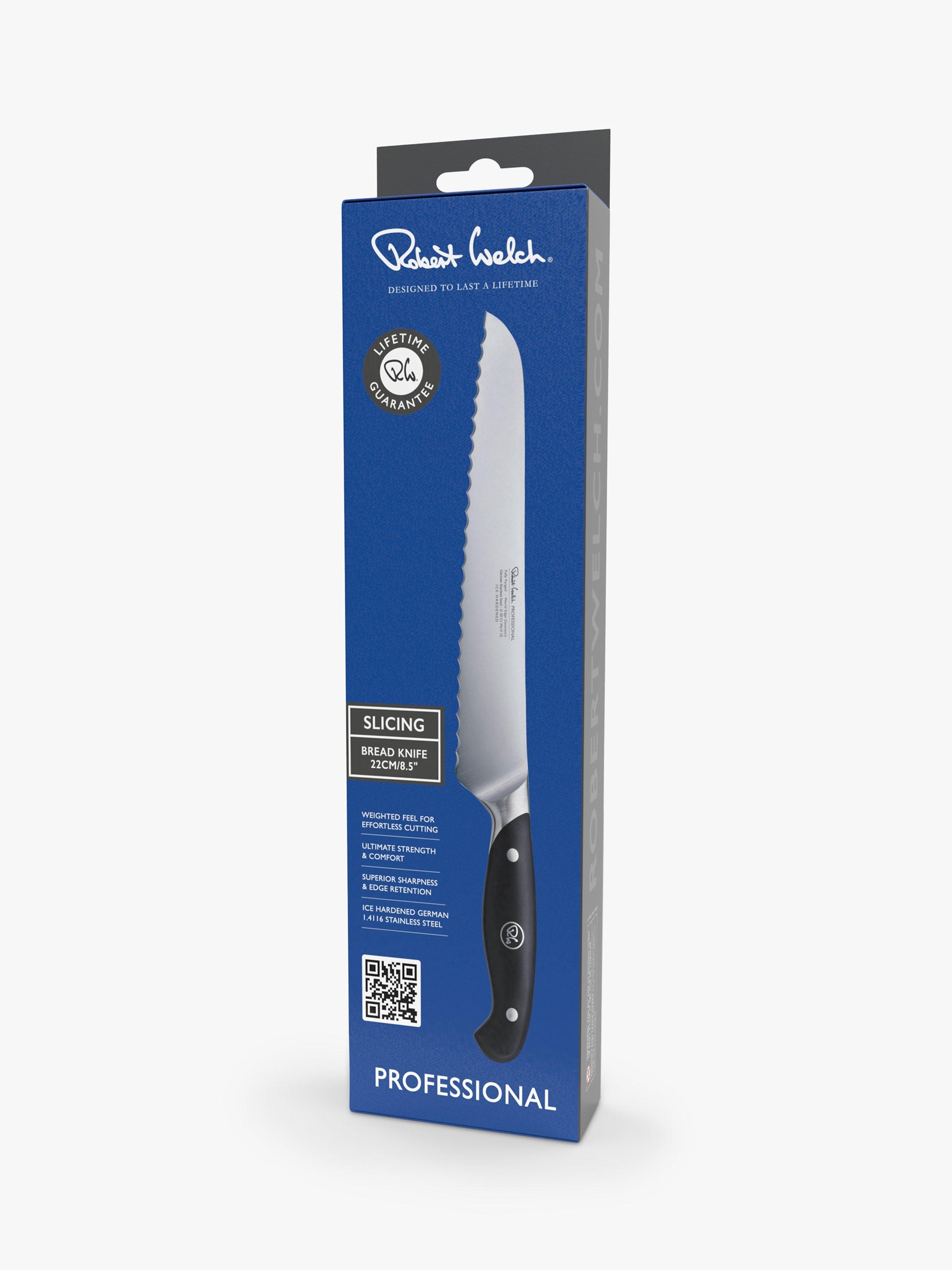 Made from a single piece of stainless steel for durability and strength, this fully forged knife is precision sharpened and completed with a comfortable riveted handle. Designed to glide through tough crusts, this 22cm-blade bread knife has a serrated edge, angled for balance in the hand and effortless cutting.