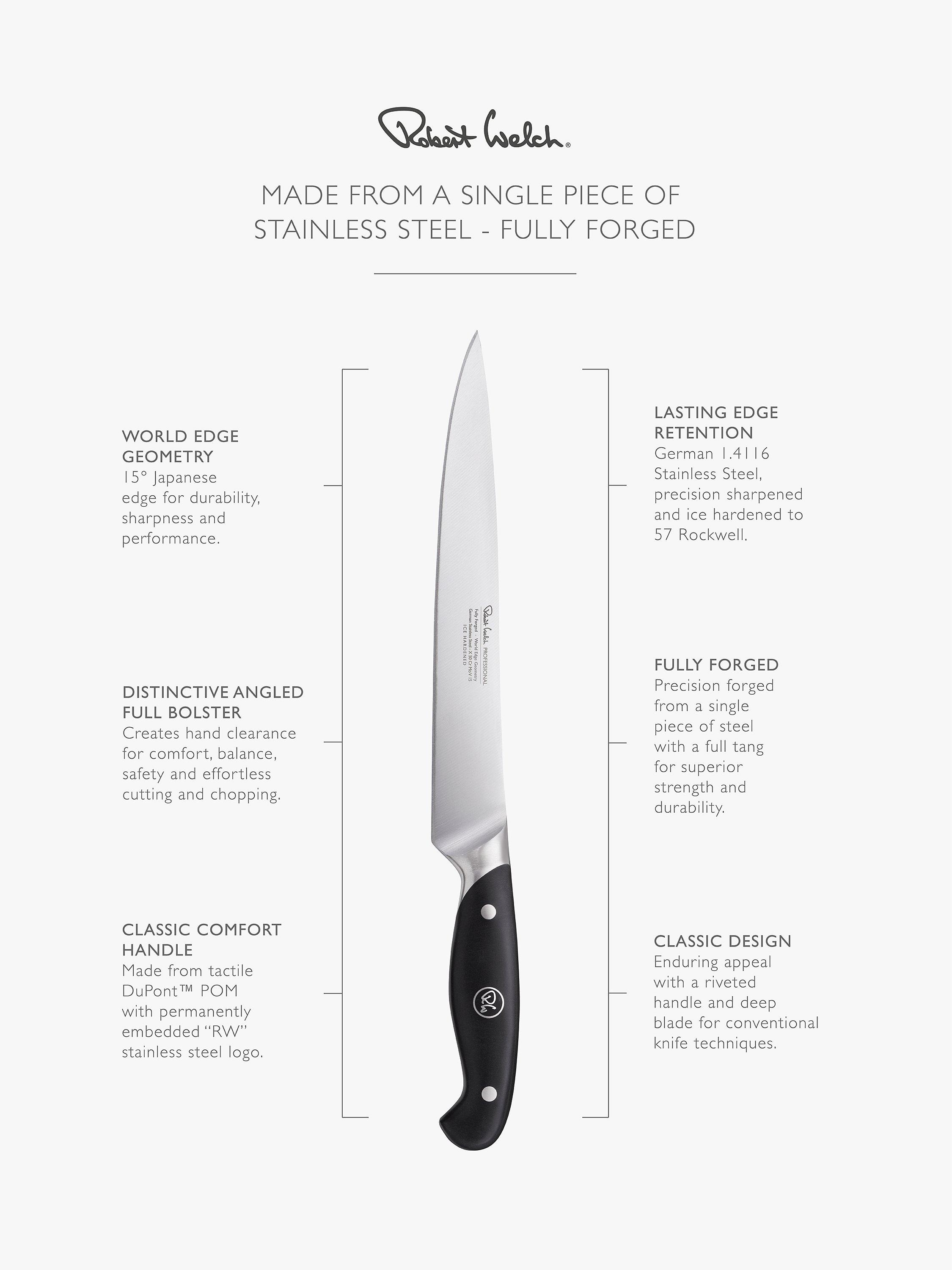Robert Welch Professional is a high-performance knife range designed for heavy use by keen home cooks and professional chefs aiming for culinary excellence.