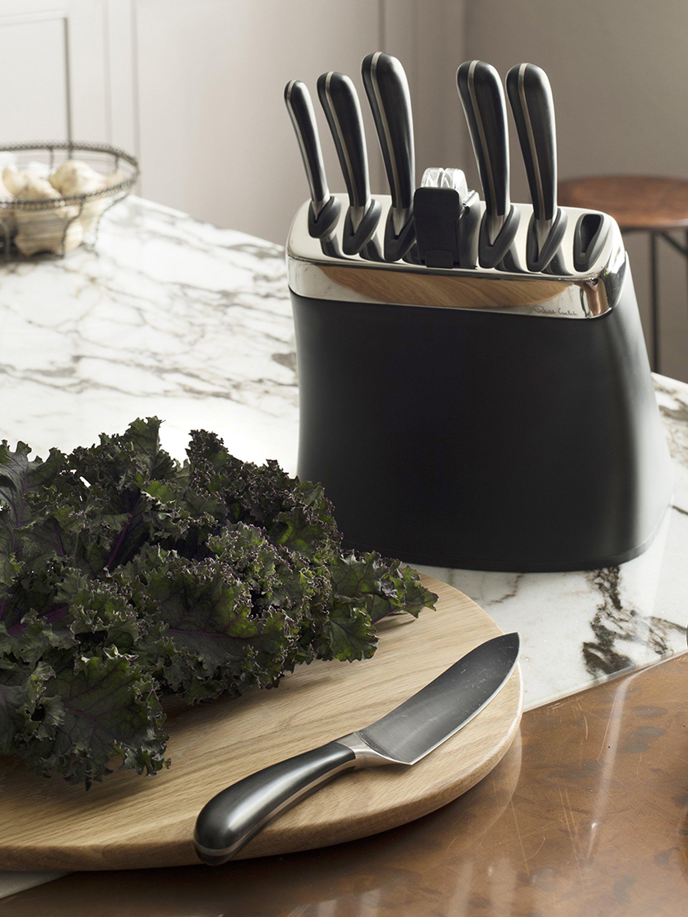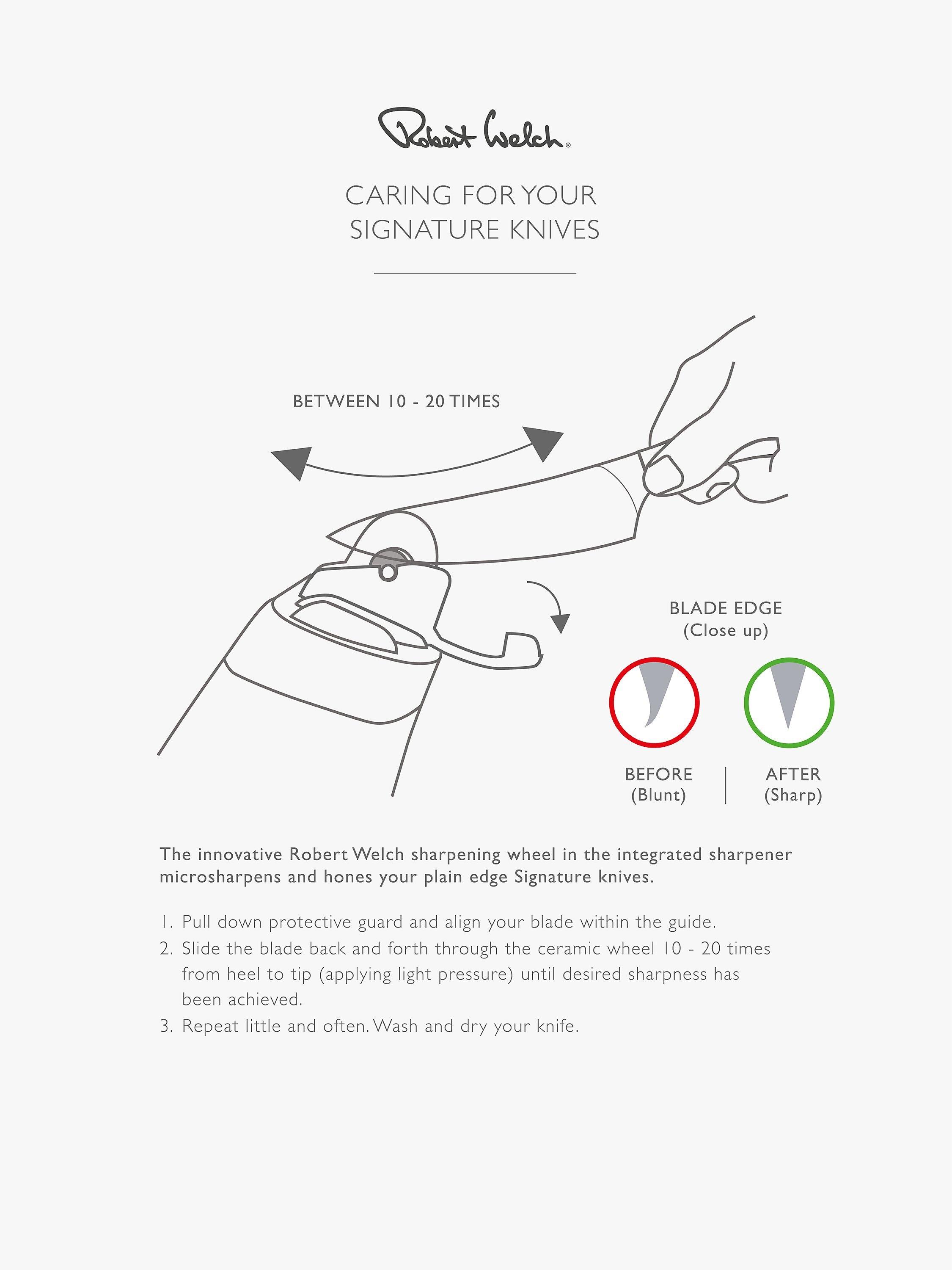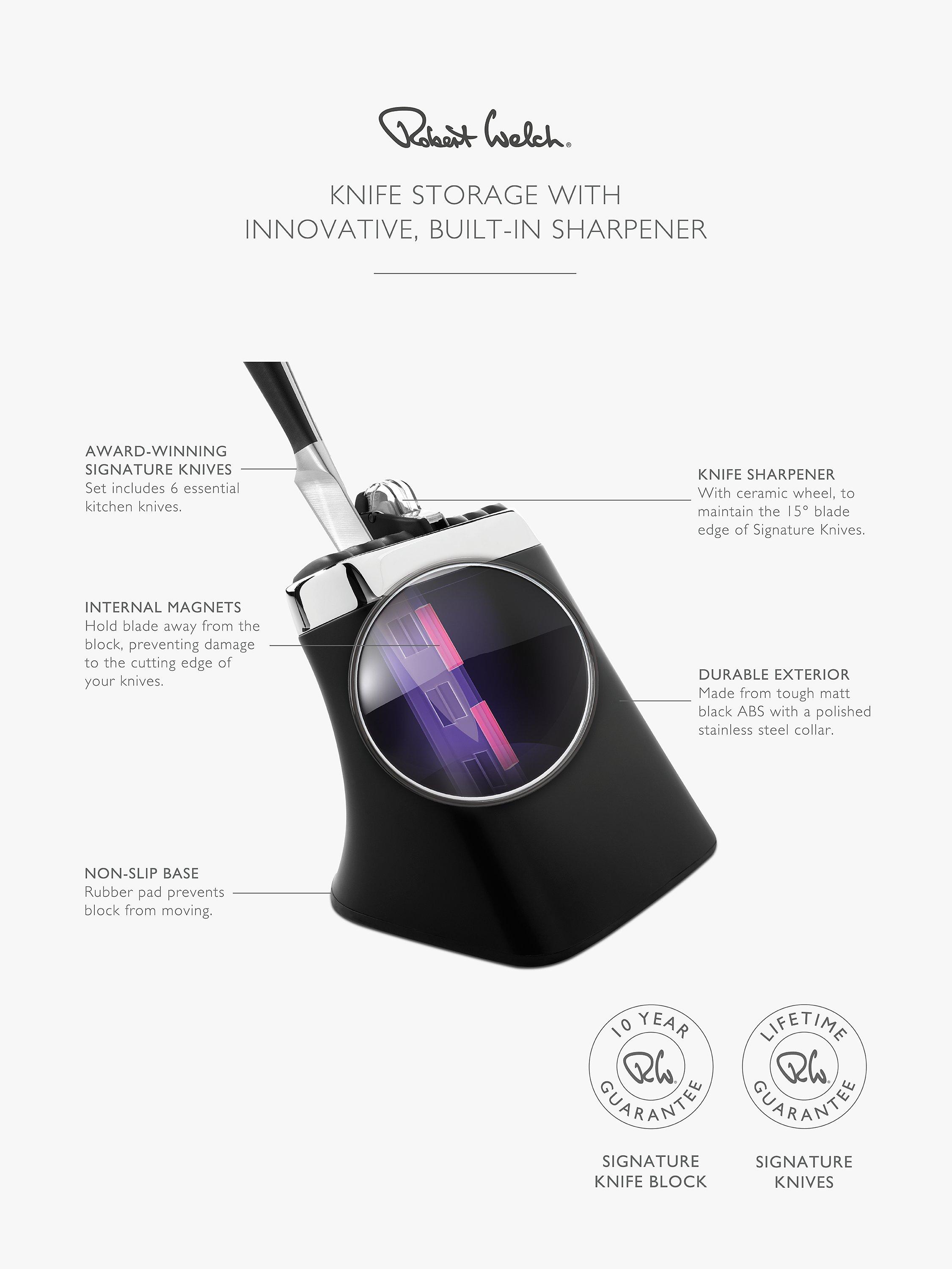 Choosing the right kitchen knife, the best knife for the task at hand, makes preparing a meal easier. Selecting the perfect knife for slicing, dicing or chopping allows you to work with accuracy and cut consistently, which helps food to cook more evenly. The specially hardened, high-quality, German stainless steel used for the Signature knives is durable, easy to clean and maintain. The Robert Welch Signature knife is a precision tool, hand-honed and sharpened by master craftsmen to give you many years of optimum use. Robert Welch have worked with professional chefs to develop a range of knives that give you comfort in the hand and the optimum cutting action. Each knife has been individually constructed for its specific task in food preparation. The handles and blades are set at the best angle to minimise fatigue. The knife block with sharpener has a 10-year guarantee and the knives have a lifetime guarantee.
