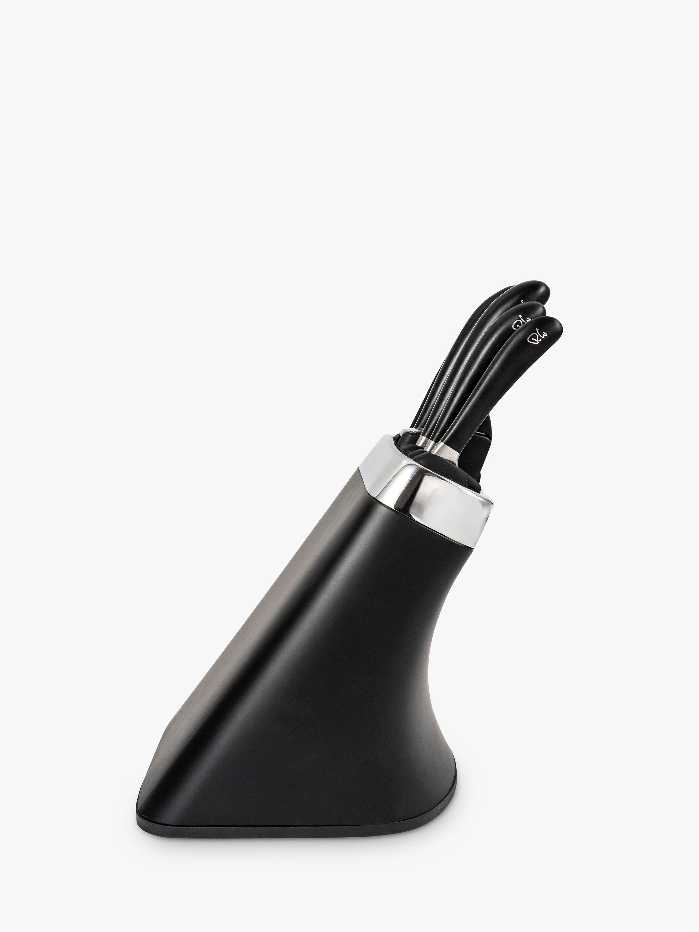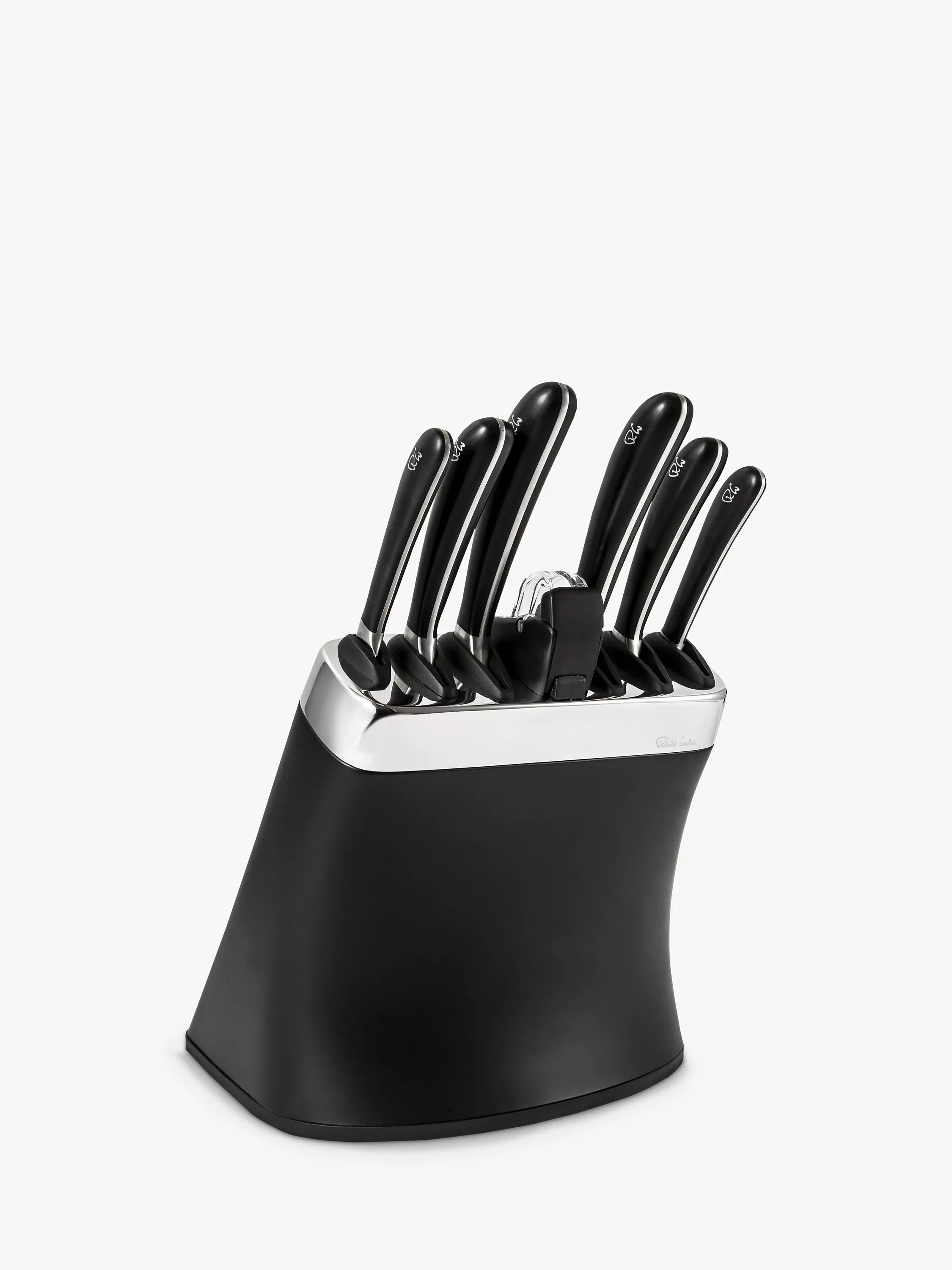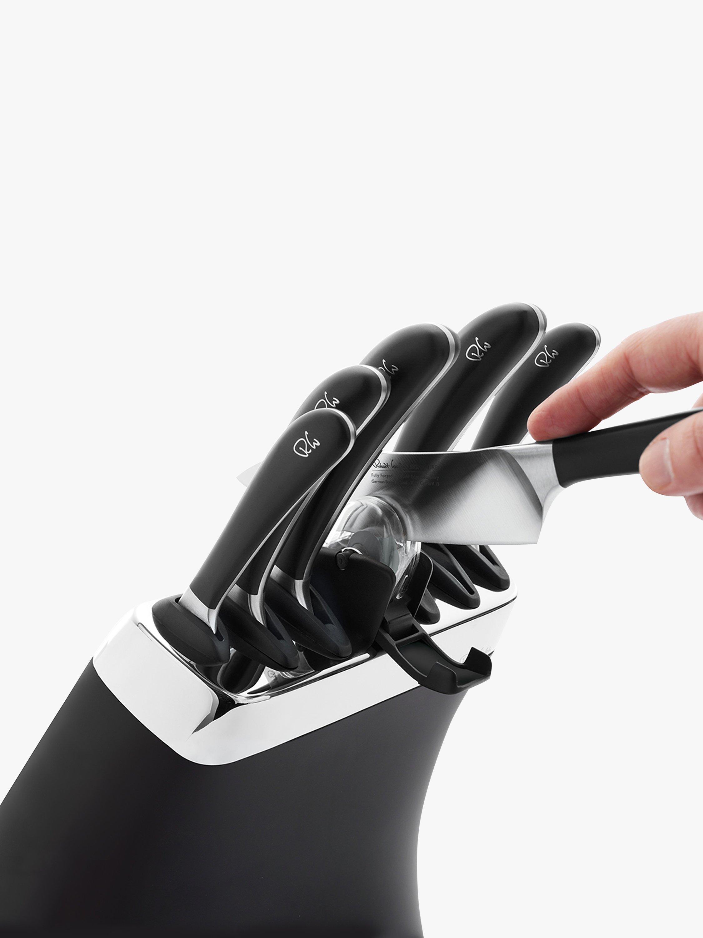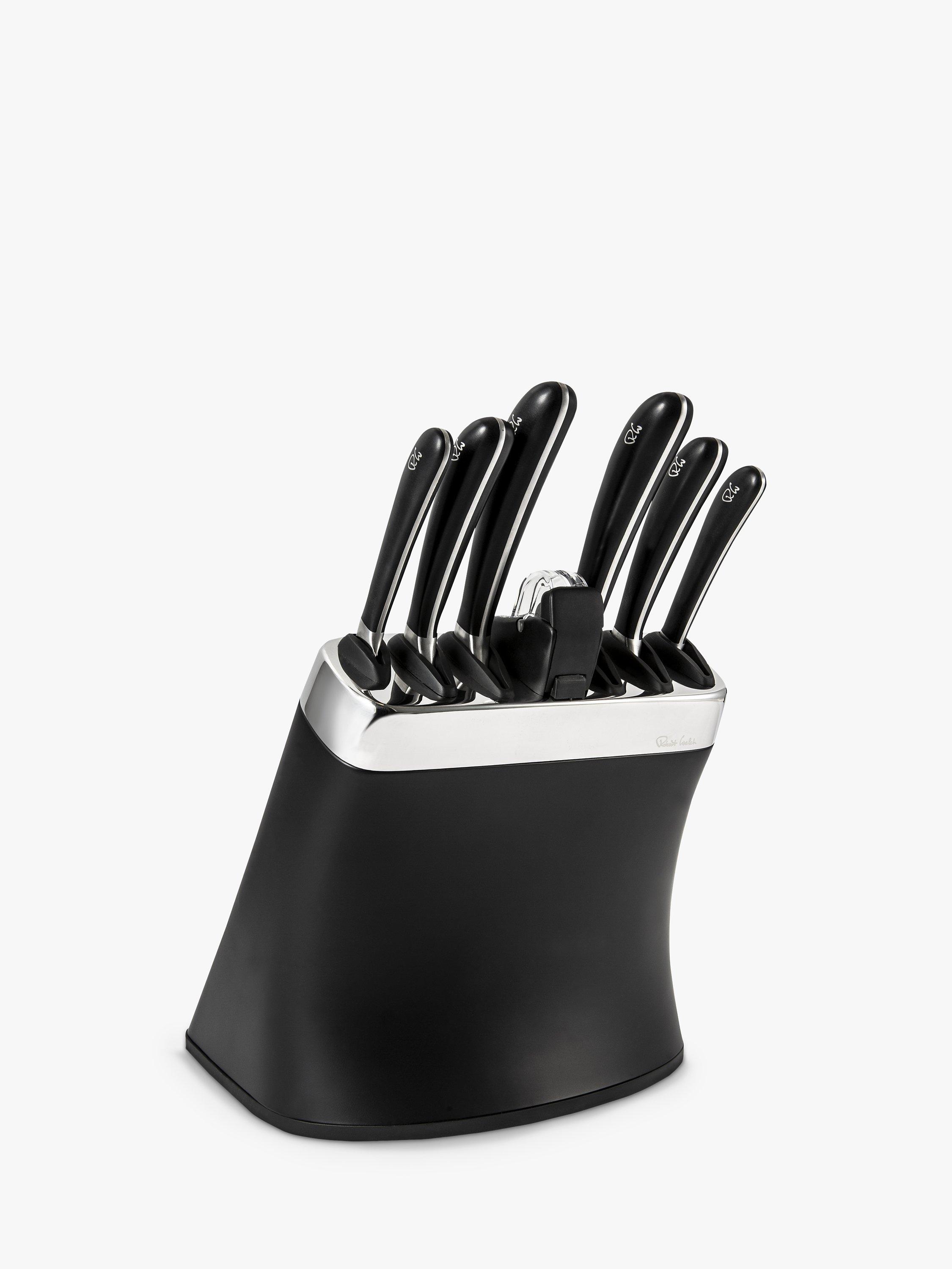 Choosing the right kitchen knife, the best knife for the task at hand, makes preparing a meal easier. Selecting the perfect knife for slicing, dicing or chopping allows you to work with accuracy and cut consistently, which helps food to cook more evenly. The specially hardened, high-quality, German stainless steel used for the Signature knives is durable, easy to clean and maintain. The Robert Welch Signature knife is a precision tool, hand-honed and sharpened by master craftsmen to give you many years of optimum use. Robert Welch have worked with professional chefs to develop a range of knives that give you comfort in the hand and the optimum cutting action. Each knife has been individually constructed for its specific task in food preparation. The handles and blades are set at the best angle to minimise fatigue. The knife block with sharpener has a 10-year guarantee and the knives have a lifetime guarantee.