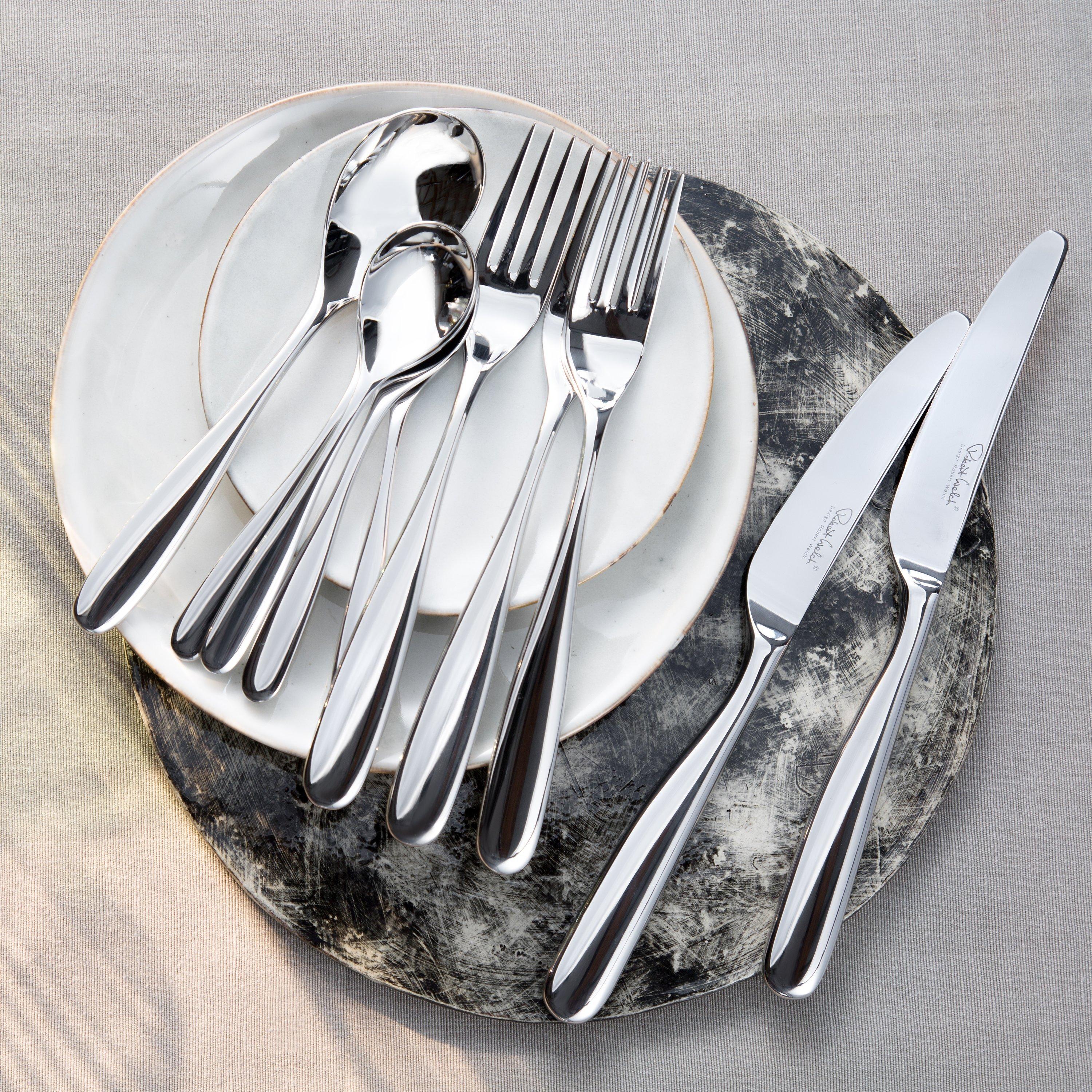 The modelled, curved lines and heavy gauge solid handle of this Robert Welch Stanton table knife create an image of beauty and sculpture. Dishwasher safe, the knife has been stamped from a single sheet of 13/0 stainless steel, up to 5.5mm thick. This knife is forged from specially hardened stainless steel for precise slicing.