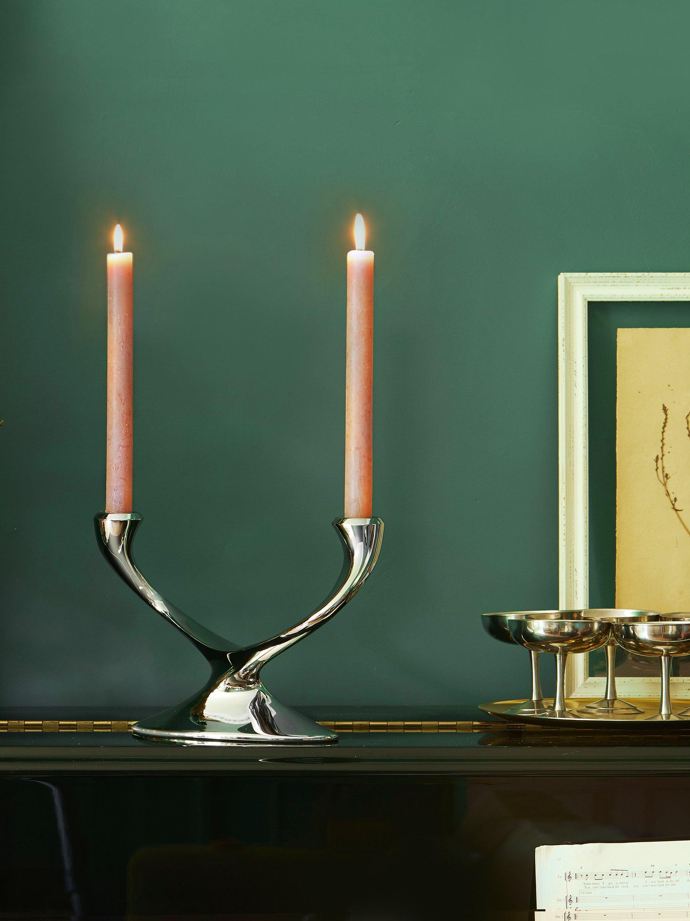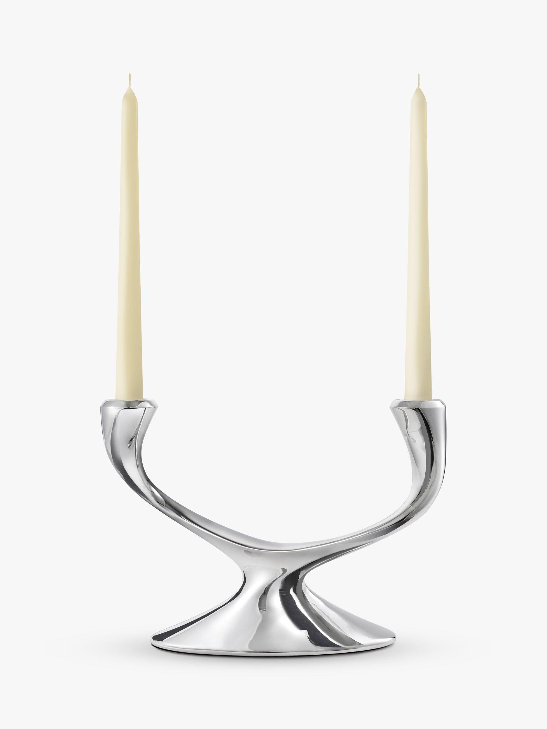 Hand-polished candelabrum for two candles from the Windrush range by Robert Welch, expertly made from the highest quality 18/10-grade stainless steel with a mirror-polished finish.