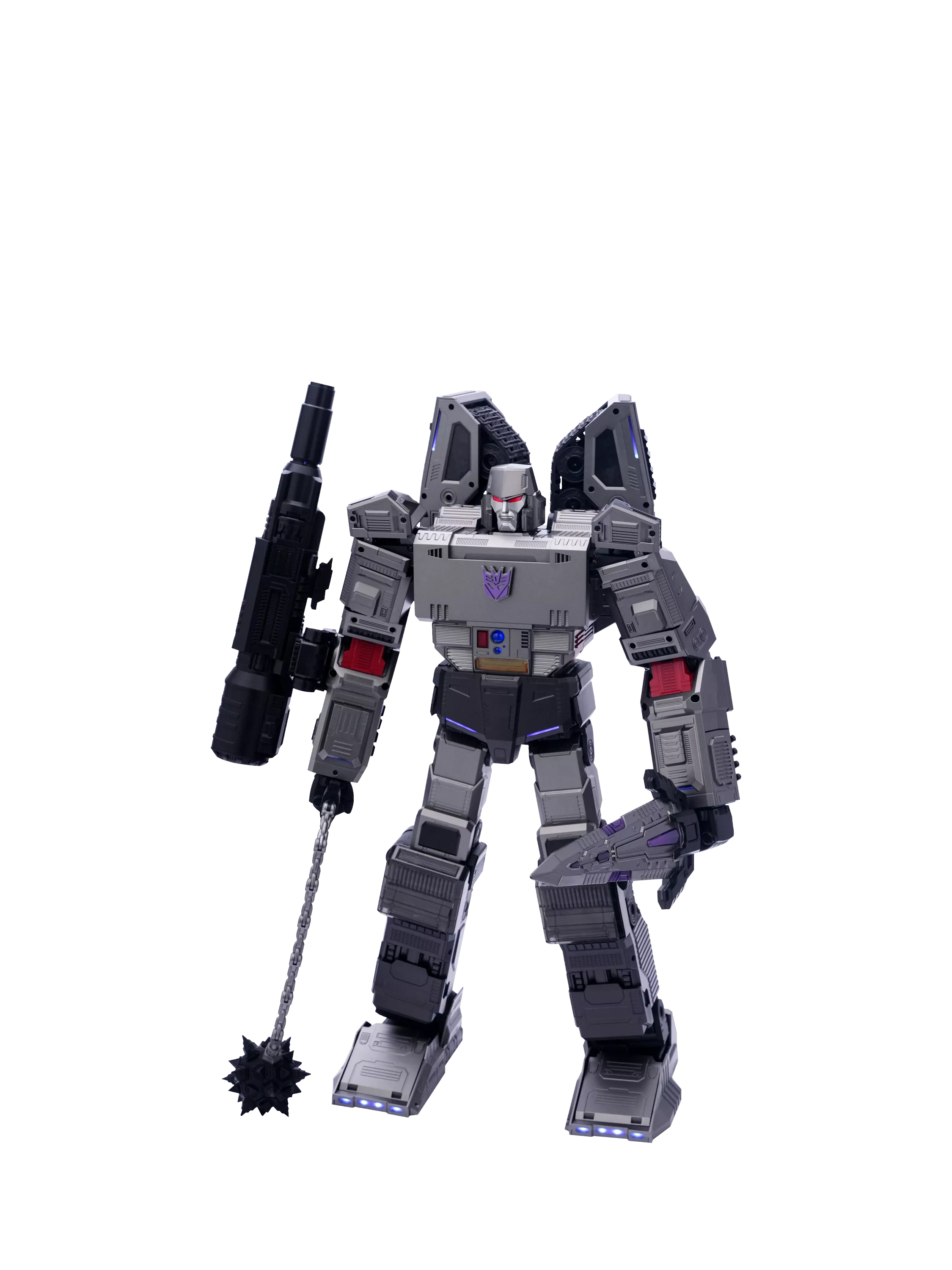 Equipped with 112 ultra-bright LED lights, illuminating Megatron with stunning blue and violet accents throughout, for the most realistic and authentic looking Decepticon leader on the market.